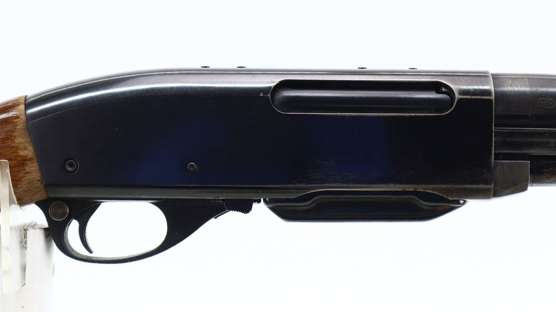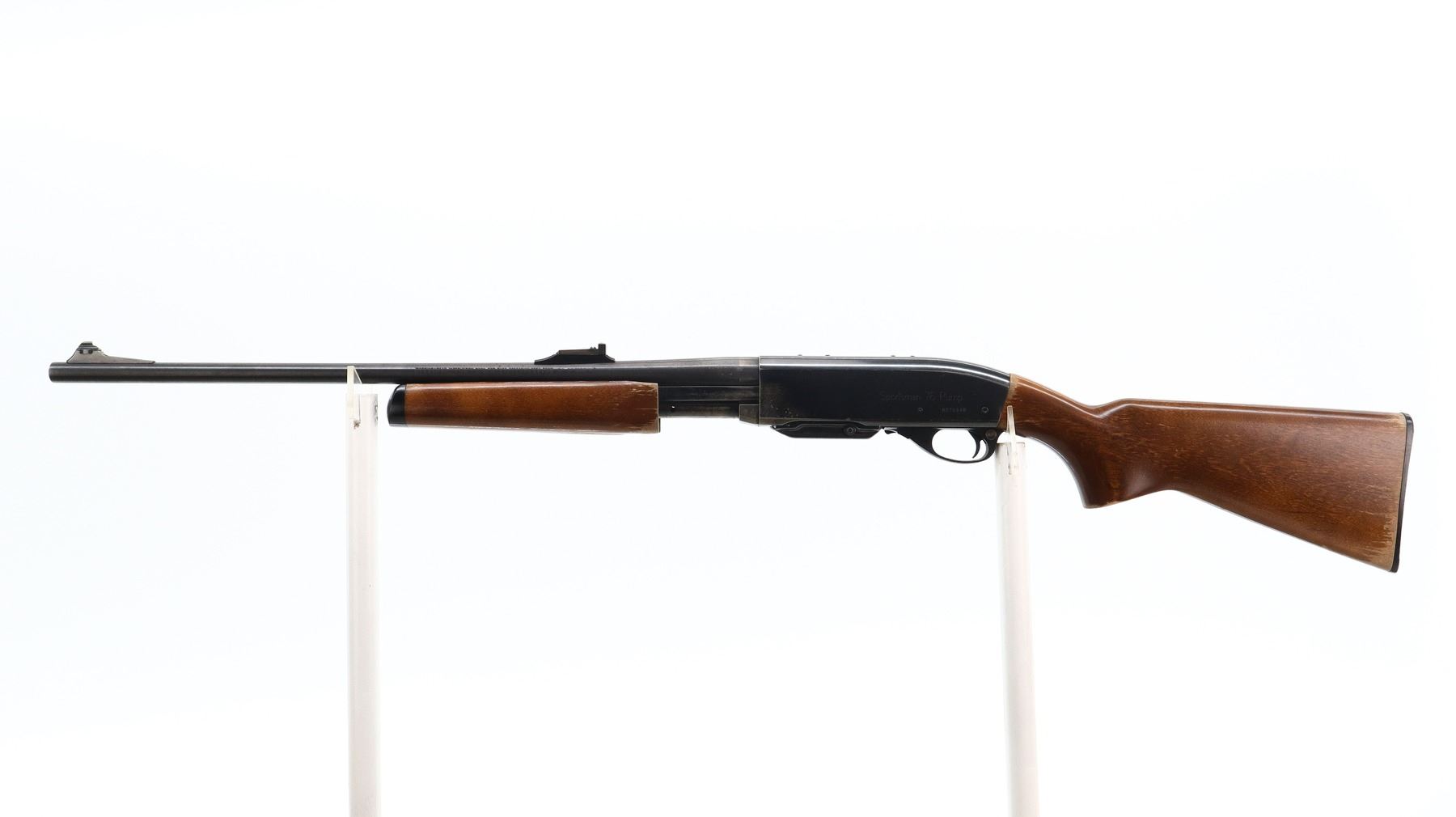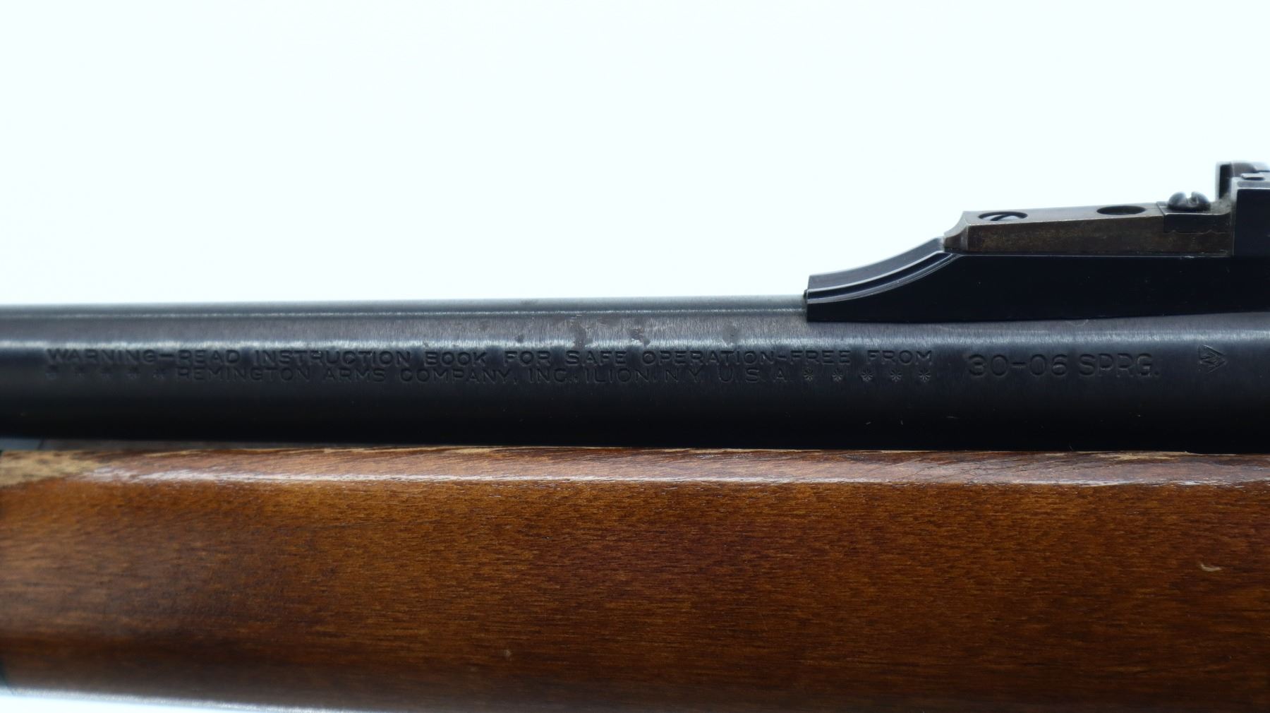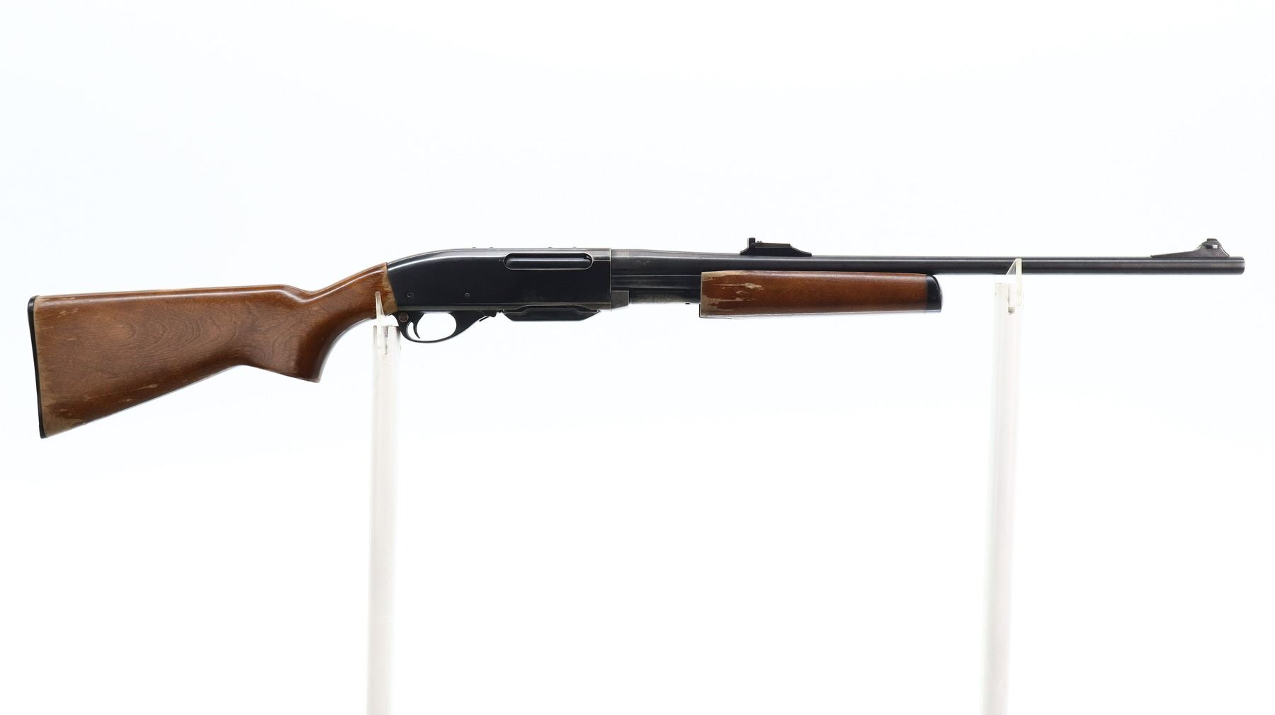 6/10, REMINGTON, MODEL: 76 PUMP, CALIBER:30-06 SPRG, COMES WITH MAGAZINE AND MANUAL. BORE IS VERY GOOD. BLADE FRONT SIGHT WITH RAMP, ADJUSTABLE U NOTCHED REAR SIGHT, BLUED FINISH, RECEIVER DRILLED AND TAPPED FOR SCOPE MOUNT WITH PLUG SCREWS INSTALLED. TWO PIECE SMOOTH WOOD STOCKS, PISTOL GRIP, CHECKERED BLACK POLYMER BUTT PLATE. METAL FINISH SHOWS A FEW LIGHT PITTED SPOTS, RUST SPECKLES, SCRATCHES, HANDLING MARKS AND WEAR. STOCKS SHOW MARKS, SCRATCHES AND WEAR. , ACTION: PUMP ACTION RIFLE, BARREL LENGTH: 22", SERIAL # 8276848, CONDITION: 6/10, CLASS: CANADIAN NON RESTRICTED