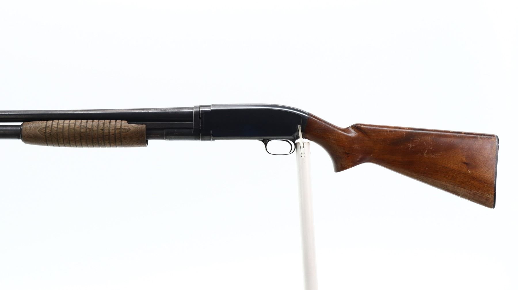 6/10, WINCHESTER, MODEL: 12, CALIBER:12 G X 2 3/4", BORE IS VERY GOOD. MANUFACTURED IN 1957. FIXED FULL CHOKE. SILVER BEAD, ROUND BARREL, BLUED FINISH. TWO PIECE WOOD STOCKS, GROOVED FOREARM, PISTOL GRIP, CHECKERED BLACK POLYMER BUTT PLATE, STOCK CRACKED AT TOE. METAL FINISH SHOWS SOME LIGHT RUST SPOTS, SCRATCHES, HANDLING MARKS AND WEAR. STOCKS SHOW SOME MARKS, SCRATCHES AND WEAR. , BARREL LENGTH: 30", ACTION: PUMP ACTION SHOTGUN, SERIAL # 1746413, CONDITION: 6/10, CLASS: CANADIAN NON RESTRICTED