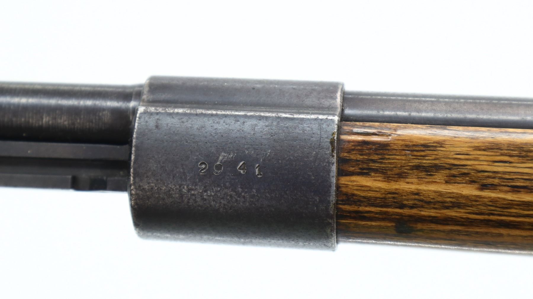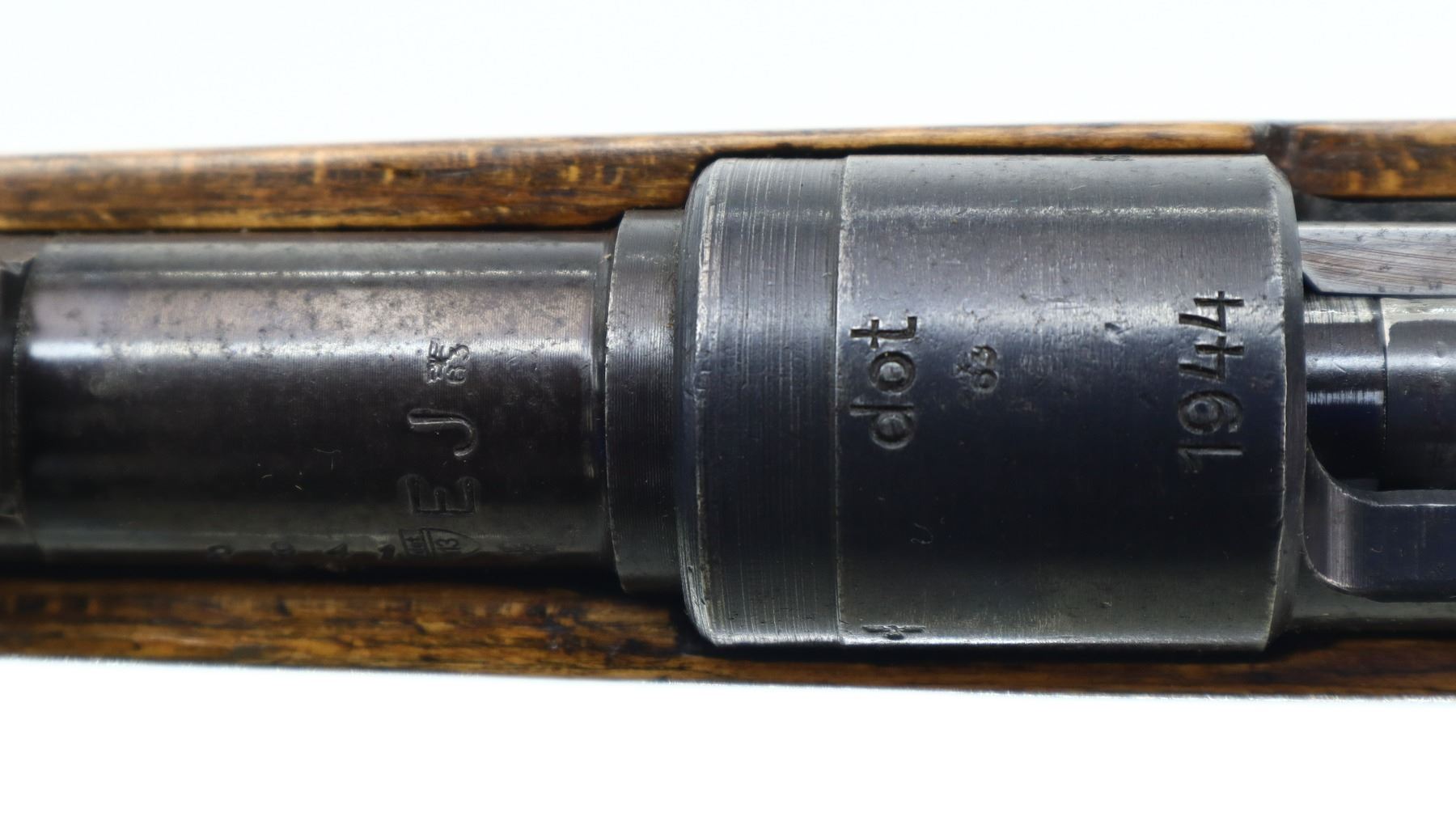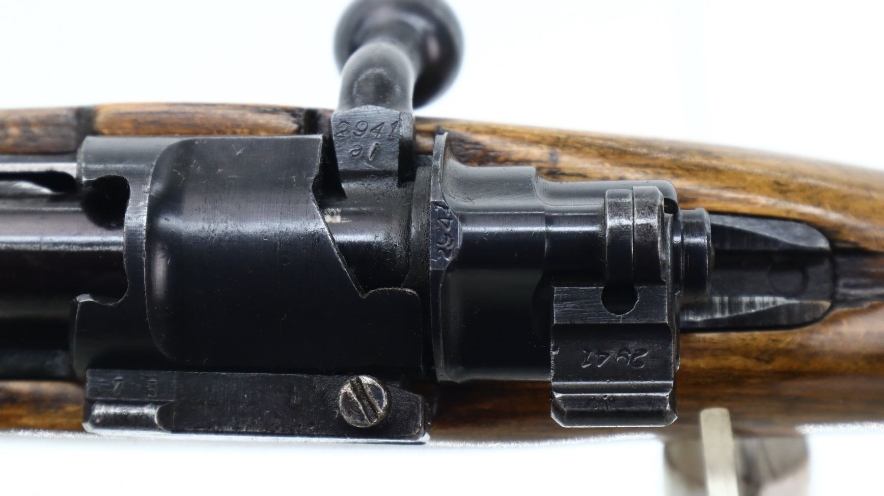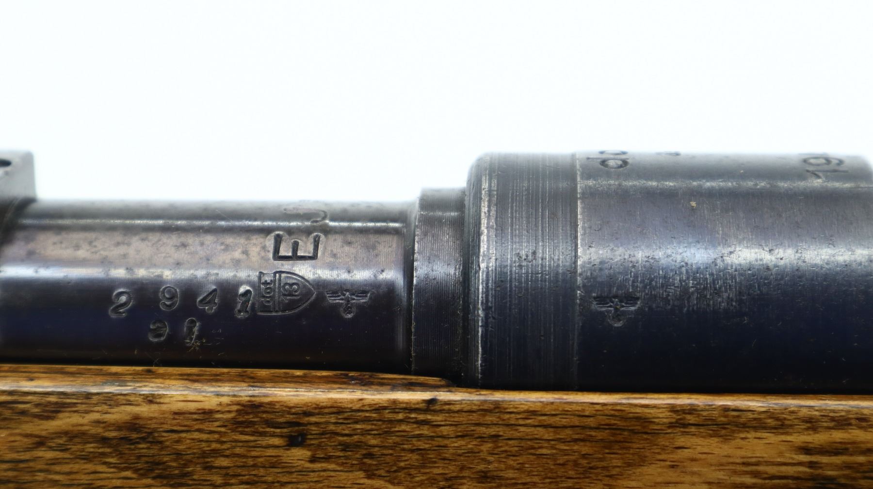 7/10, GERMAN MAUSER , MODEL: K98, CALIBER: 8 MM MAUSER , COMES WITH PARTS, BORE IS FAIR, WORN, LIGHT PITTING. MANUFACTURED BY DOT 1944. VISIBLE SERIAL #'S MATCH. REPLACED BLADE FRONT SIGHT AND RAMP. REAR SIGHT REPLACED WITH ADJUSTABLE PEEP SIGHT. BLUED FINISH. TURN DOWN BOLT HANDLE. TWO PIECE SMOOTH FULL MILITARY WOOD STOCKS. PISTOL GRIP. SMOOTH CUPPED STEEL BUTT PLATE. STOCK DISK. REAR SLOT. FRONT SWIVEL. BAYONET LUG. MISSING CLEANING ROD. SPARE PARTS INCLUDE, ORIGINAL FRONT SIGHT, REAR SIGHT, AND SPARE PEEP FOR NEW SIGHT. METAL FINISH SHOWS SOME SCRATCHES, HANDLING MARKS AND WEAR. STOCK SHOWS SOME MARKS, SCRATCHES AND WEAR. ACTION: BOLT ACTION RIFLE , BARREL LENGTH: 23.5", CONDITION: 7/10, SERIAL# 2941A, CLASS: CANADIAN NON RESTRICTED