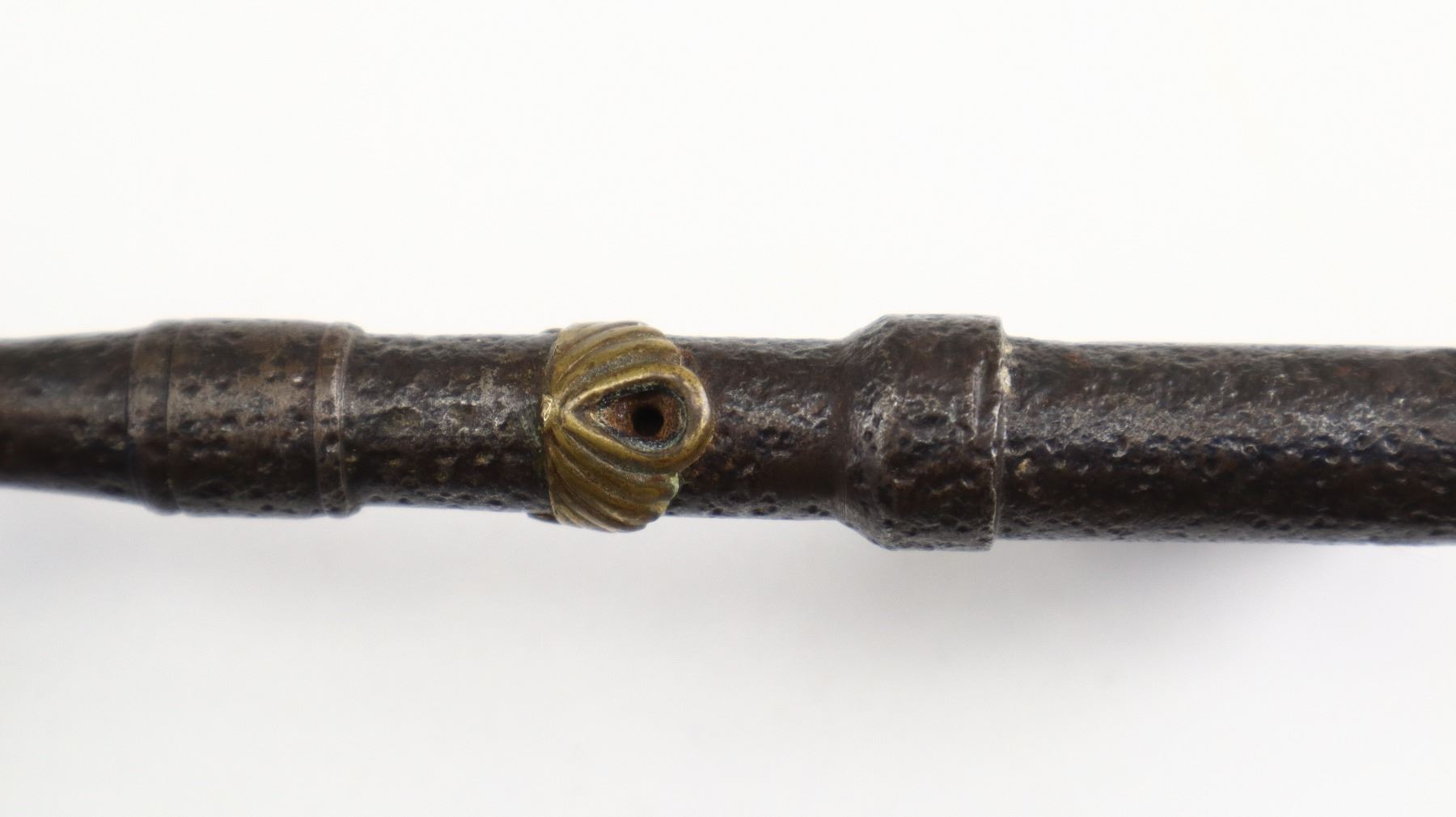 6/10, UNKNOWN , MODEL: KEY GUN , CALIBER: BORE DIAMETER APPROX 24 CAL, COMES WITH RAM ROD , BORE IS FAIR, PITTED. KEY GUN IS UNMARKED. HAS A BRASS DECORATION AROUND THE FLASH HOLE. RESEMBLES A 17TH CENTURY LARGE KEY. NO SIGHTS. LARGE RING AT REAR. LARGE TAB UNDER MUZZLE. OVERALL LENGTH 135MM X 45MM HEIGHT. METAL FINISH IS TURNING BROWN WITH PITTING, HANDLING MARKS AND WEAR., ACTION: SINGLE SHOT , BARREL LENGTH: 56MM, CONDITION: 6/10, SERIAL# NA, CLASS: CANADIAN ANTIQUE, NO PAL REQUIRED