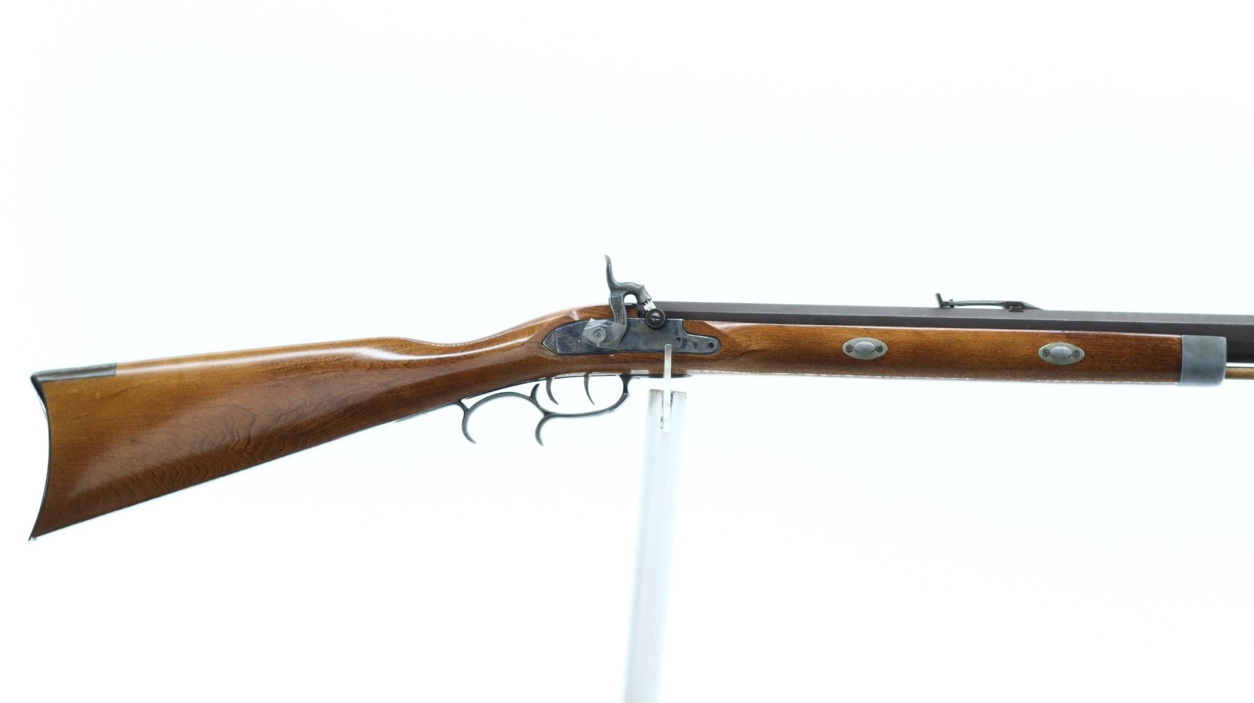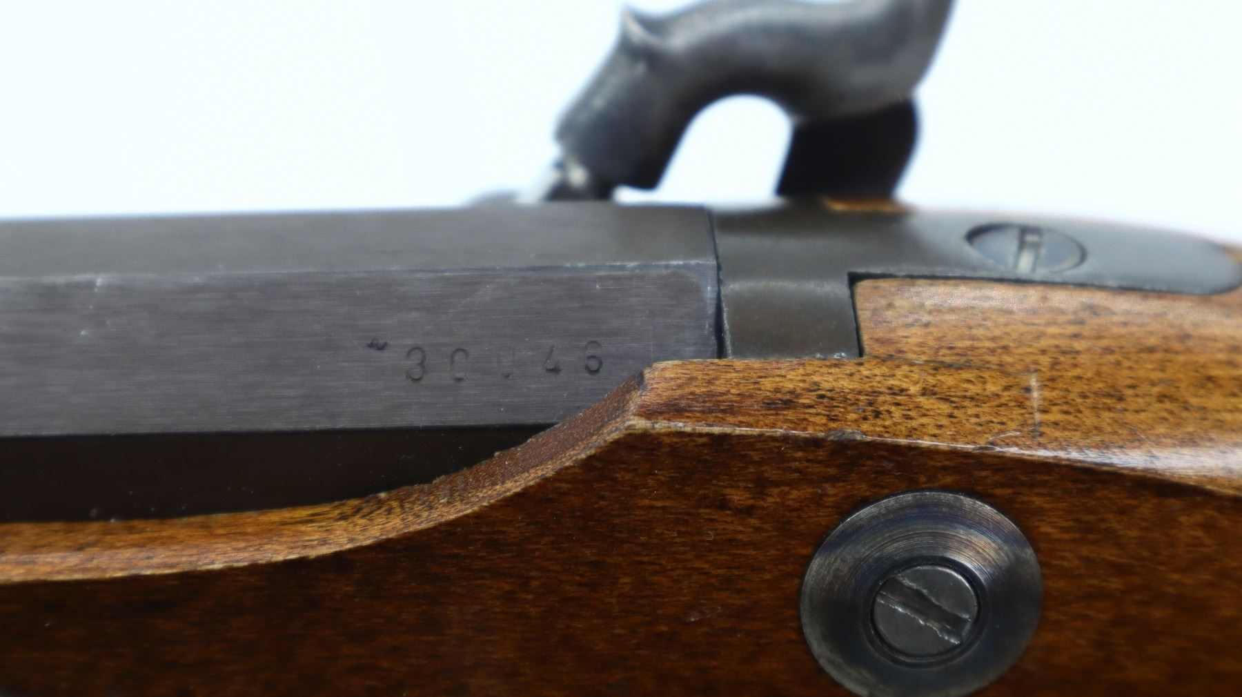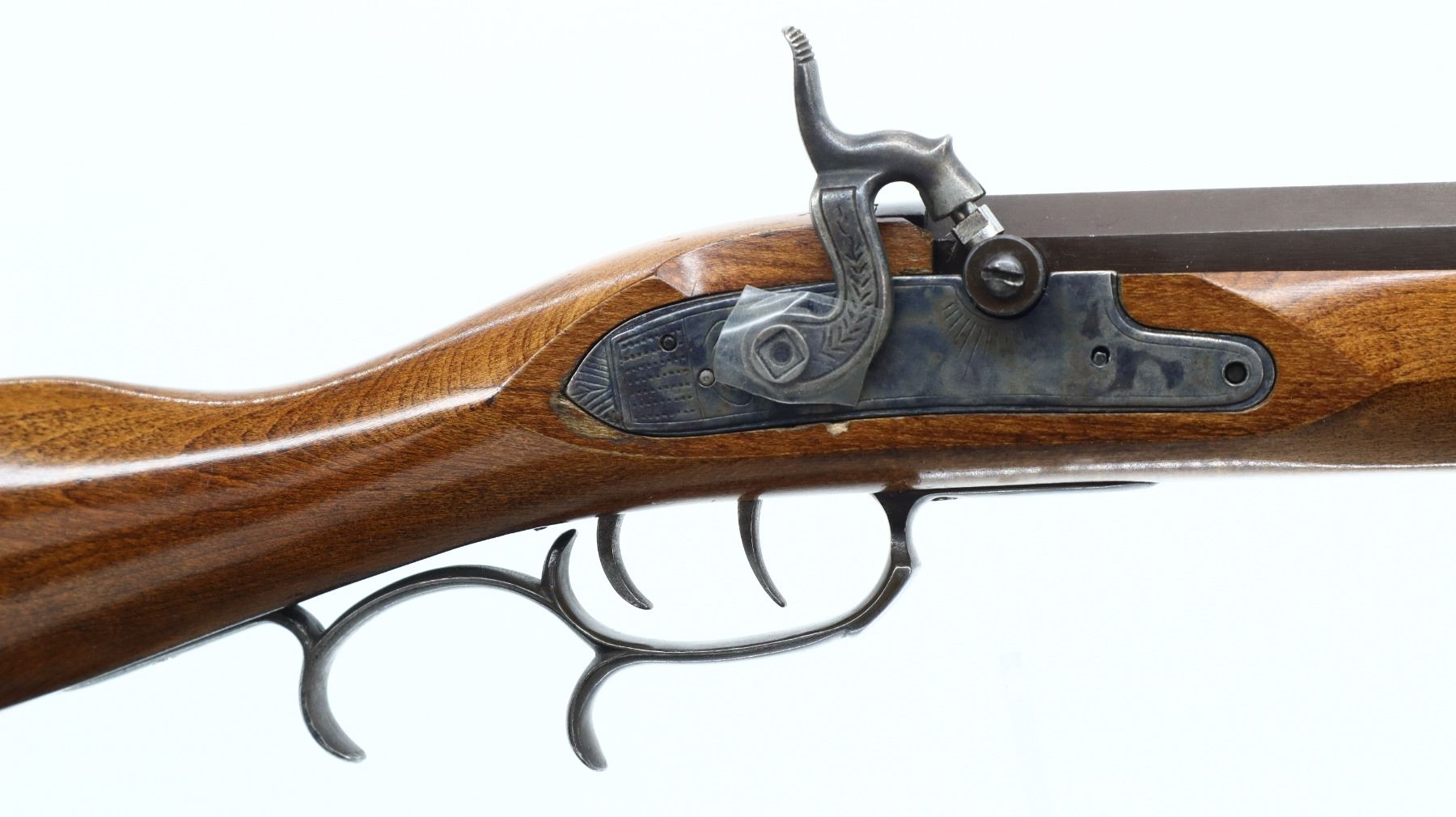6/10, CVA, MODEL: HAWKEN, CALIBER: 54 CAL, BORE IS GOOD. BLADE FRONT SIGHT. ADJUSTABLE U NOTCH REAR SIGHT. OCTAGONAL BARREL. ENGRAVED COLOUR CASE HARDENED LOCK. MISSING THE HAMMER SCREW. FUNCTIONS. DOUBLE SET TRIGGERS. ONE PIECE SMOOTH HALF WOOD STOCK. STRAIGHT GRIP. CRACEKD BEHIND LOCK. SMOOTH CURVED BRASS BUTT PLATE. STEEL TRIGGER GUARD WITH FINGER REST. TWO FOREARM WEDGES. WOOD RAM ROD WITH BRASS TIP. METAL FINISH TURNING BROWN, WITH SCRATCHES, HANDLING MARKS AND WEAR. STOCKS SHOWS MARKS, SCRATCHES AND WEAR. ACTION: PERCUSSION RIFLE , BARREL LENGTH: 31.5", CONDITION: 6/10, SERIAL# 30046, CLASS: CANADIAN NON RESTRICTED
