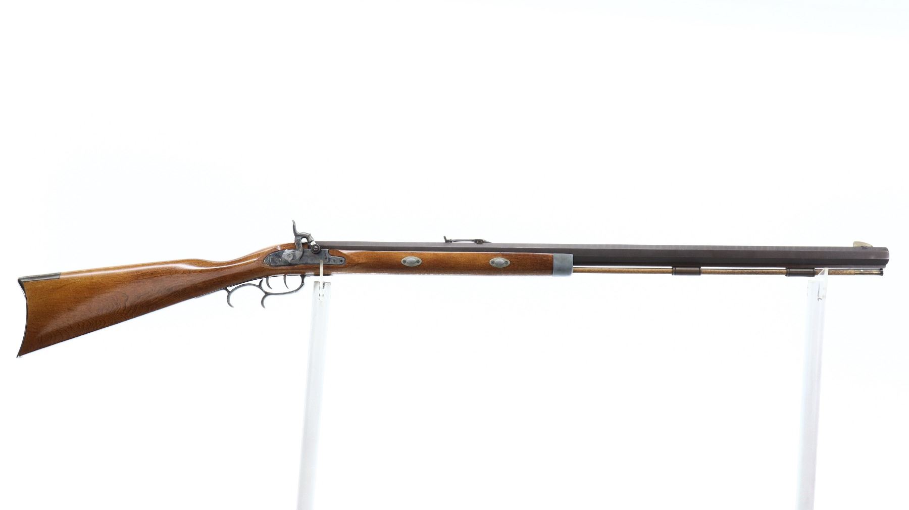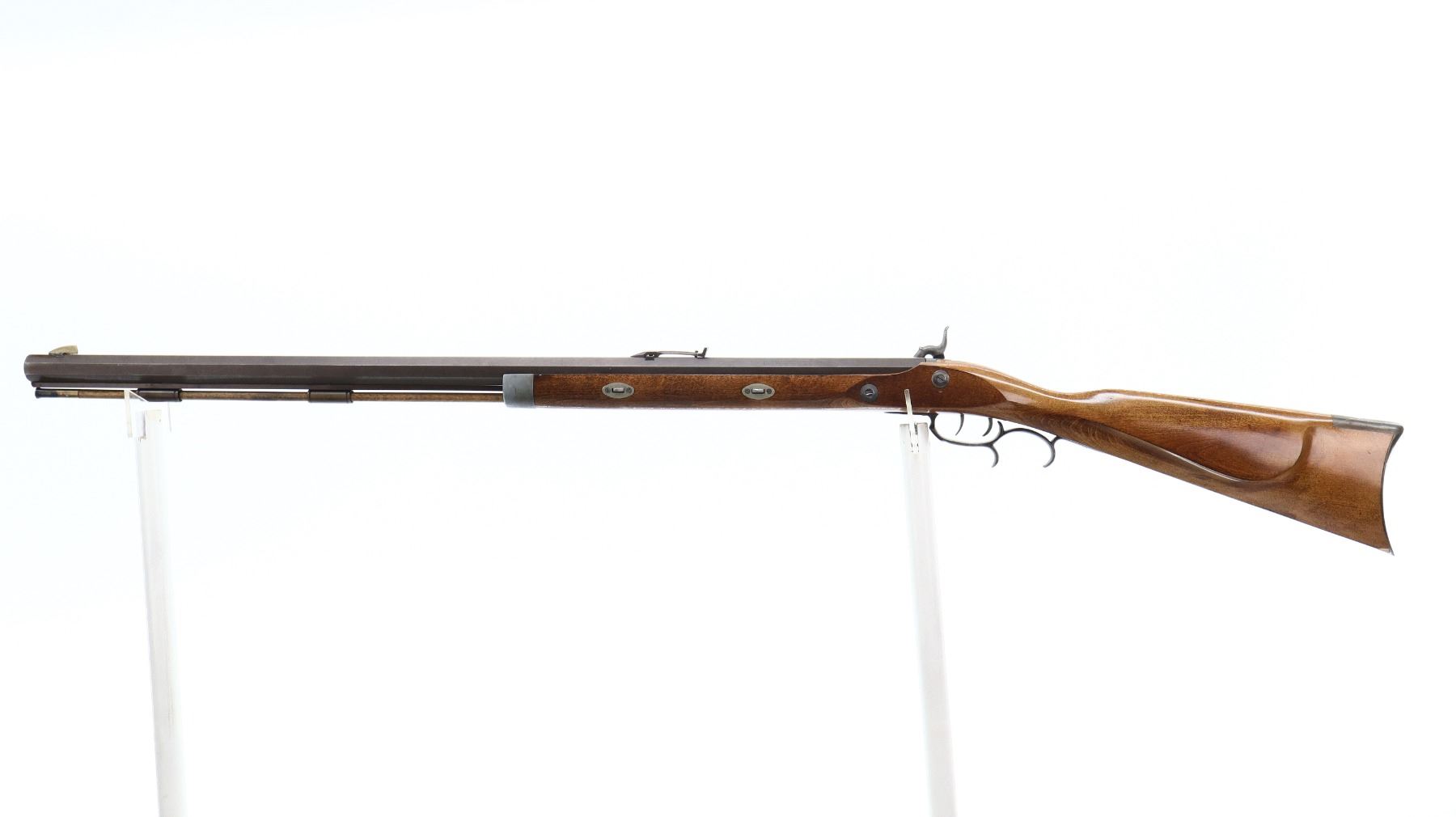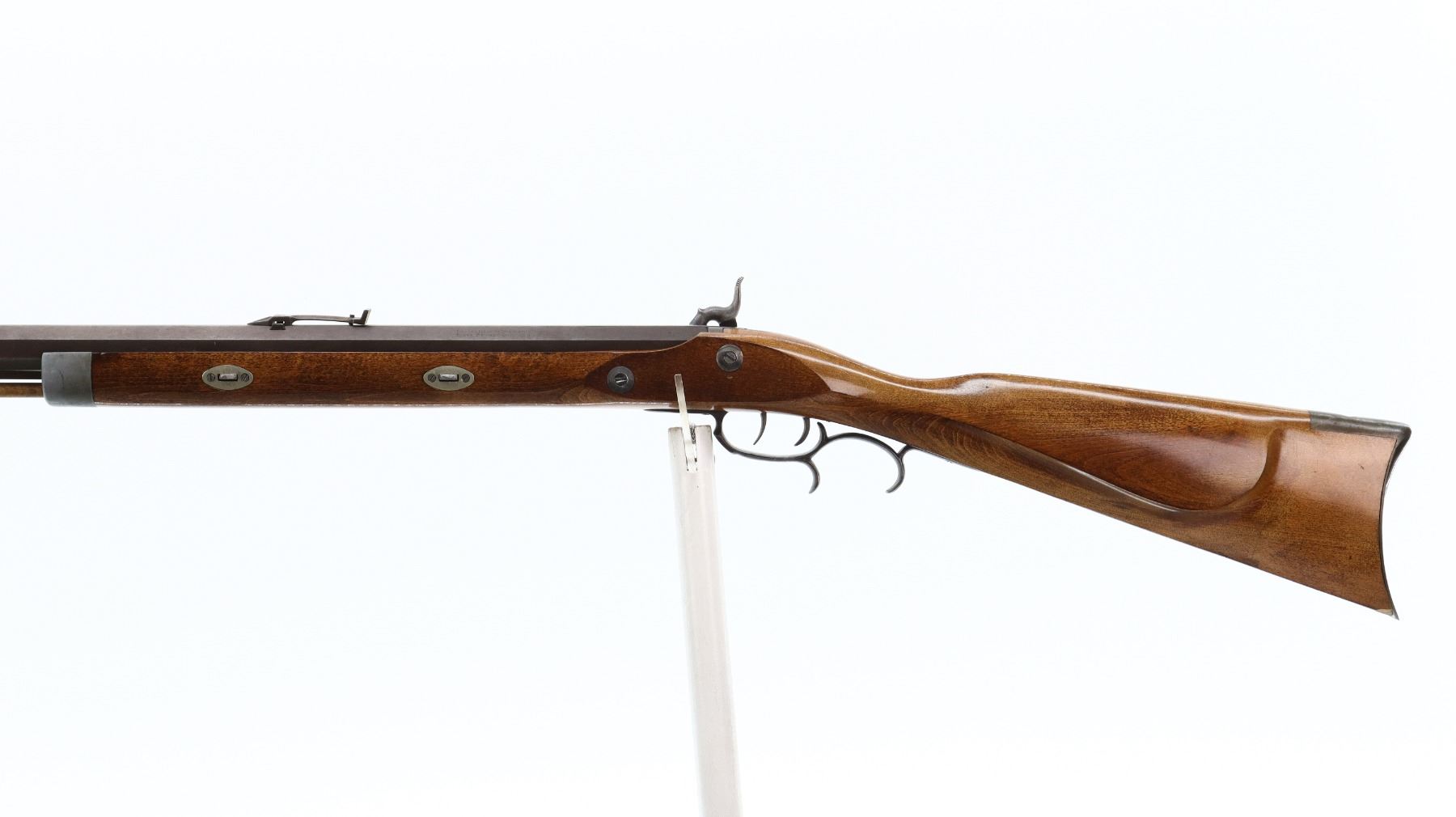 6/10, CVA, MODEL: HAWKEN, CALIBER: 54 CAL, BORE IS GOOD. BLADE FRONT SIGHT. ADJUSTABLE U NOTCH REAR SIGHT. OCTAGONAL BARREL. ENGRAVED COLOUR CASE HARDENED LOCK. MISSING THE HAMMER SCREW. FUNCTIONS. DOUBLE SET TRIGGERS. ONE PIECE SMOOTH HALF WOOD STOCK. STRAIGHT GRIP. CRACEKD BEHIND LOCK. SMOOTH CURVED BRASS BUTT PLATE. STEEL TRIGGER GUARD WITH FINGER REST. TWO FOREARM WEDGES. WOOD RAM ROD WITH BRASS TIP. METAL FINISH TURNING BROWN, WITH SCRATCHES, HANDLING MARKS AND WEAR. STOCKS SHOWS MARKS, SCRATCHES AND WEAR. ACTION: PERCUSSION RIFLE , BARREL LENGTH: 31.5", CONDITION: 6/10, SERIAL# 30046, CLASS: CANADIAN NON RESTRICTED