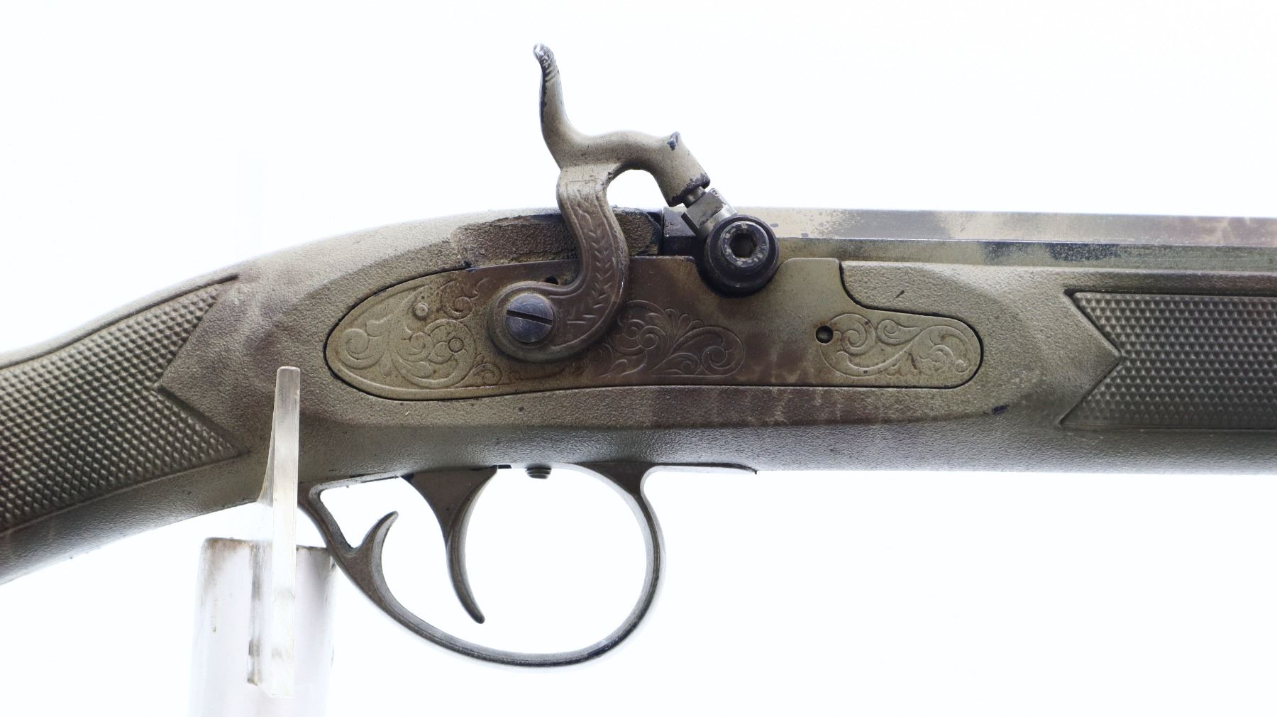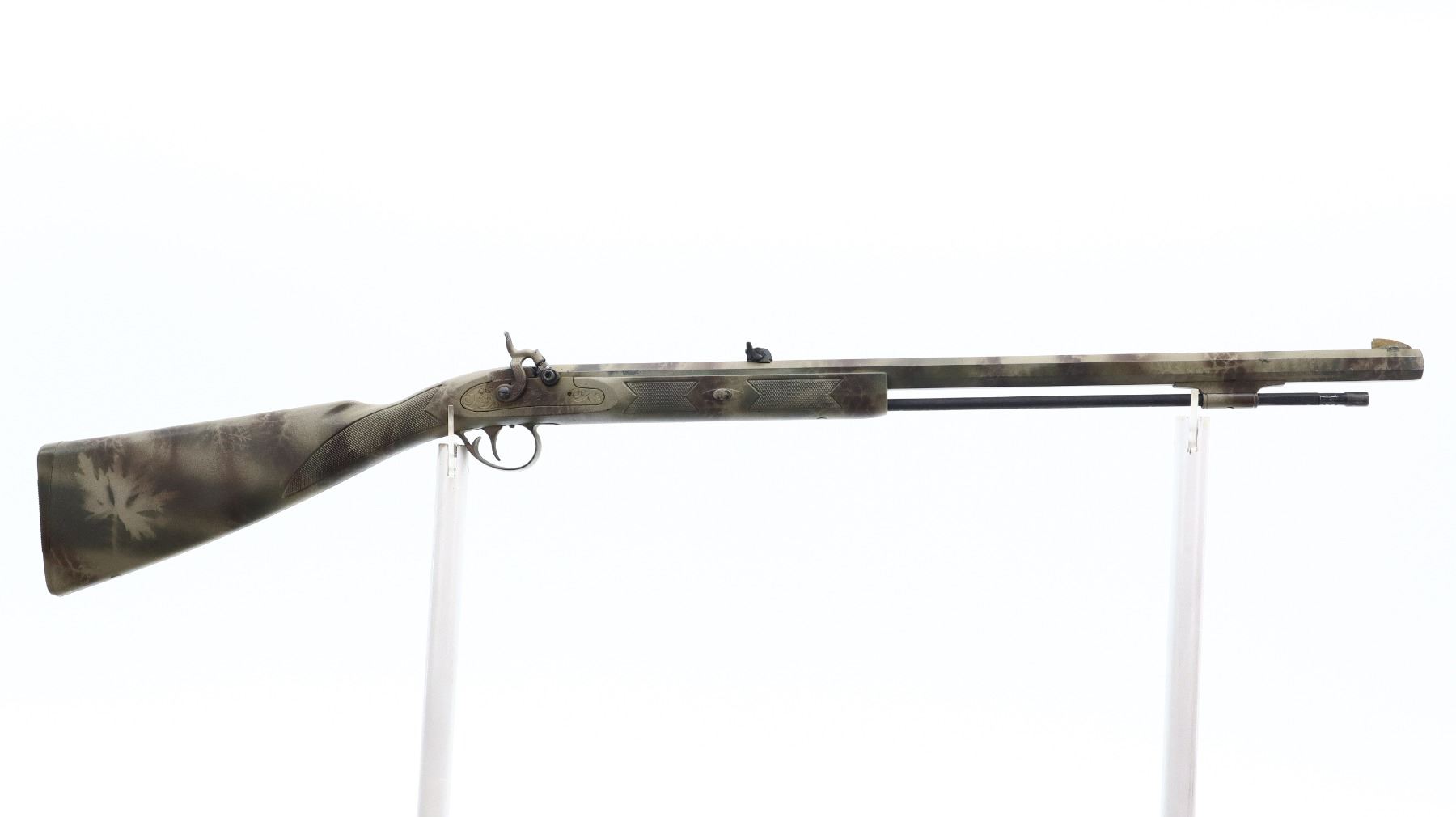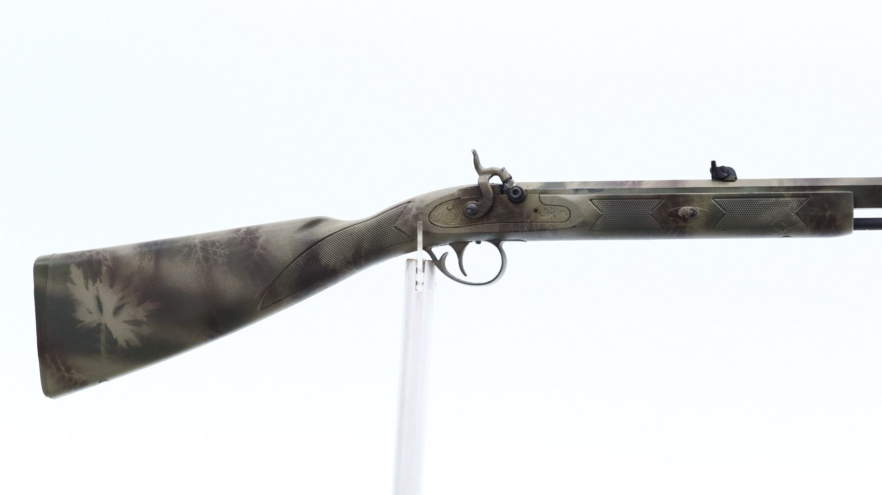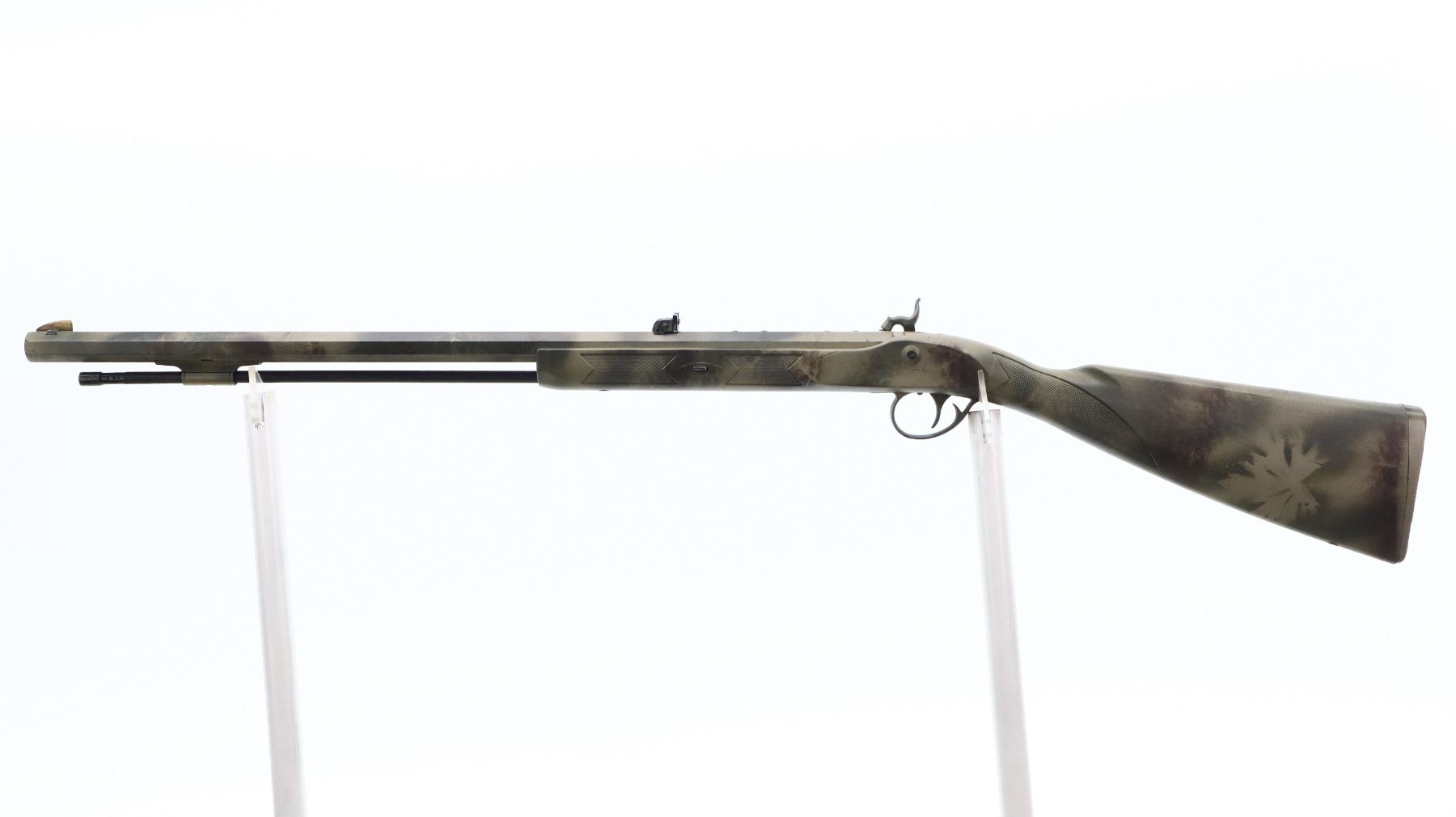 6/10, UNKNOWN , MODEL: HAWKEN, CALIBER: 52 CAL APPROX, BORE IS GOOD, SHINY. MUZZLE LOADER IS PAINTED IN CAMO FINISH OVERALL, COVERING ALL MARKINGS, POSSIBLY A TRADITIONS MAKE. BLADE FRONT SIGHT. ADJUSTABLE U NOTCH REAR SIGHT. OCTAGONAL BARREL. DRILLED AND TAPPED FOR SCOPE MOUNT WITH PLUG SCREWS INSTALLED. ENGRAVED LOCK WITH OFFSET HAMMER THAT FUNCTIONS. ONE PIECE SYNTHETIC STOCK. CHECKERED FOREARM AND STRAIGHT GRIP. GROOVED POLYMER BUTT PLATE. SINGLE FOREARM WEDGE. WOOD RAM ROD WITH STEEL TIP (CHIPPED). FINISH SHOWS SCRATCHES, HANDLING MARKS AND WEAR OVERALL., ACTION: PERCUSSION RIFLE , BARREL LENGTH: 25.5", CONDITION: 6/10, SERIAL# NA, CLASS: CANADIAN NON RESTRICTED