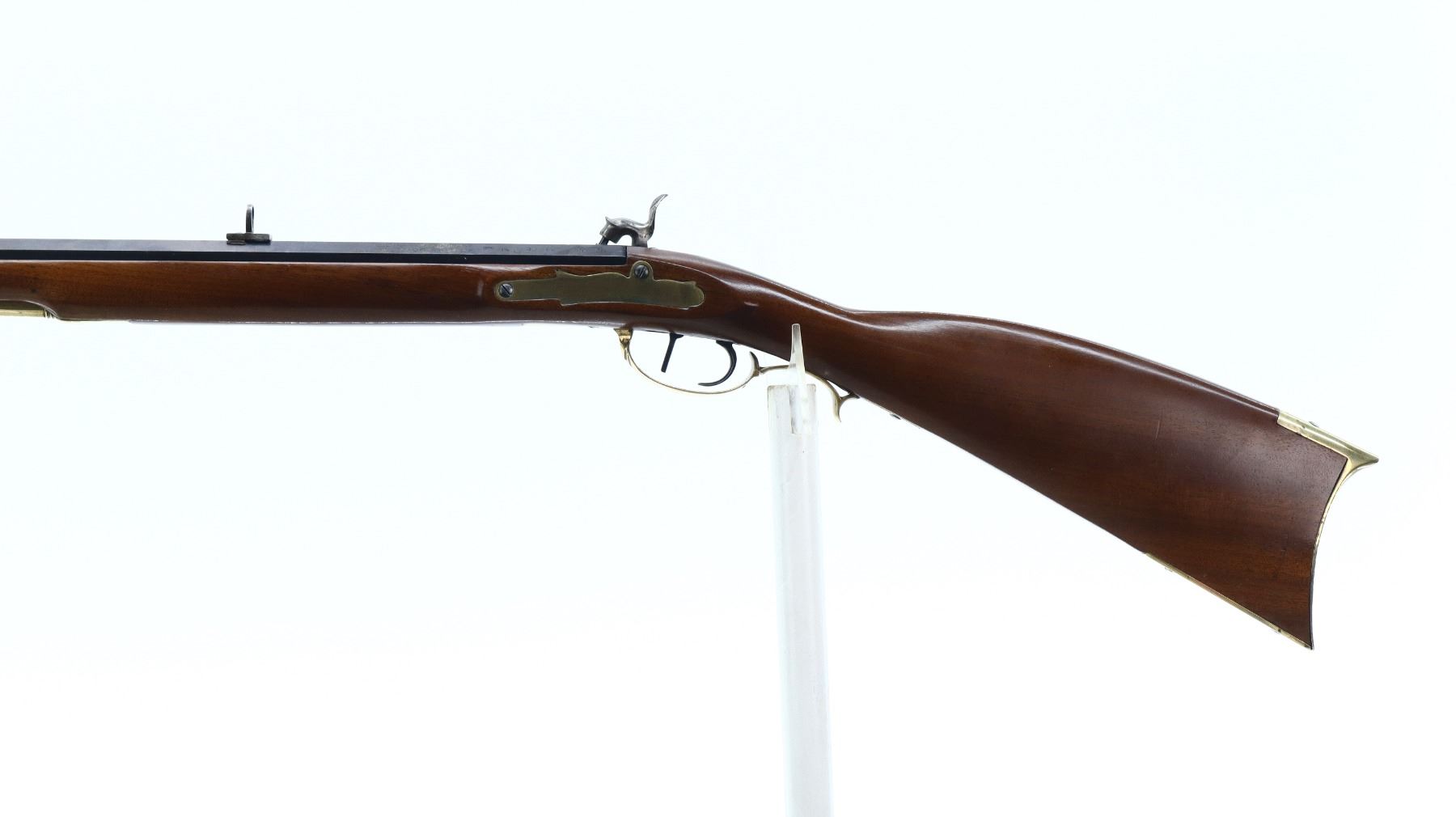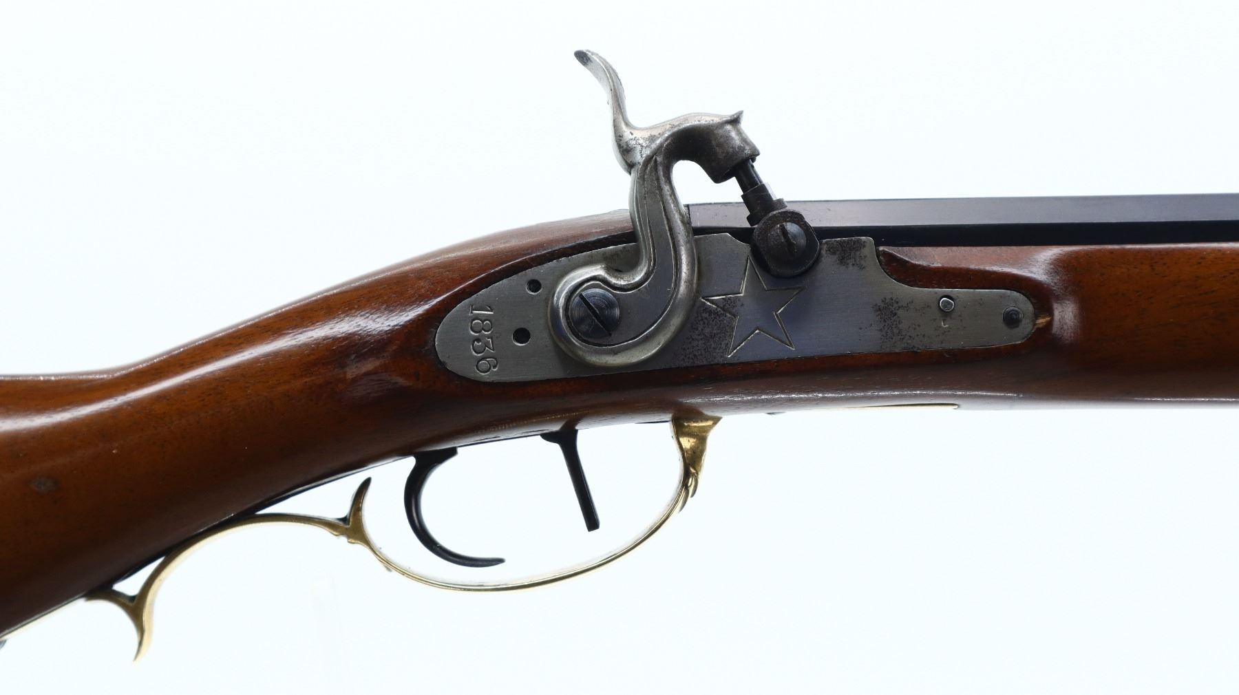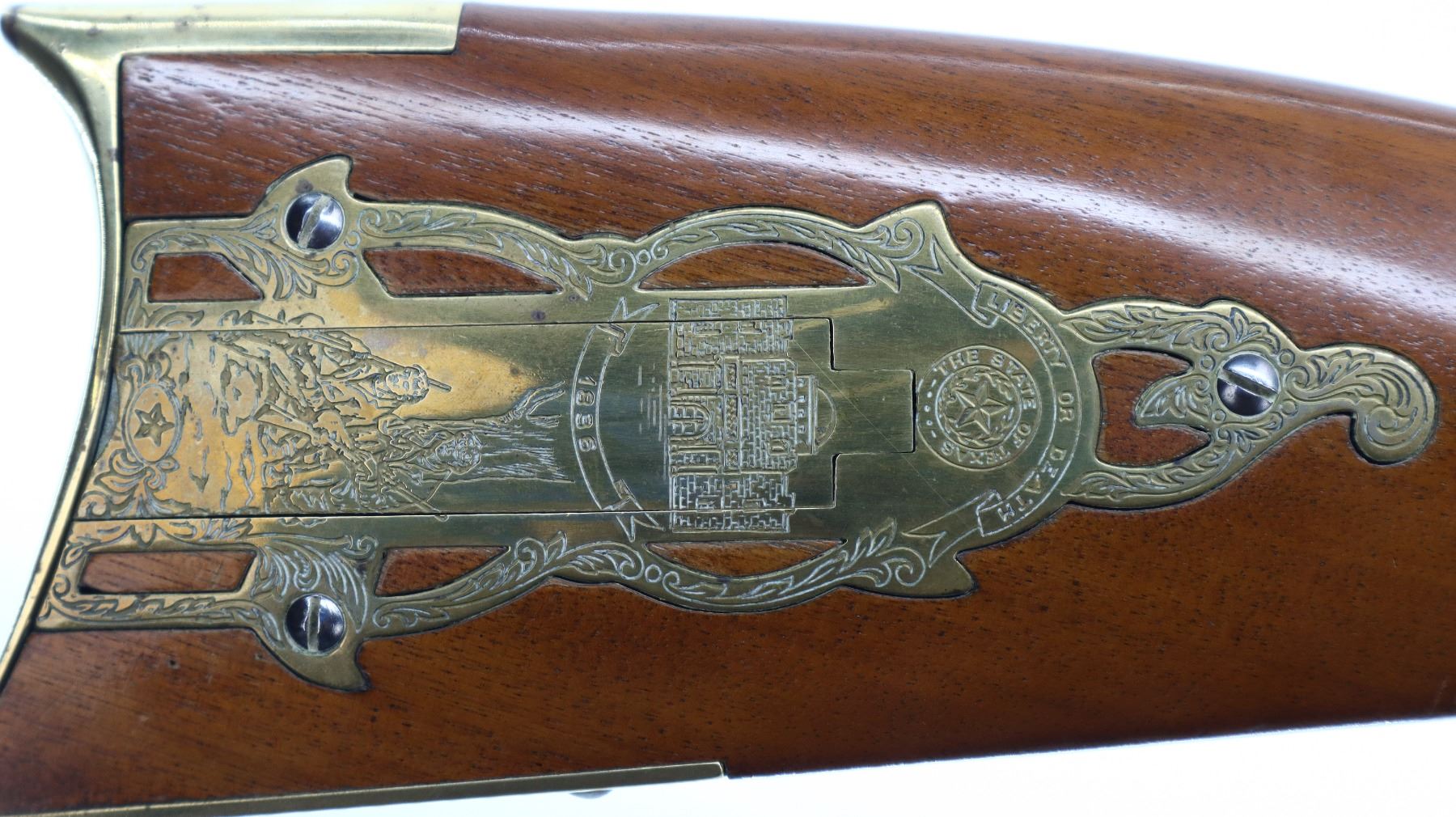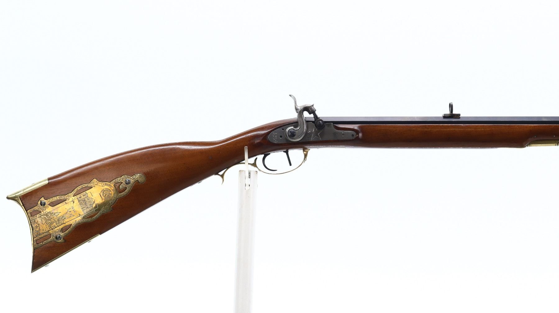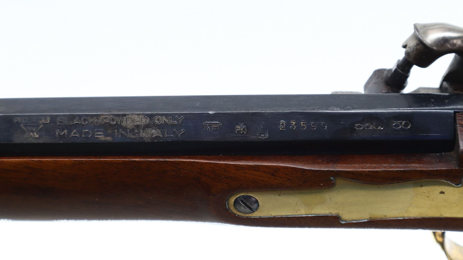 7/10, PEDERSOLI, MODEL: ALAMO LONG RIFLE , CALIBER: 50 CAL, BORE IS GOOD WITH LIGHT RUST. BLADE FRONT SIGHT. U NOTCH FULL BUCKHORN REAR SIGHT. BLUED OCTAGON BARREL. SILVER LOCK AND HAMMER MARKED 1836 WITH A STAR. ONE PIECE SMOOTH FULL LENGTH WOOD STOCK. STRAIGHT GRIP. SMOOTH BRASS BUTT PLATE. ENGRAVED PATCH BOX WITH THE STATE OF TEXAS ETC. ON IT. BRASS TRIGGER GUARD WITH FINGER REST. DOUBLE SET TRIGGERS. SINGLE FOREARM WEDGE. BRASS NOSECAP. WOOD RAM ROD WITH BRASS TRIP. METAL FINISH SHOWS SCRATCHES, HANDLING MARKS AND WEAR. STOCK SHOWS MARKS, SCRATCHES AND WEAR. ACTION: PERCUSSION RIFLE , BARREL LENGTH: 35.5", CONDITION: 7/10, SERIAL# 23599, CLASS: CANADIAN NON RESTRICTED