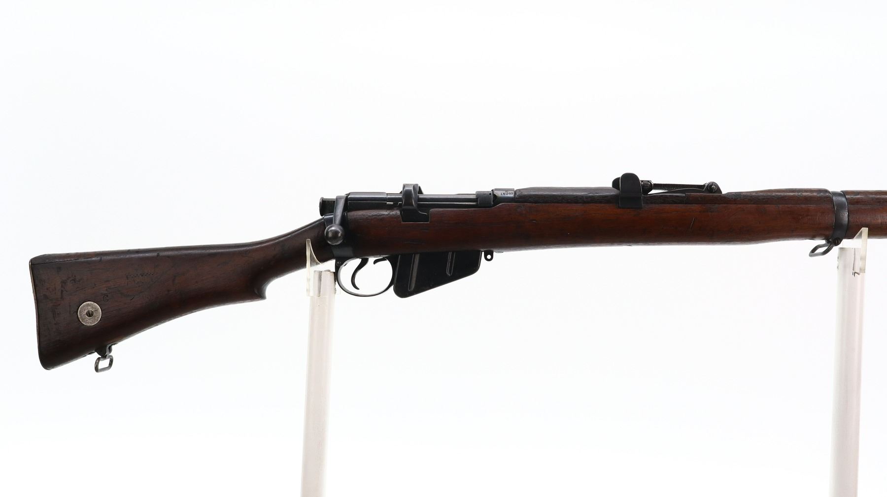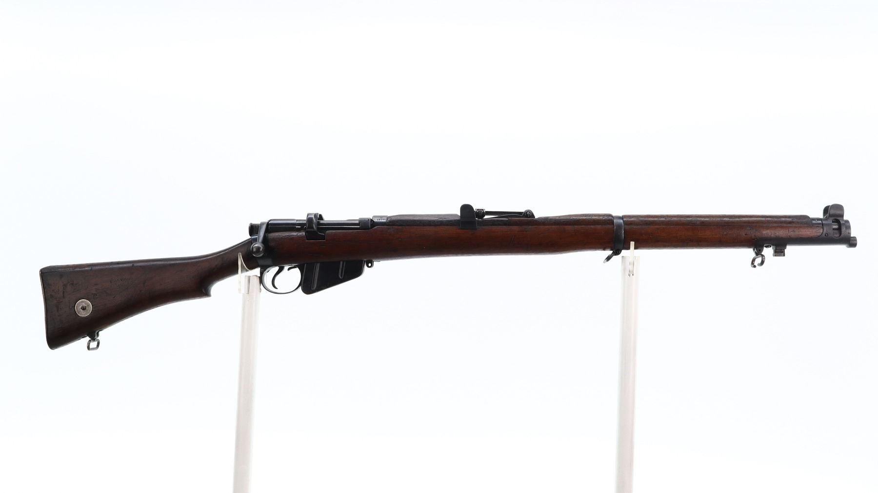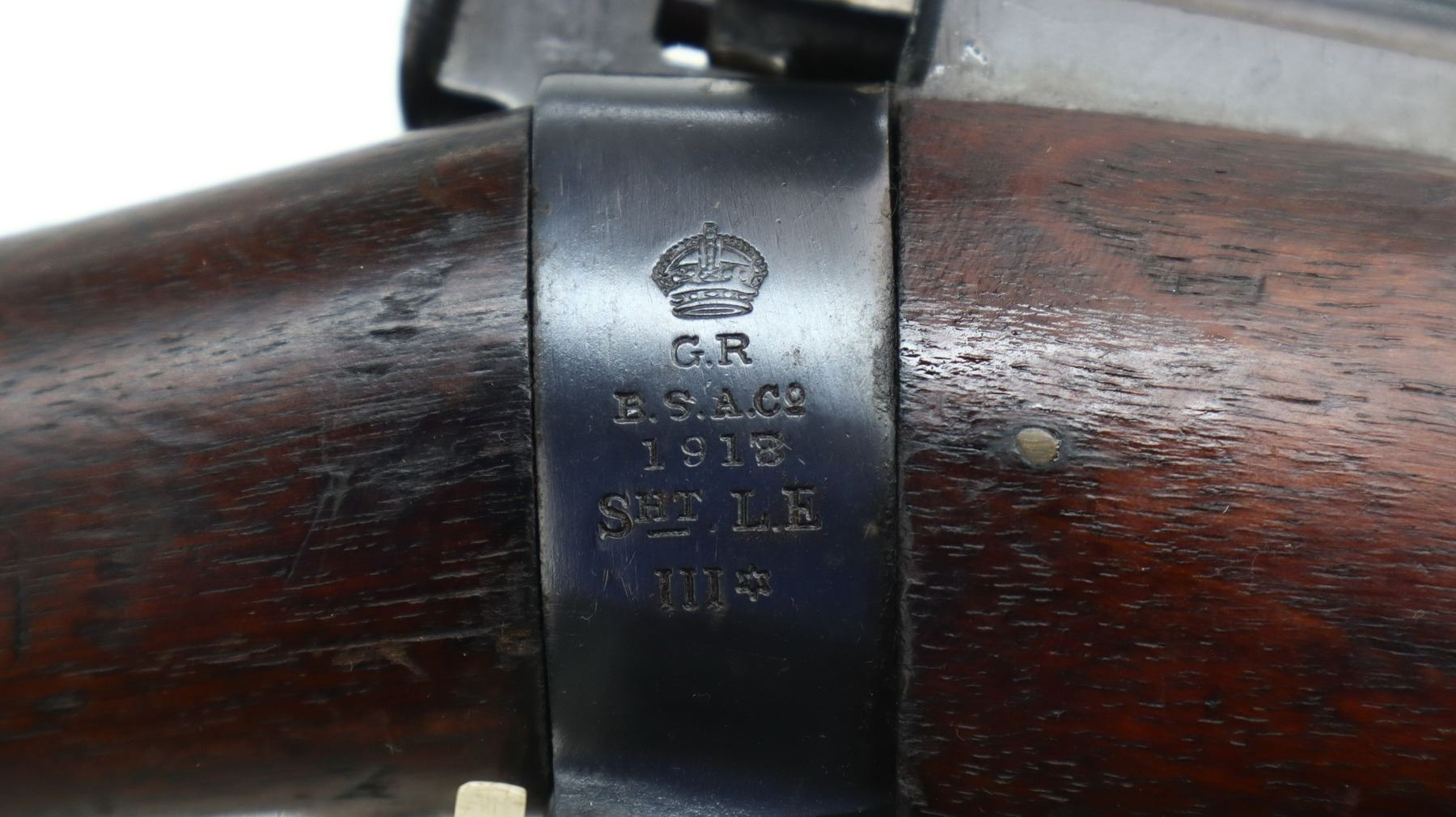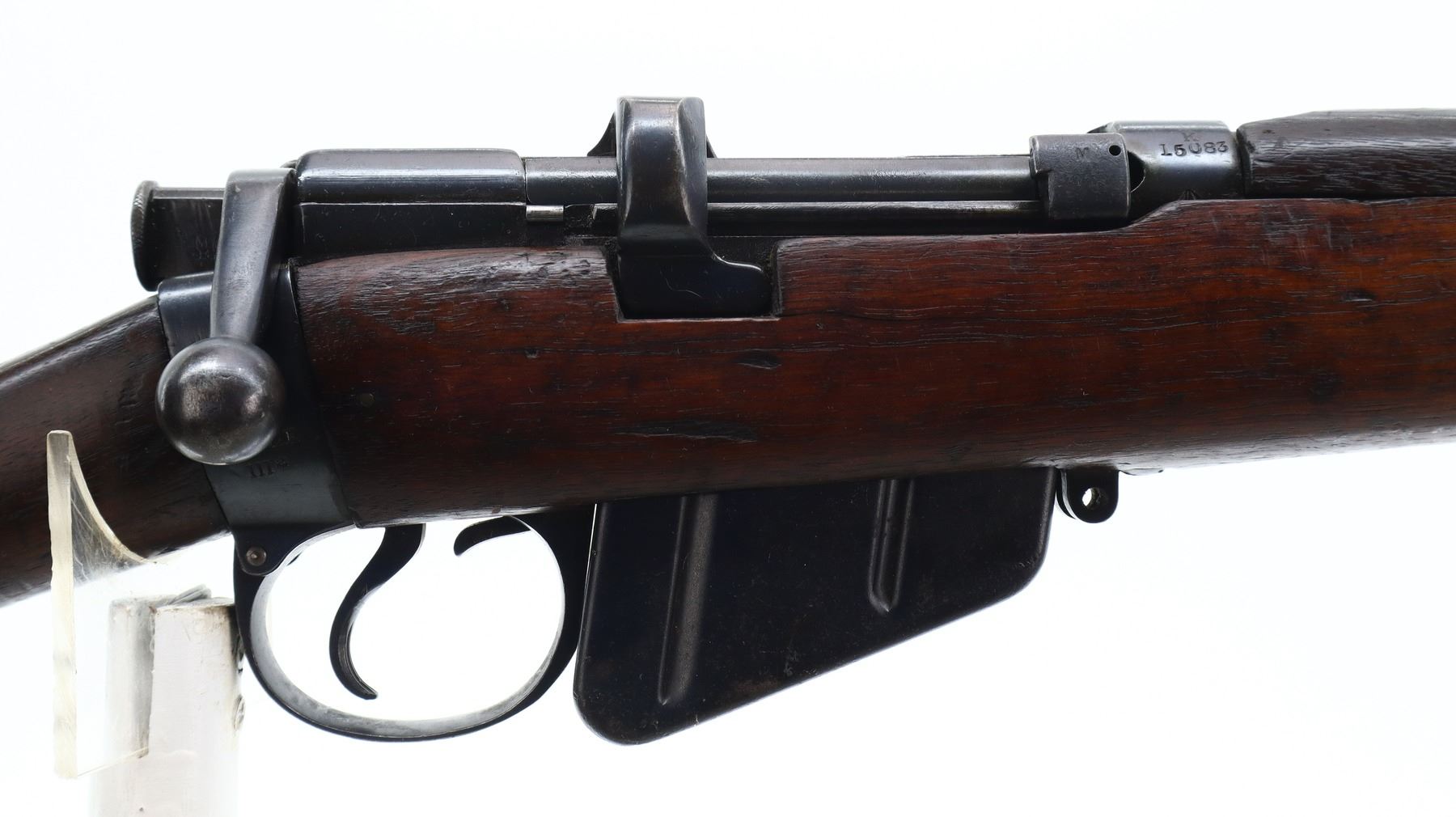 7+/10, LEE ENFIELD , MODEL: CANADIAN NO1 MKIII*, CALIBER: 303 BR , COMES WITH MAGAZINE, BORE IS VERY GOOD. MANUFACTURED BY BSA CO. 1918. ALL VISIBLE SERIAL #'S MATCH. . BLADE FRONT SIGHT WITH EARS AND RAMP. ADJUSTABLE U NOTCH REAR SIGHT WITH EARS. 4 PIECE SMOOTH FULL MILITARY WOOD STOCKS. PISTOL GRIP. SMOOTH BRASS BUTT PLATE WITH TRAP. STEEL STOCK DISK, RIGHT SIDE OF STOCK, LEFT SIDE OF RECEIVER RING ARE MARKED WITH C BRD ARROW, INDICATING CANADIAN MILITARY OWNERSHIP. SWIVELS. BAYONET LUG. STACKING SWIVEL. METAL FINISH, SHOWS SOME SCRATCHES, HANDLING MARKS AND WEAR. STOCK SHOWS SOME MARKS, SCRATCHES AND WEAR. ACTION: BOLT ACTION RIFLE , BARREL LENGTH: 25.25", SERIAL # K15083, CONDITION: 7+/10, CLASS: CANADIAN NON RESTRICTED