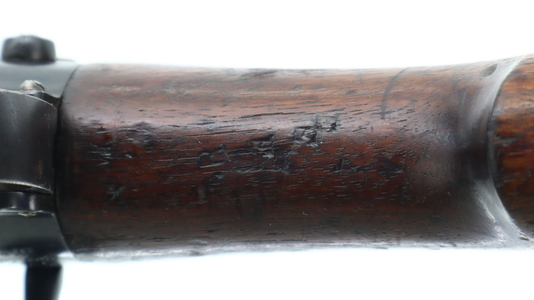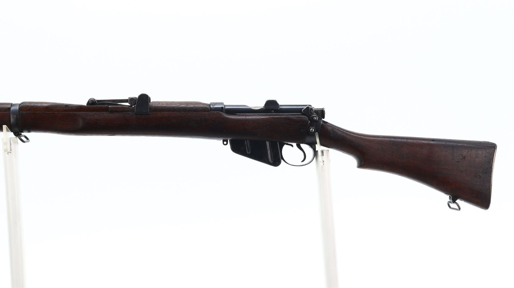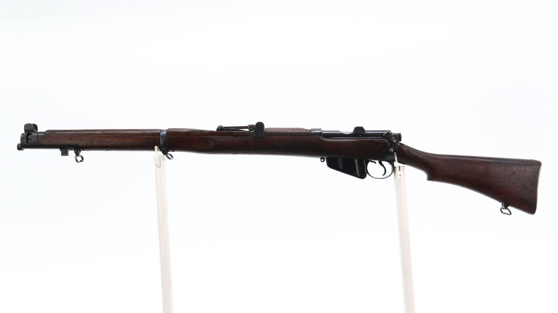 7+/10, LEE ENFIELD , MODEL: CANADIAN NO1 MKIII*, CALIBER: 303 BR , COMES WITH MAGAZINE, BORE IS VERY GOOD. MANUFACTURED BY BSA CO. 1918. ALL VISIBLE SERIAL #'S MATCH. . BLADE FRONT SIGHT WITH EARS AND RAMP. ADJUSTABLE U NOTCH REAR SIGHT WITH EARS. 4 PIECE SMOOTH FULL MILITARY WOOD STOCKS. PISTOL GRIP. SMOOTH BRASS BUTT PLATE WITH TRAP. STEEL STOCK DISK, RIGHT SIDE OF STOCK, LEFT SIDE OF RECEIVER RING ARE MARKED WITH C BRD ARROW, INDICATING CANADIAN MILITARY OWNERSHIP. SWIVELS. BAYONET LUG. STACKING SWIVEL. METAL FINISH, SHOWS SOME SCRATCHES, HANDLING MARKS AND WEAR. STOCK SHOWS SOME MARKS, SCRATCHES AND WEAR. ACTION: BOLT ACTION RIFLE , BARREL LENGTH: 25.25", SERIAL # K15083, CONDITION: 7+/10, CLASS: CANADIAN NON RESTRICTED