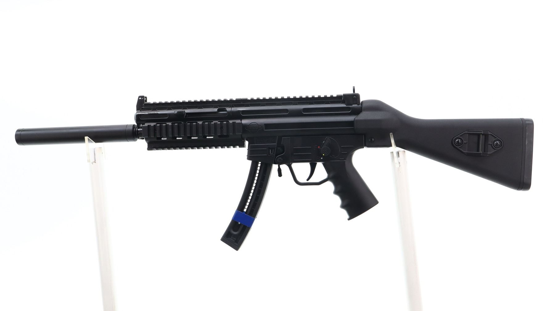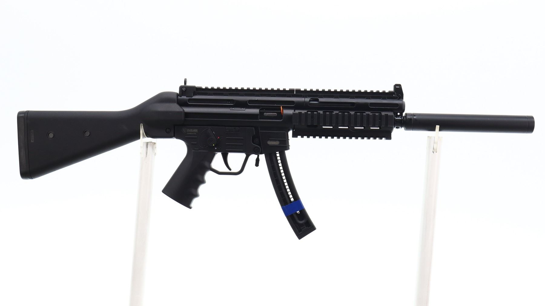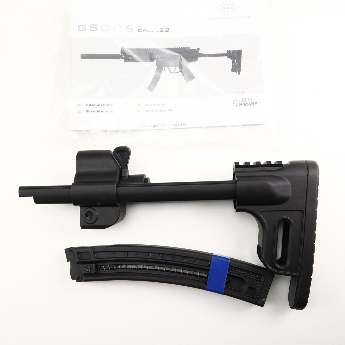 8+/10, GSG, MODEL: 16, CALIBER: 22 LR , COMES WITH BOX, MANUAL 2 MAGAZINE, SPARE PARTS, BORE IS EXCELLENT. BLADE FRONT SIGHT WITH EARS. ADJUSTABLE REAR PEEP SIGHT. FULL LENGTH RAIL ON RECEIVER. VENTED FOREND WITH THREE RAILS. BLACK POLYMER PISTOL GRIP WITH 3 GROOVES. ONE PIECE BLACK SYNTHETIC BUTT STOCK. GROOVED RUBBER RECOIL PAD. REAR SWIVEL. EXTENDED MAG RELEASE. ALUMINUM BARREL SHROUD. SPARE PARTS INCLUDE COLLAPSIBLE MP5 TYPE BUTT STOCK. VARIOUS SIZE SIGHT PARTS. METAL FINISH SHOWS SOME SCRATCHES, HANDLING MARKS AND WEAR. STOCK SHOWS SOME MARKS AND SCRATCHES. ACTION: SEMI AUTOMATIC RIFLE , BARREL LENGTH: 16.5", SERIAL # B114545, CONDITION: 8+/10, CLASS: CANADIAN NON RESTRICTED