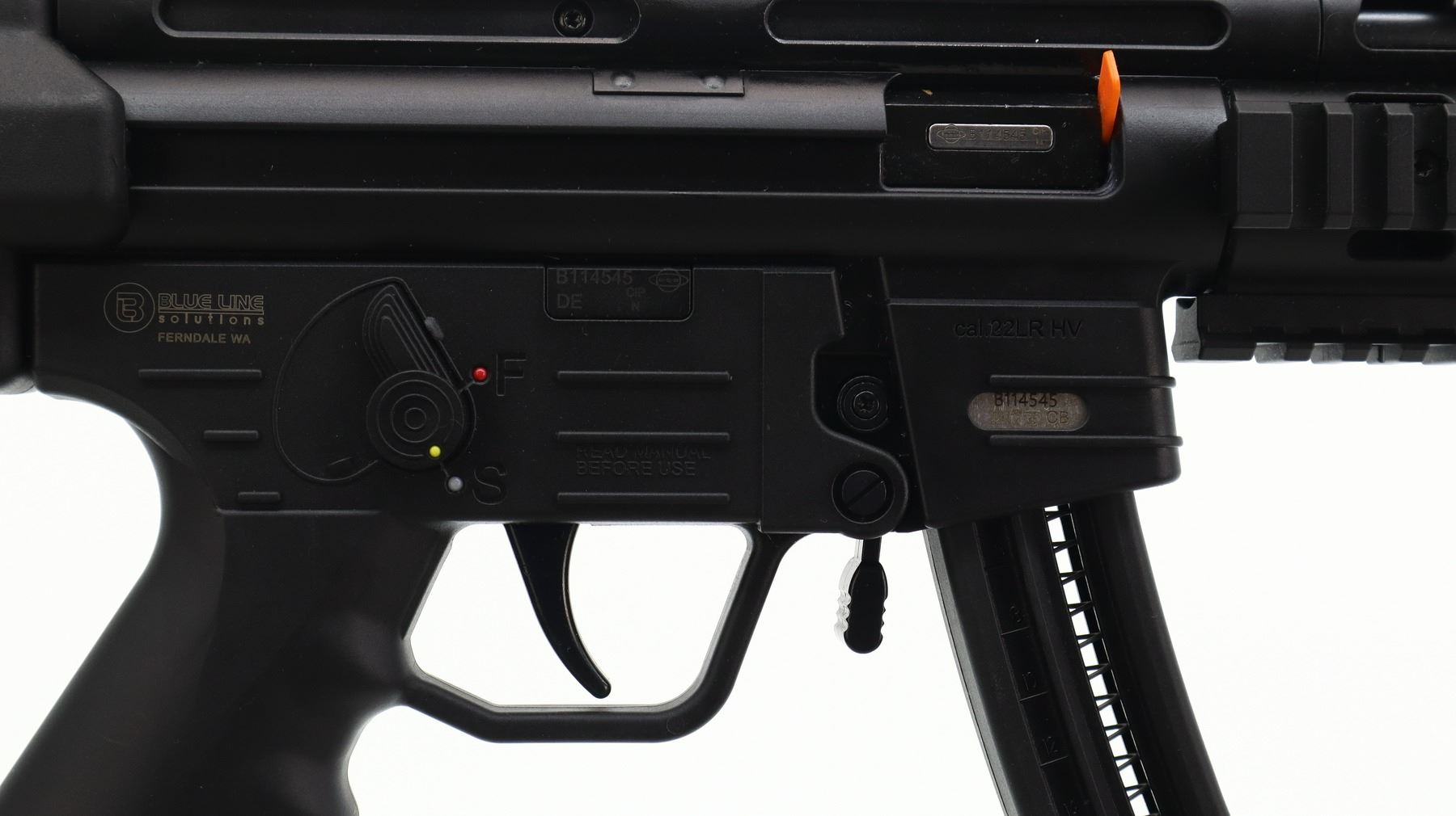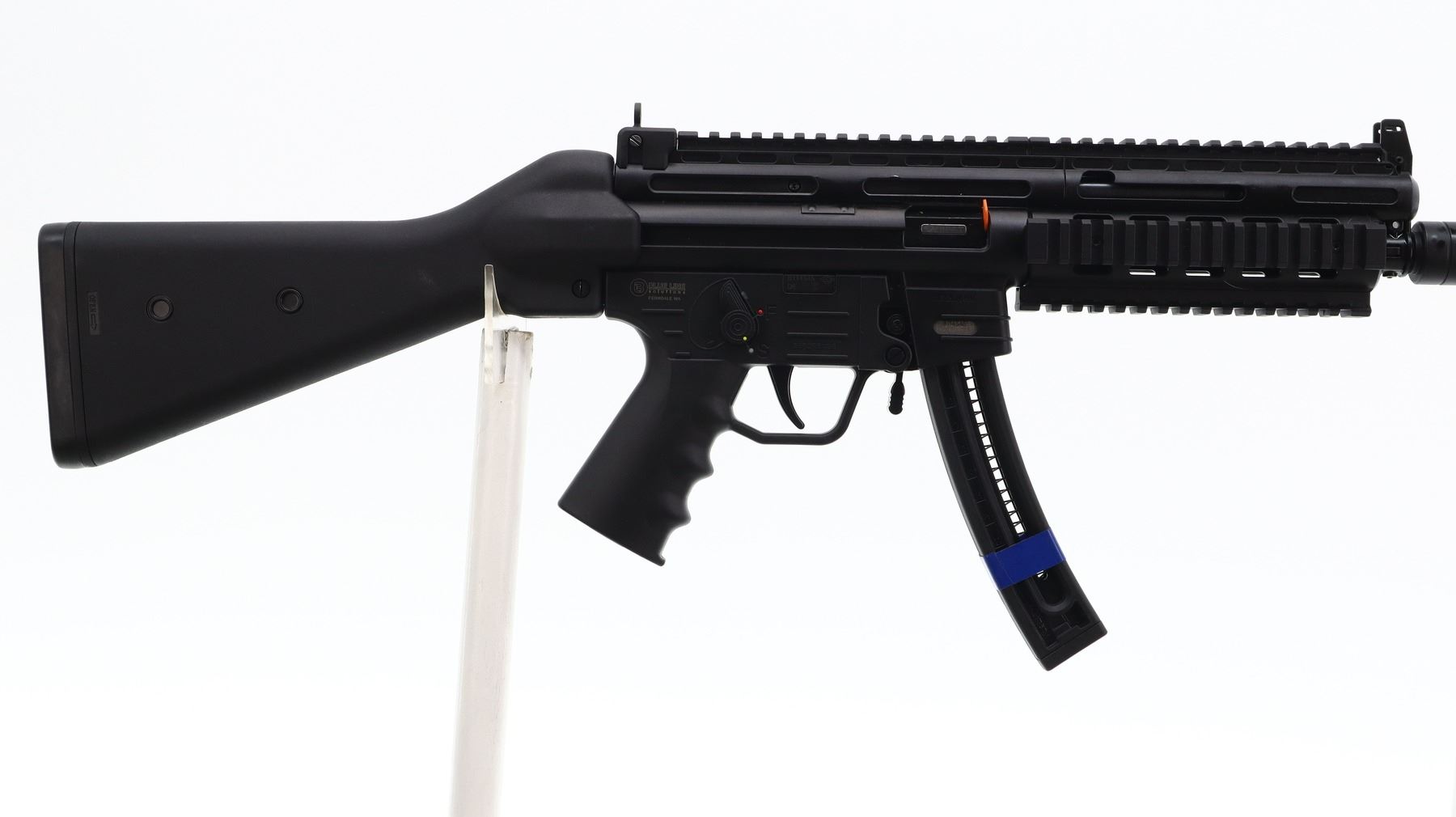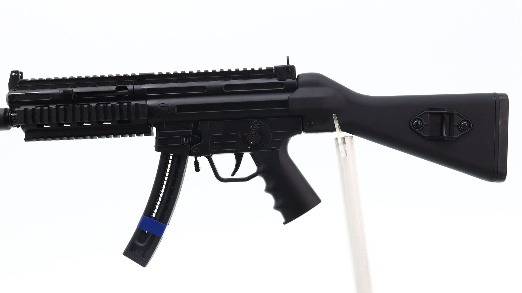 8+/10, GSG, MODEL: 16, CALIBER: 22 LR , COMES WITH BOX, MANUAL 2 MAGAZINE, SPARE PARTS, BORE IS EXCELLENT. BLADE FRONT SIGHT WITH EARS. ADJUSTABLE REAR PEEP SIGHT. FULL LENGTH RAIL ON RECEIVER. VENTED FOREND WITH THREE RAILS. BLACK POLYMER PISTOL GRIP WITH 3 GROOVES. ONE PIECE BLACK SYNTHETIC BUTT STOCK. GROOVED RUBBER RECOIL PAD. REAR SWIVEL. EXTENDED MAG RELEASE. ALUMINUM BARREL SHROUD. SPARE PARTS INCLUDE COLLAPSIBLE MP5 TYPE BUTT STOCK. VARIOUS SIZE SIGHT PARTS. METAL FINISH SHOWS SOME SCRATCHES, HANDLING MARKS AND WEAR. STOCK SHOWS SOME MARKS AND SCRATCHES. ACTION: SEMI AUTOMATIC RIFLE , BARREL LENGTH: 16.5", SERIAL # B114545, CONDITION: 8+/10, CLASS: CANADIAN NON RESTRICTED
