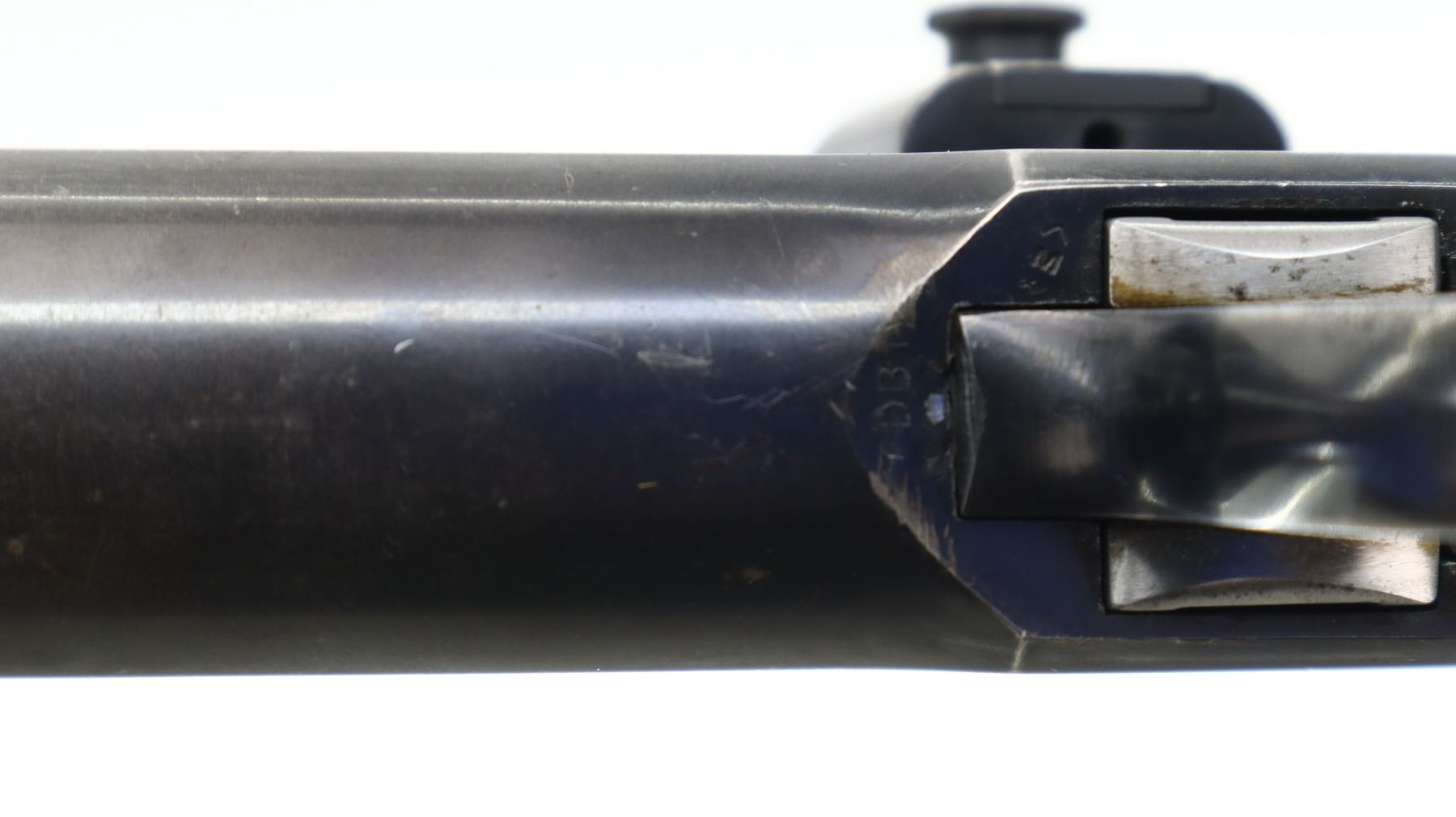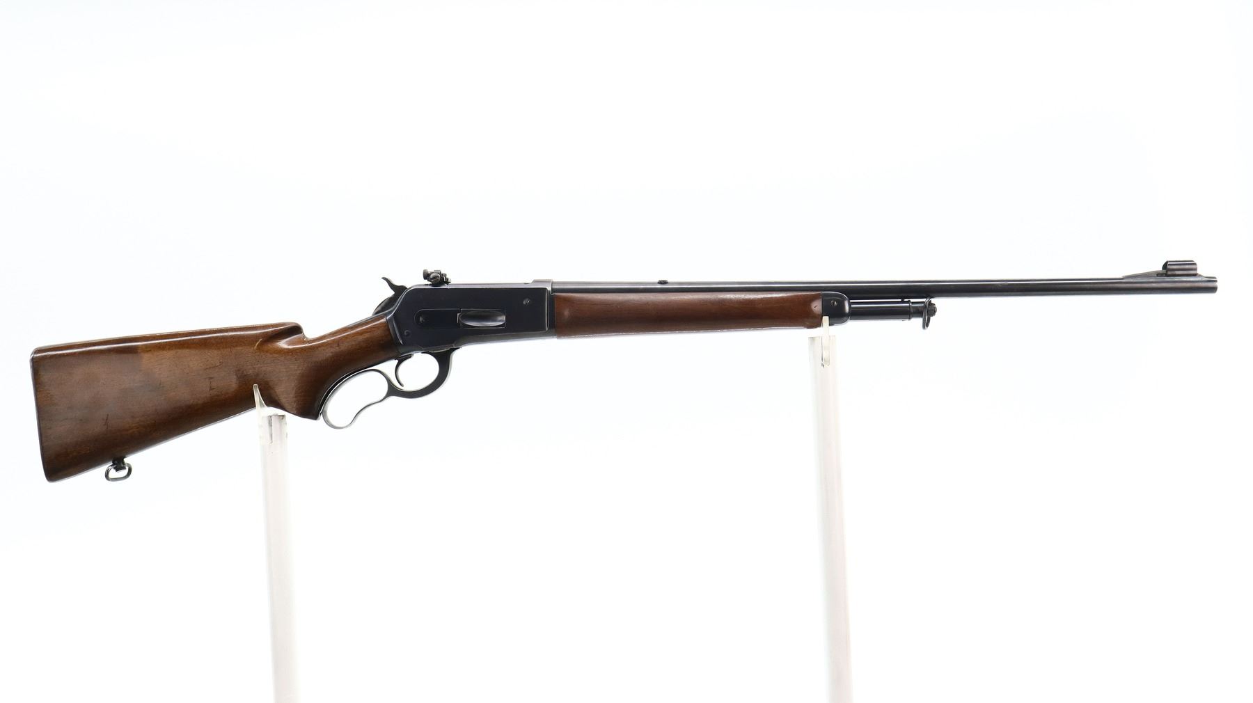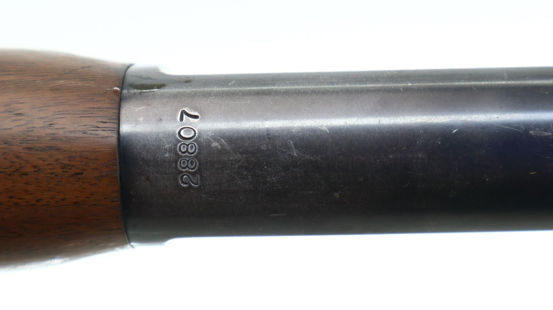 7/10, WINCHESTER, MODEL: 71, CALIBER: 348 WIN, BORE IS VERY GOOD. MANUFACTURED 1949. BLADE FRONT SIGHT WITH HOOD AND RAMP. REAR SIGHT REMOVED. SLOT BLANK INSTALLED. RECEIVER DRILLED AND TAPPED WITH LYMAN 56 ADJUSTABLE PEEP SIGHT INSTALLED. BLUED FINISH. GROOVED SPUR HAMMER. TWO PIECE SMOOTH WOOD STOCKS. PISTOL GRIP. CHECKERED STEEL BUTT PLATE. SLING SWIVELS. HALF LENGTH MAGAZINE TUBE. METAL FINISH SHOWS A FEW LIGHT RUST SPECKLES, SCRATCHES, HANDLING MARKS AND WEAR. STOCKS SHOW MARKS, SCRATCHES AND WEAR. ACTION: LEVER ACTION RIFLE , BARREL LENGTH: 24", SERIAL # 28807, CONDITION: 7/10, CLASS: CANADIAN NON RESTRICTED