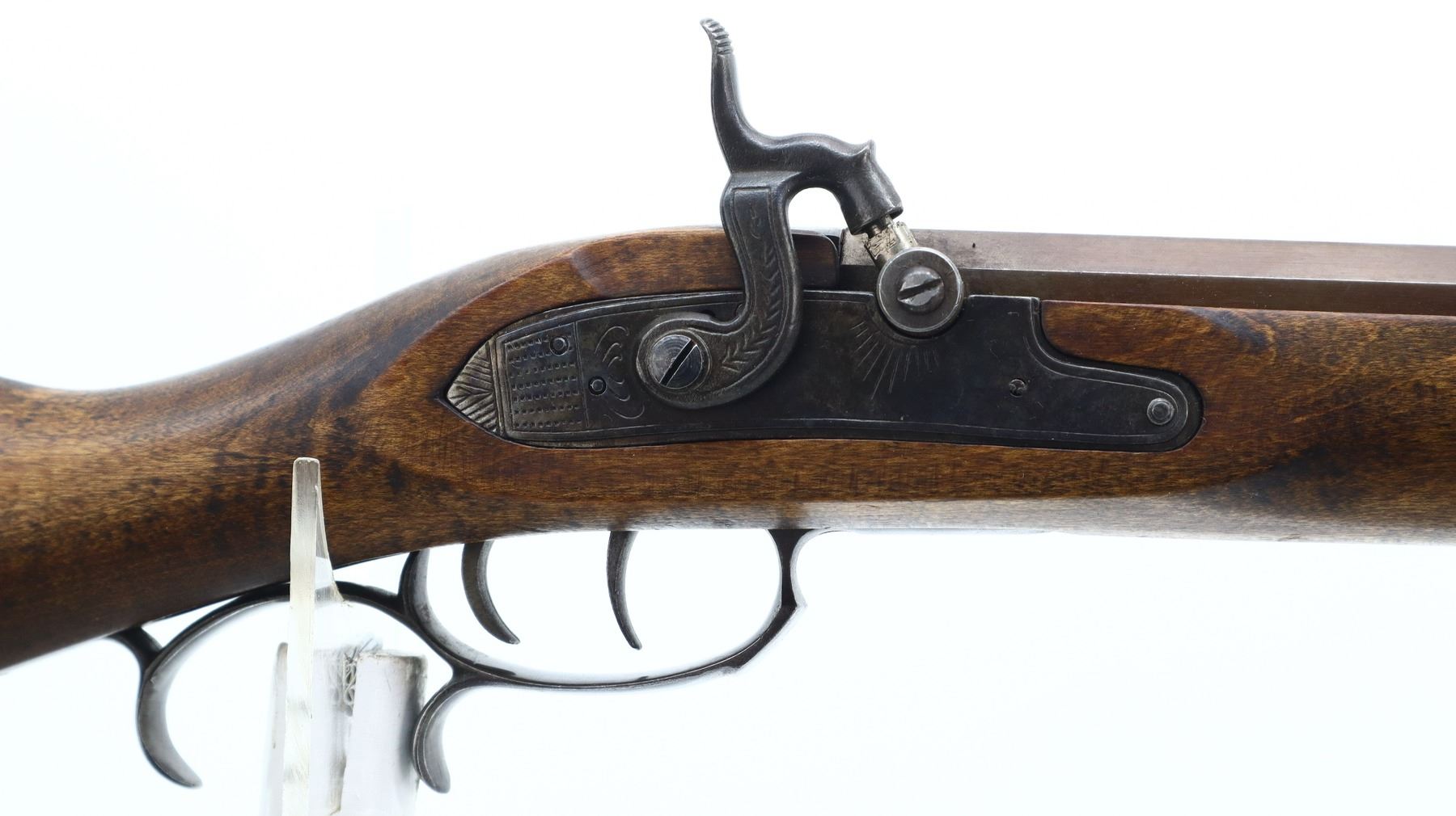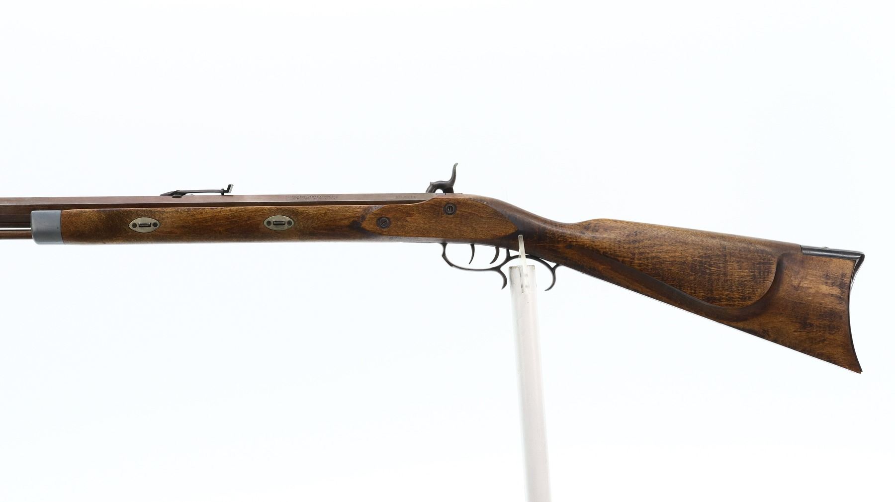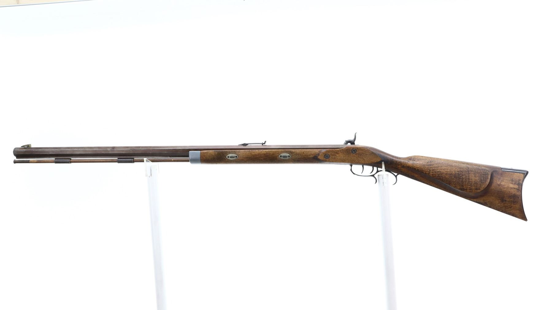 7/10, CVA , MODEL: HAWKEN , CALIBER: 50 CAL, BORE IS FAIR, LIGHT PITTING. BLADE FRONT SIGHT. ADJUSTABLE U NOTCH REAR SIGHT. OCTAGONAL BARREL. ENGRAVED LOCK AND HAMMER, FUNCTIONING. DOUBLE SET TRIGGERS REQUIRE ADJUSTMENT. ONE PIECE SMOOTH 1/2 WOOD STOCK. STRAIGHT GRIP. CHEEK REST. SMOOTH CURVED STEEL BUTT PLATE. STEEL TRIGGER GUARD WITH TRIGGER REST. WOOD RAM ROD WITH BRASS TIP. METAL FINISH TURNING BROWN, WITH SCRATCHES, HANDLING MARKS AND WEAR. STOCK SHOWS MARKS, SCRATCHES AND WEAR. ACTION: PERCUSSION RIFLE , BARREL LENGTH: 31.5", SERIAL # 0100478, CONDITION: 7/10, CLASS: CANADIAN NON RESTRICTED