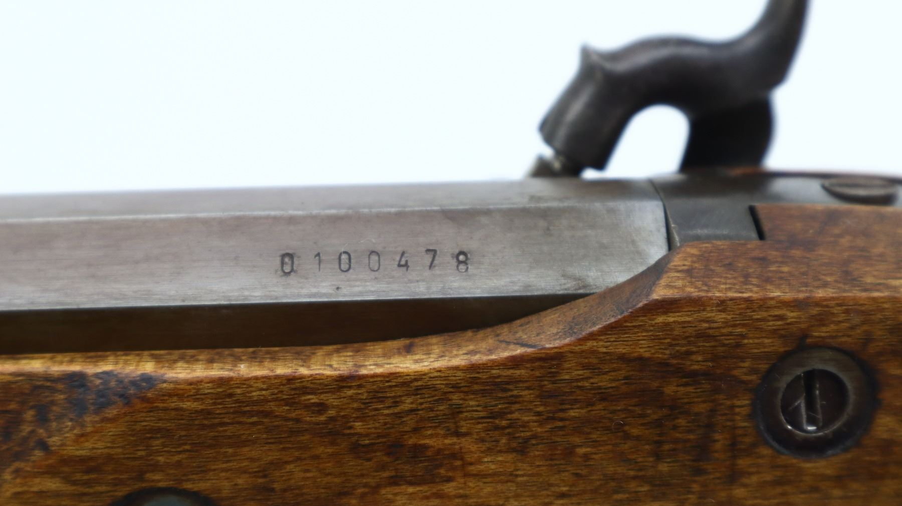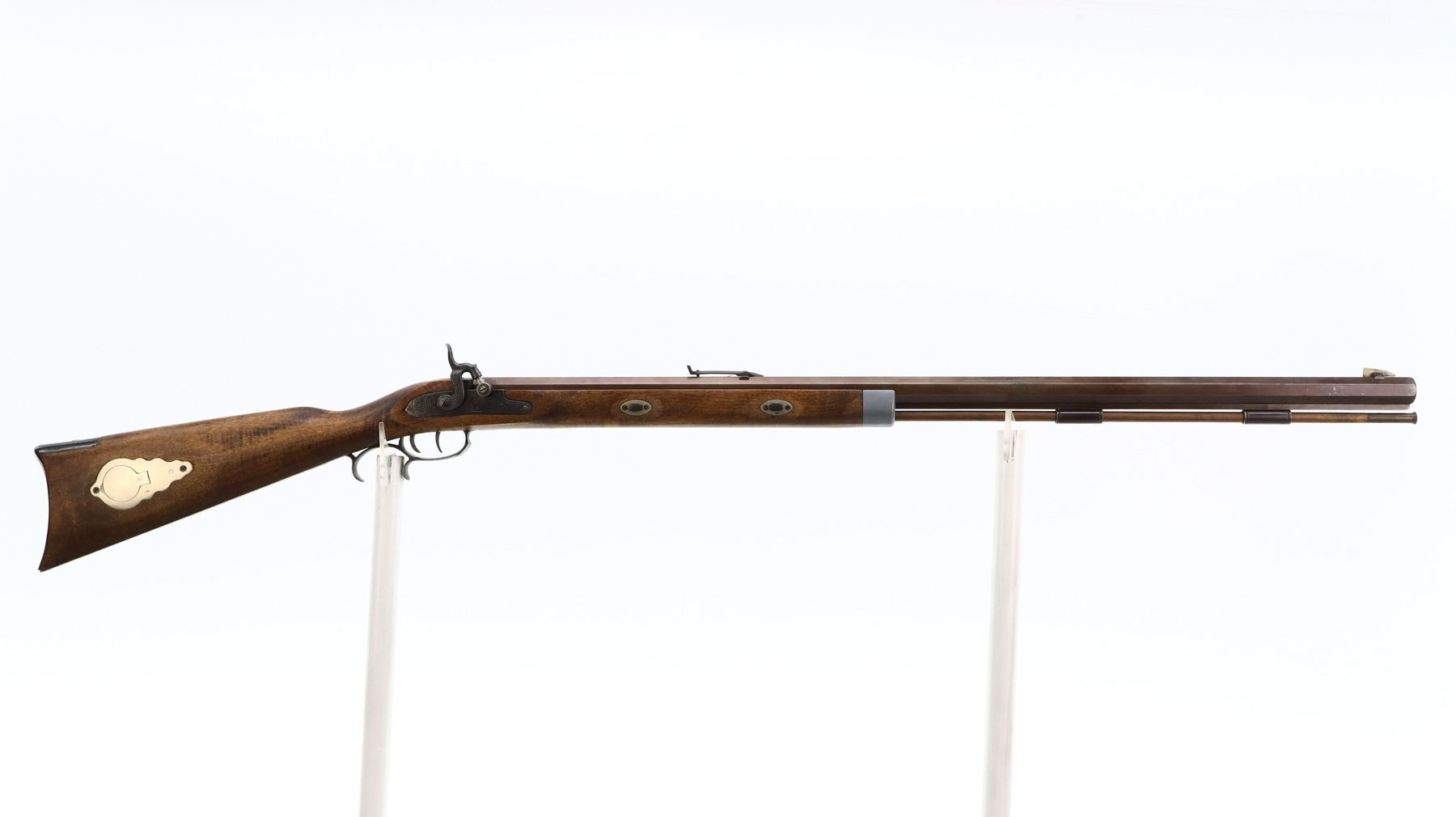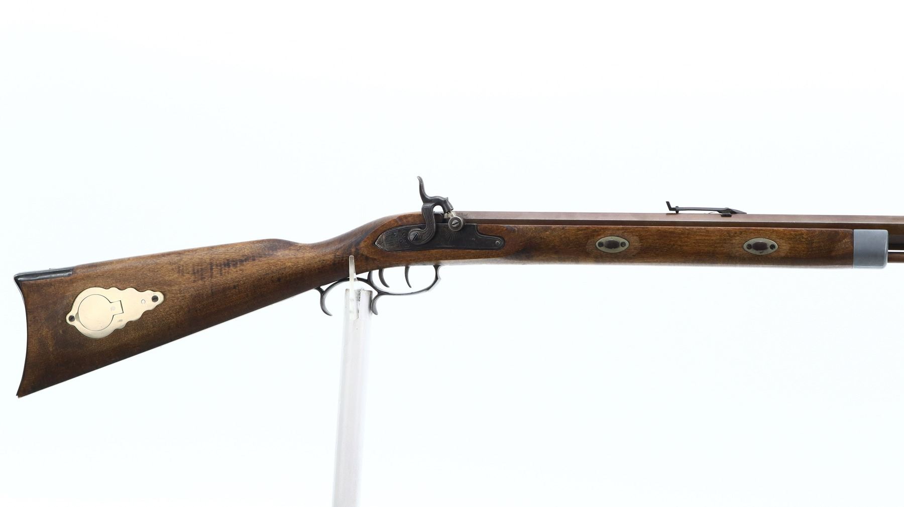 7/10, CVA , MODEL: HAWKEN , CALIBER: 50 CAL, BORE IS FAIR, LIGHT PITTING. BLADE FRONT SIGHT. ADJUSTABLE U NOTCH REAR SIGHT. OCTAGONAL BARREL. ENGRAVED LOCK AND HAMMER, FUNCTIONING. DOUBLE SET TRIGGERS REQUIRE ADJUSTMENT. ONE PIECE SMOOTH 1/2 WOOD STOCK. STRAIGHT GRIP. CHEEK REST. SMOOTH CURVED STEEL BUTT PLATE. STEEL TRIGGER GUARD WITH TRIGGER REST. WOOD RAM ROD WITH BRASS TIP. METAL FINISH TURNING BROWN, WITH SCRATCHES, HANDLING MARKS AND WEAR. STOCK SHOWS MARKS, SCRATCHES AND WEAR. ACTION: PERCUSSION RIFLE , BARREL LENGTH: 31.5", SERIAL # 0100478, CONDITION: 7/10, CLASS: CANADIAN NON RESTRICTED