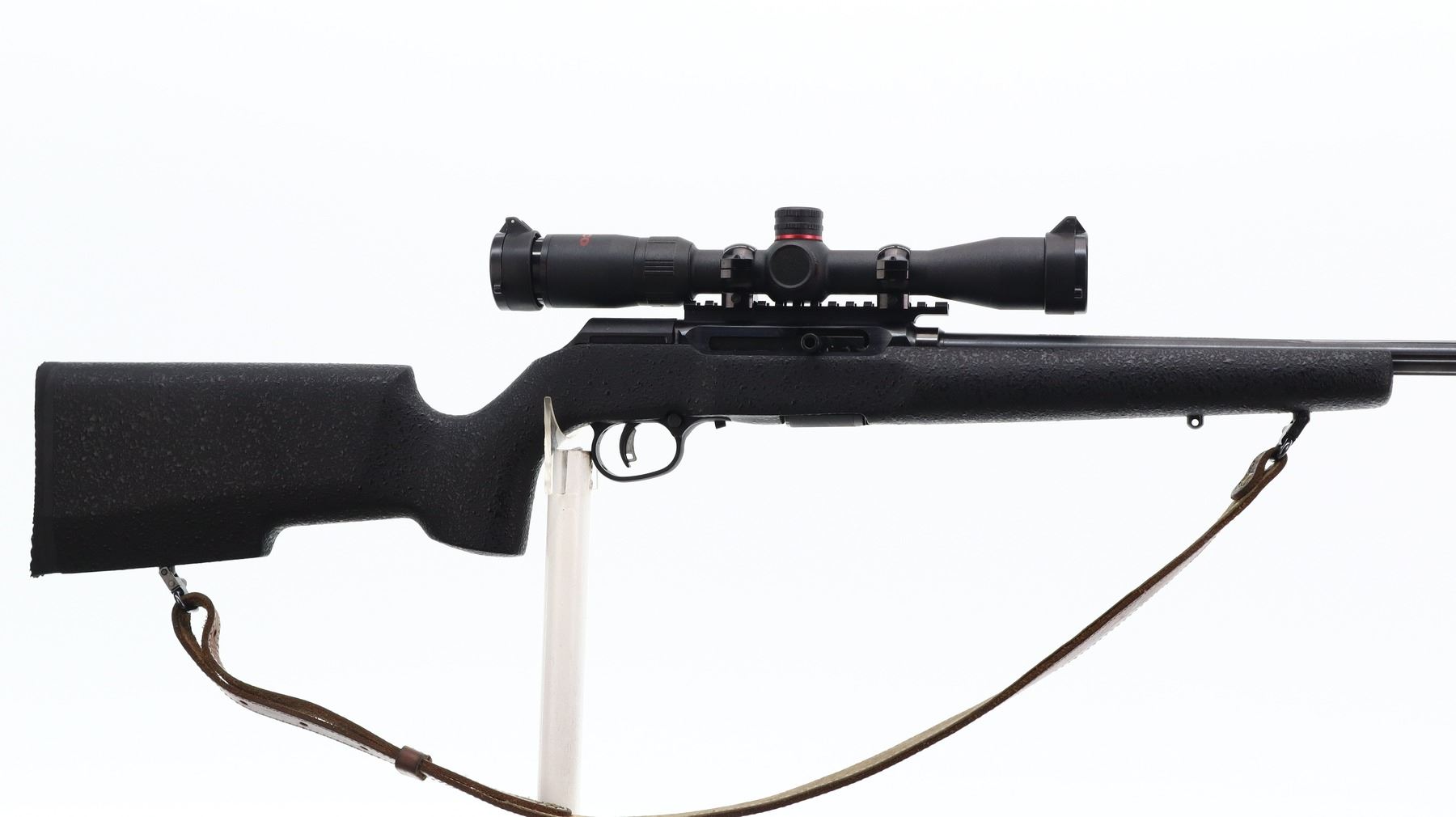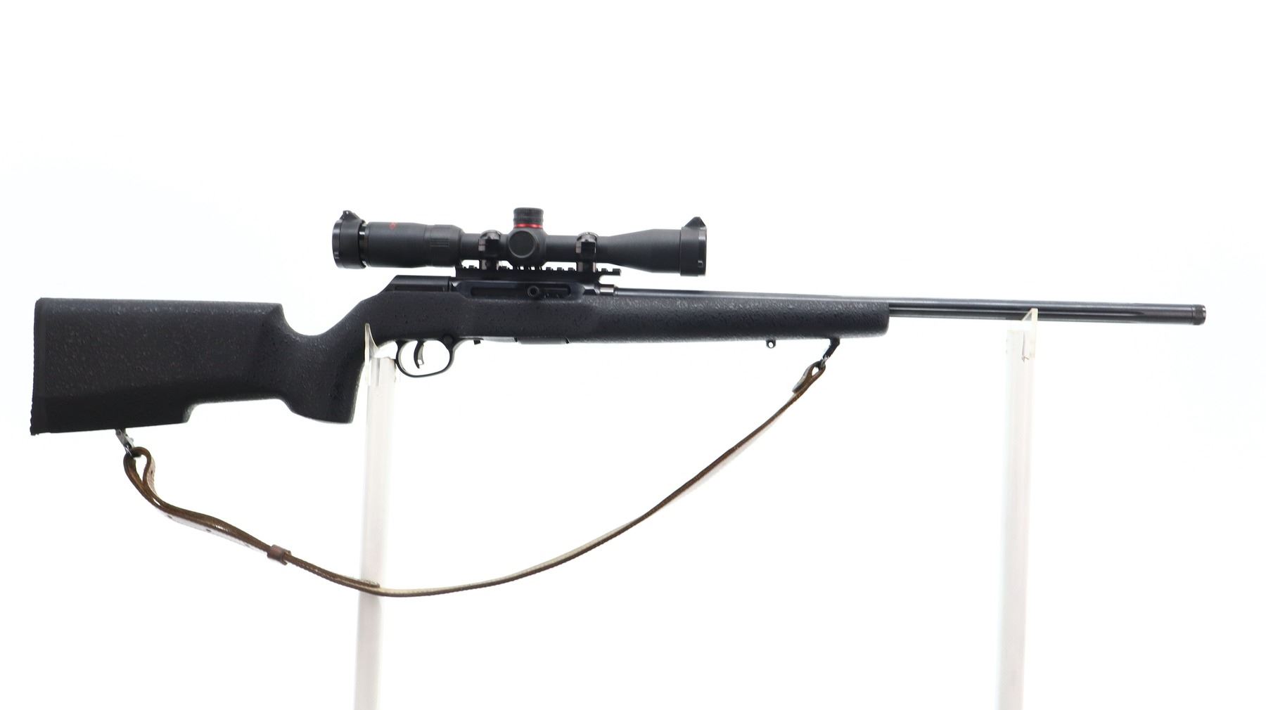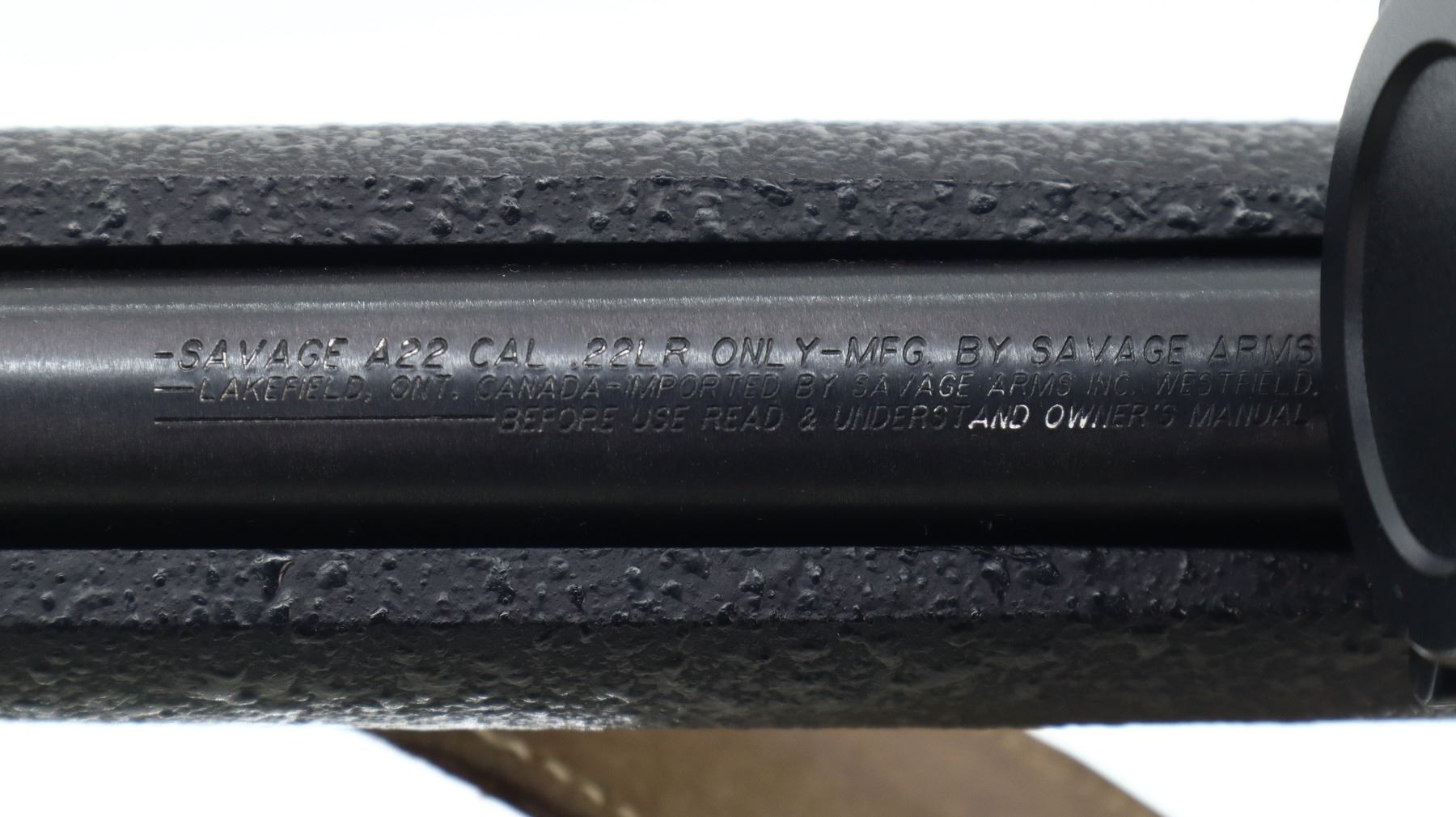 8/10, SAVAGE, MODEL: A22, CALIBER:22 LR, COMES WITH MAGAZINE, BORE IS VERY GOOD. FLUTED ROUND BARREL. NO SIGHTS. THREADED MUZZLE WITH CAP. BLUED FINISH. RECEIVER DRILLED AND TAPPED WITH TASCO 4X32 SCOPE, CLEAR OPTICS, DUPLEX CROSSHAIR. ONE PIECE TEXTURED BLACK SYNTHETIC STOCK. PISTOL GRIP. CHECKERED BLACK POLYMER BUTT PLATE. ACCU TRIGGER. SWIVELS WITH BROWN LEATHER SLING. METAL FINISH SHOWS SOME SCRATCHES, HANDLING MARKS AND WEAR. STOCK SHOWS SOME MARKS, AND SCRATCHES. , ACTION: SEMI AUTOMATIC RIFLE , BARREL LENGTH: 22", SERIAL# 3174527, CONDITION: 8/10, CLASS: CANADIAN NON RESTRICTED