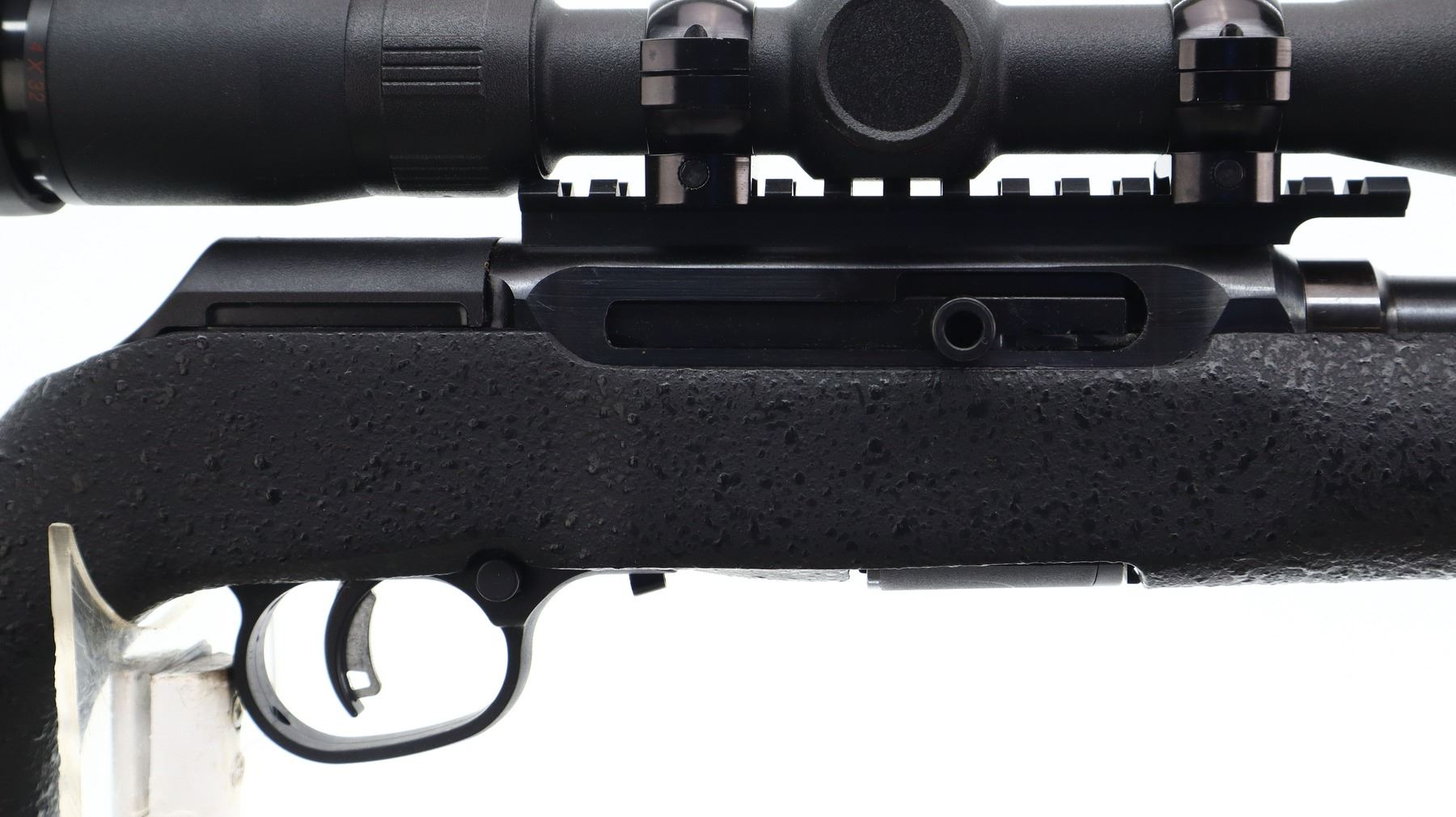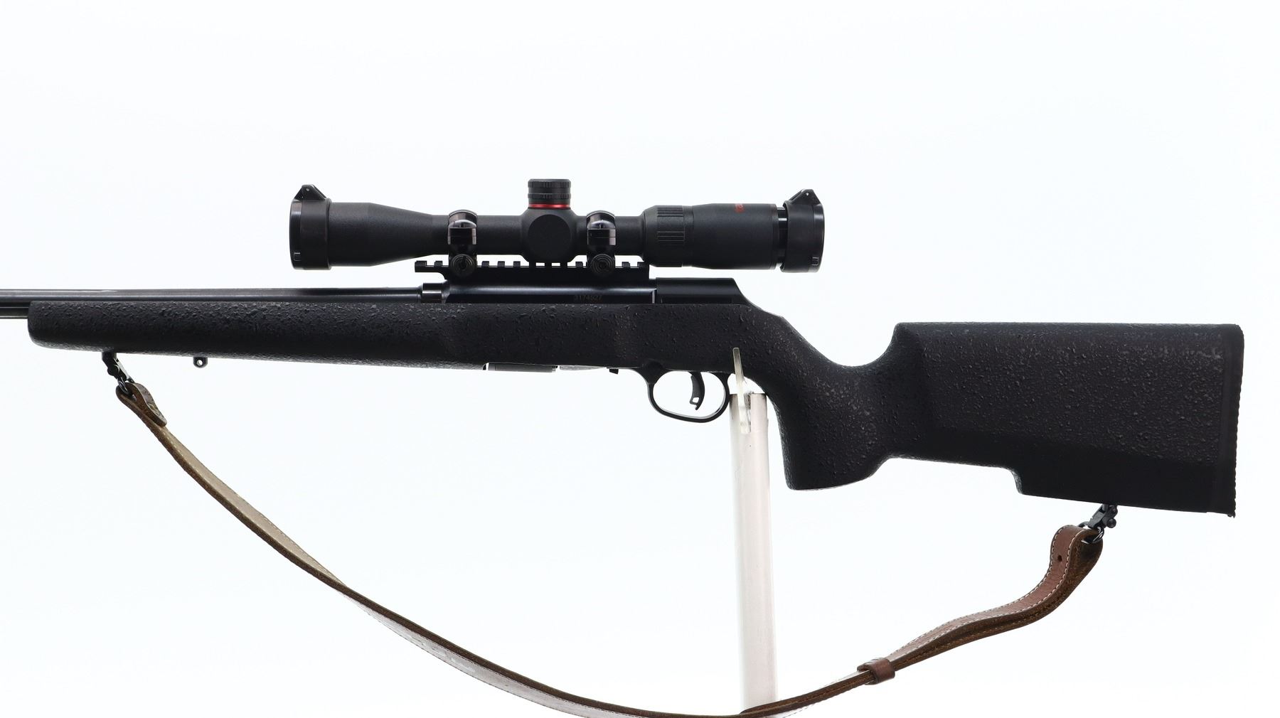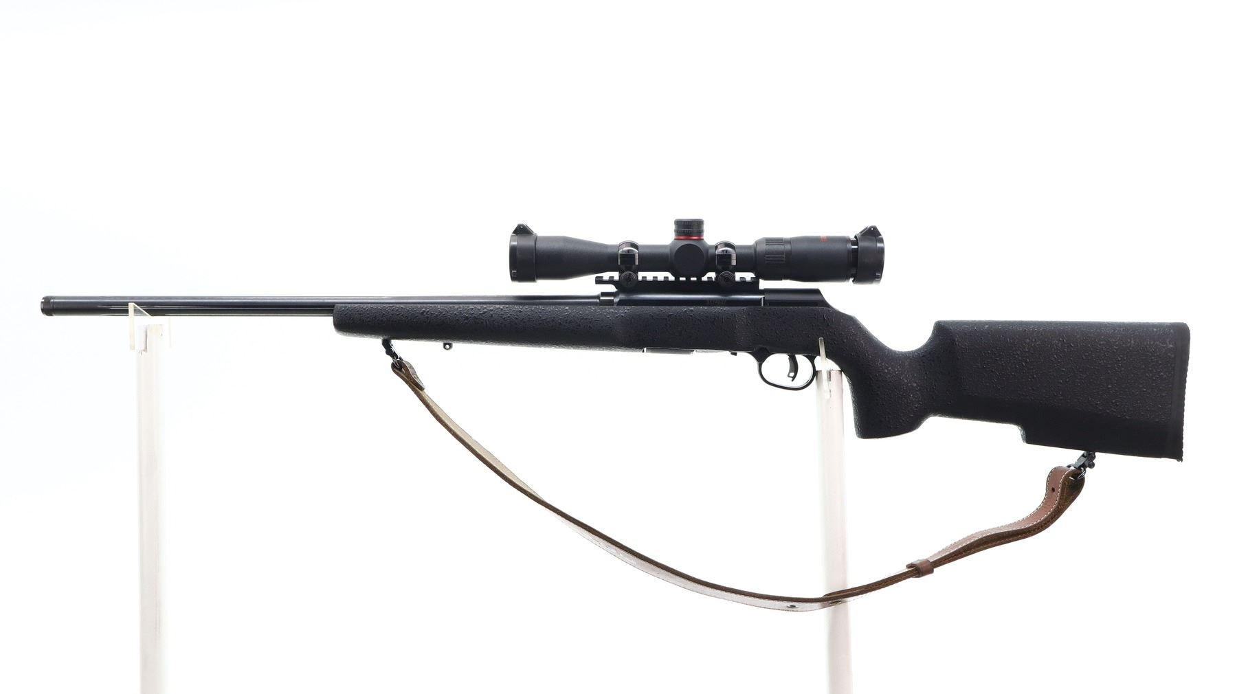 8/10, SAVAGE, MODEL: A22, CALIBER:22 LR, COMES WITH MAGAZINE, BORE IS VERY GOOD. FLUTED ROUND BARREL. NO SIGHTS. THREADED MUZZLE WITH CAP. BLUED FINISH. RECEIVER DRILLED AND TAPPED WITH TASCO 4X32 SCOPE, CLEAR OPTICS, DUPLEX CROSSHAIR. ONE PIECE TEXTURED BLACK SYNTHETIC STOCK. PISTOL GRIP. CHECKERED BLACK POLYMER BUTT PLATE. ACCU TRIGGER. SWIVELS WITH BROWN LEATHER SLING. METAL FINISH SHOWS SOME SCRATCHES, HANDLING MARKS AND WEAR. STOCK SHOWS SOME MARKS, AND SCRATCHES. , ACTION: SEMI AUTOMATIC RIFLE , BARREL LENGTH: 22", SERIAL# 3174527, CONDITION: 8/10, CLASS: CANADIAN NON RESTRICTED