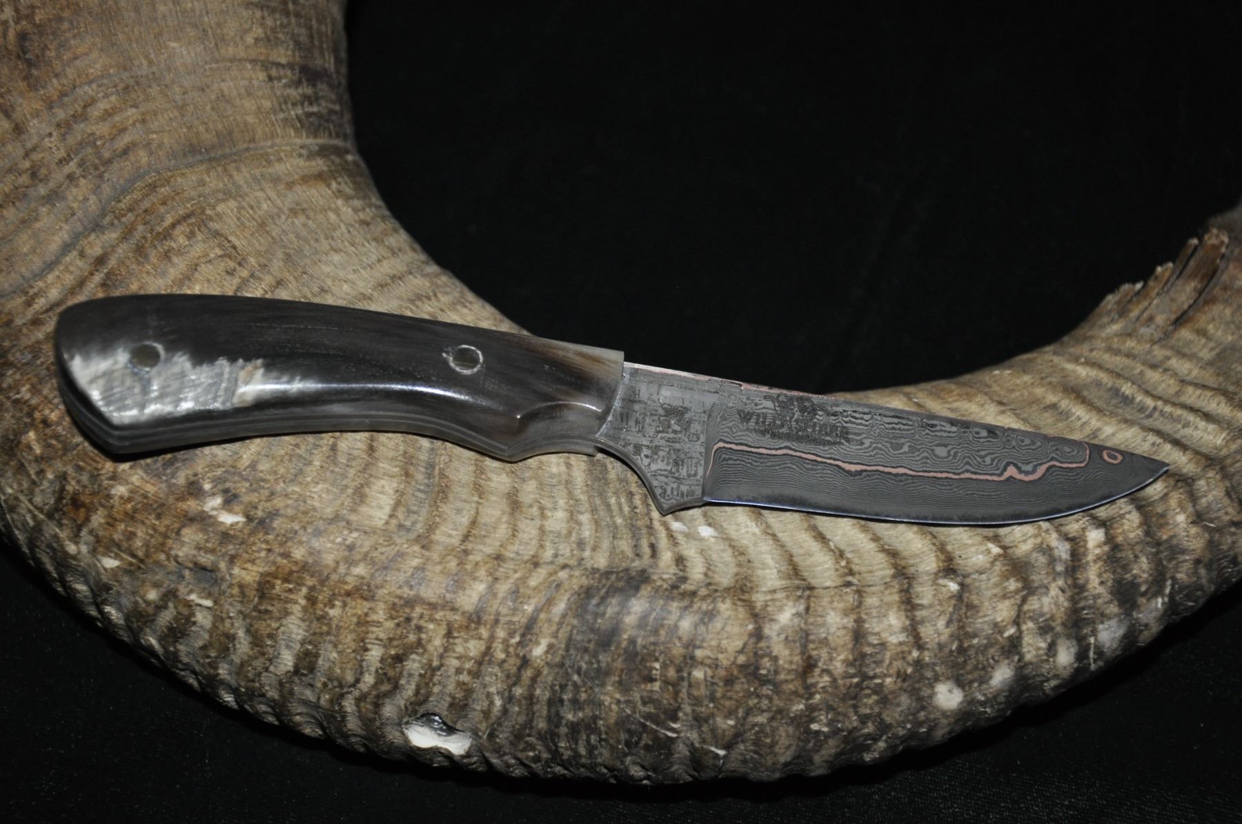 CUSTOM KNIFE FEATURING CUI MAI DAMASCUS BLADE & SHEEP HORN HANDLE WITH LEATHER SHEATH BOTH HAVE WSF LOGO ENGRAVING