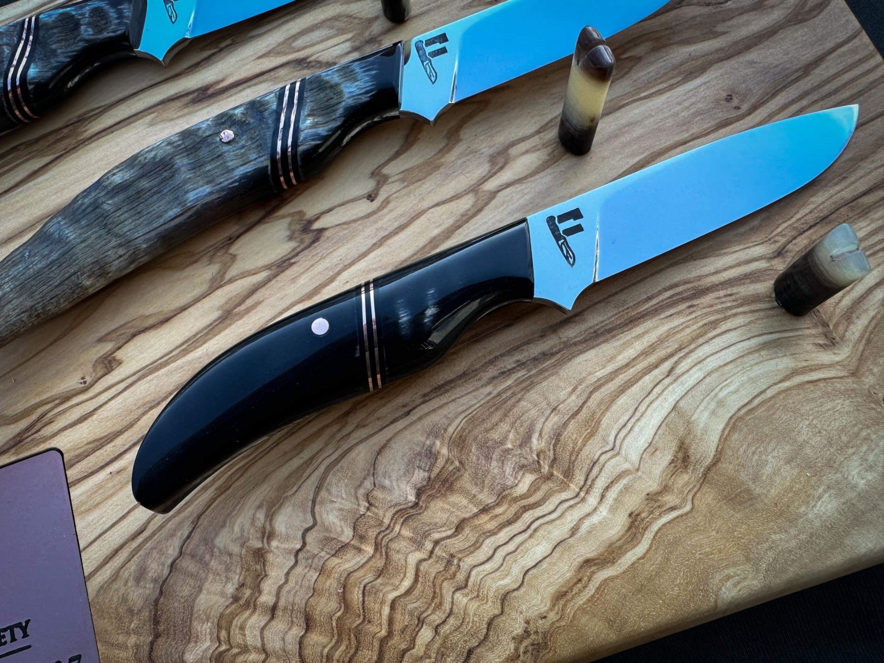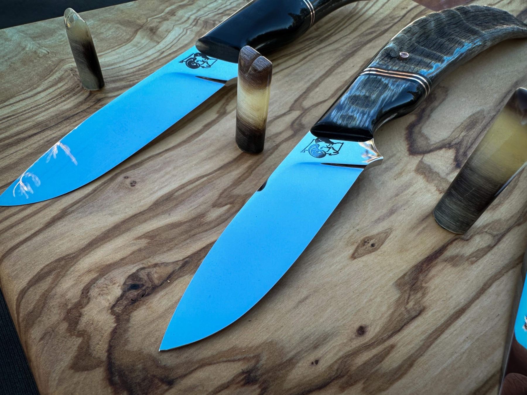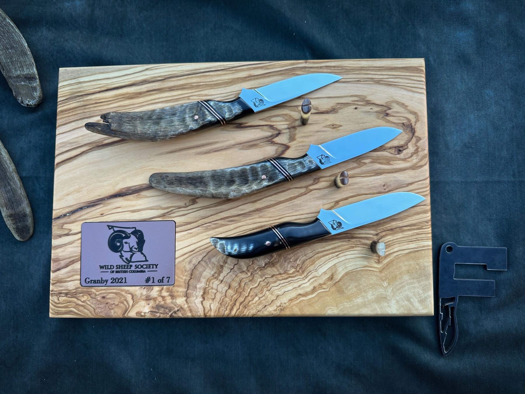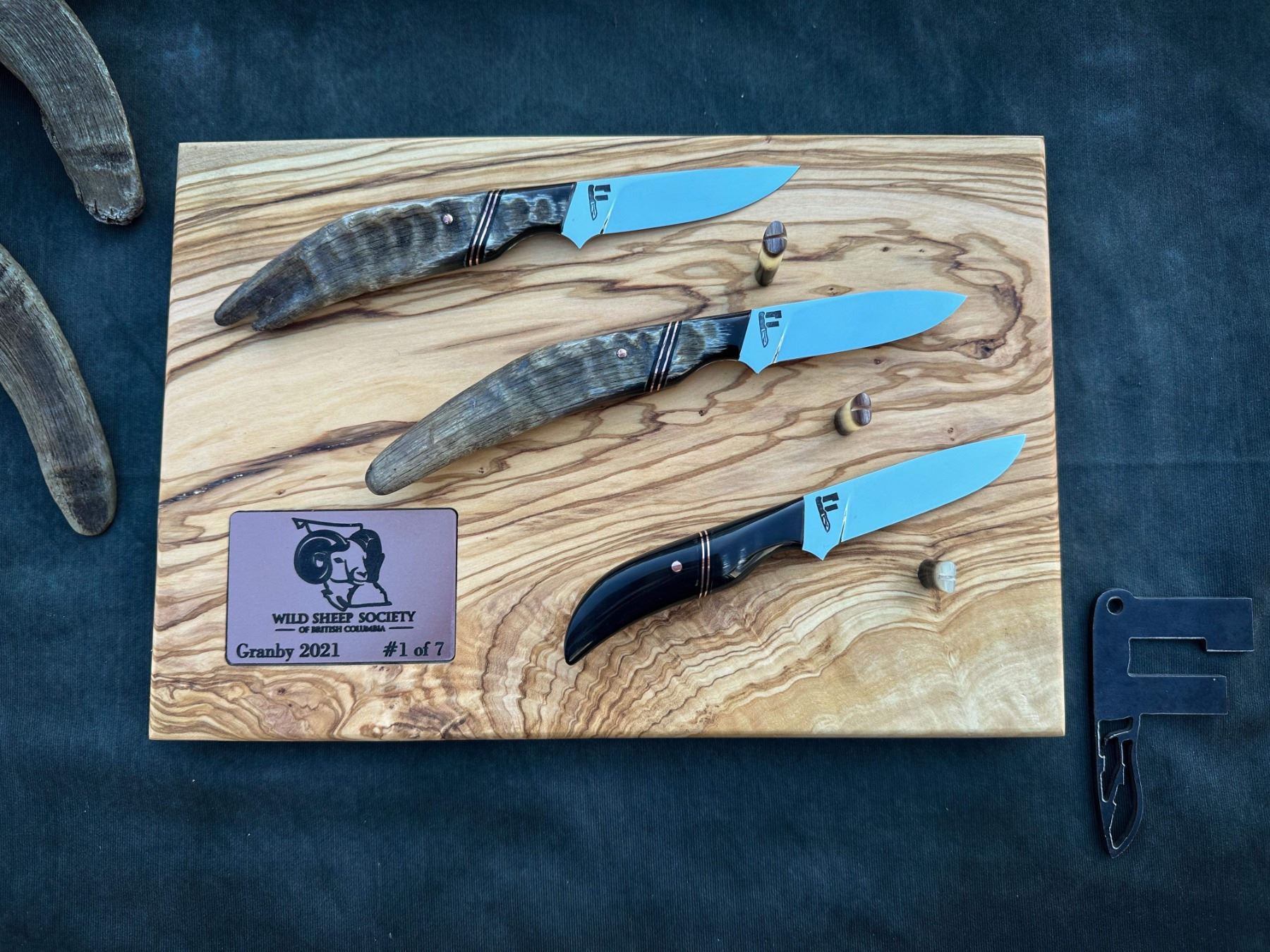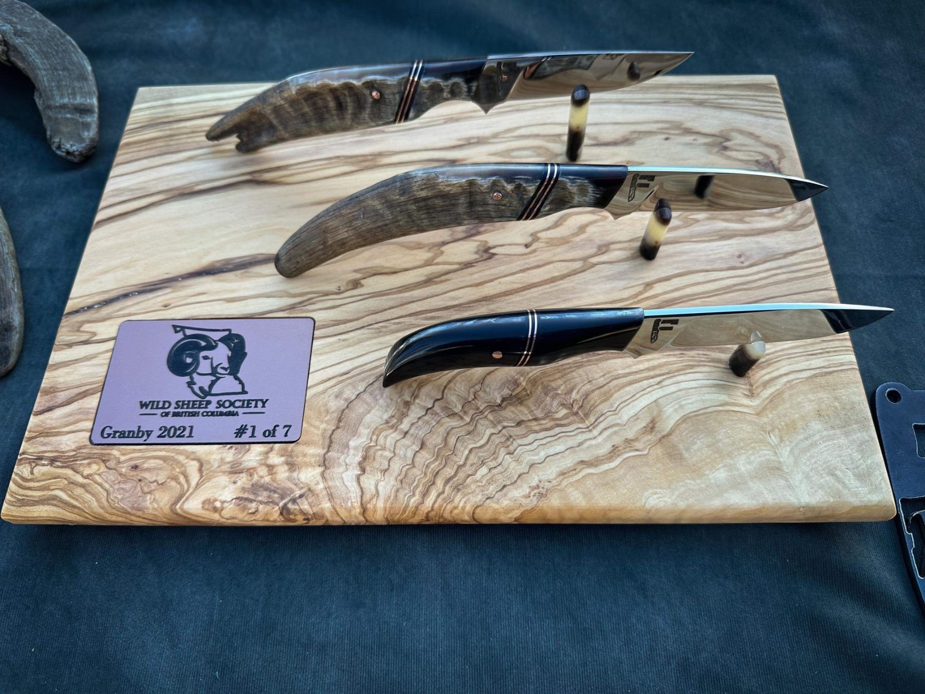 DONATION: Number 1 of 7 WSSBC Granby Bighorn Set: Three matching custom hidden tang caping knives. This is number one of seven custom sets, inspired by the Granby Bluetongue Virus die-off in 2021. Two blades have raw handles highlighting the lamb tips from each side of the horns. The third has horn from both sides bred together. All blades are mirror polished with copper liners and hardware along with custom carved leather Scout carry sheaths, on a custom numbered display stand and plaque. The blades are Nitro-V Stainless steel at 61HRC. Each set includes a numbered and custom-carved, handmade leather rifle sling.