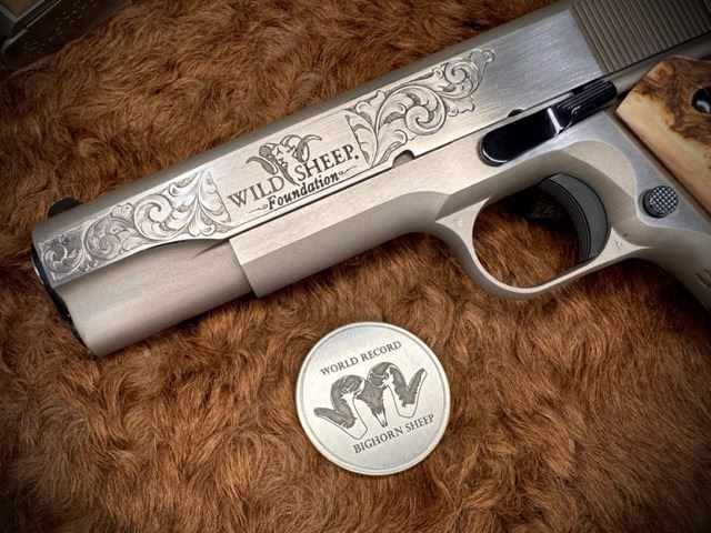 DONATION: Custom designed Colt 1911 four guns of the World Record Ram Series. Each gun will feature hand-chased engraving, custom finish work and ram horn grips of the four species of wild sheep. Each gun will have a custom wood presentation case and include a unique challenge coin for each species.