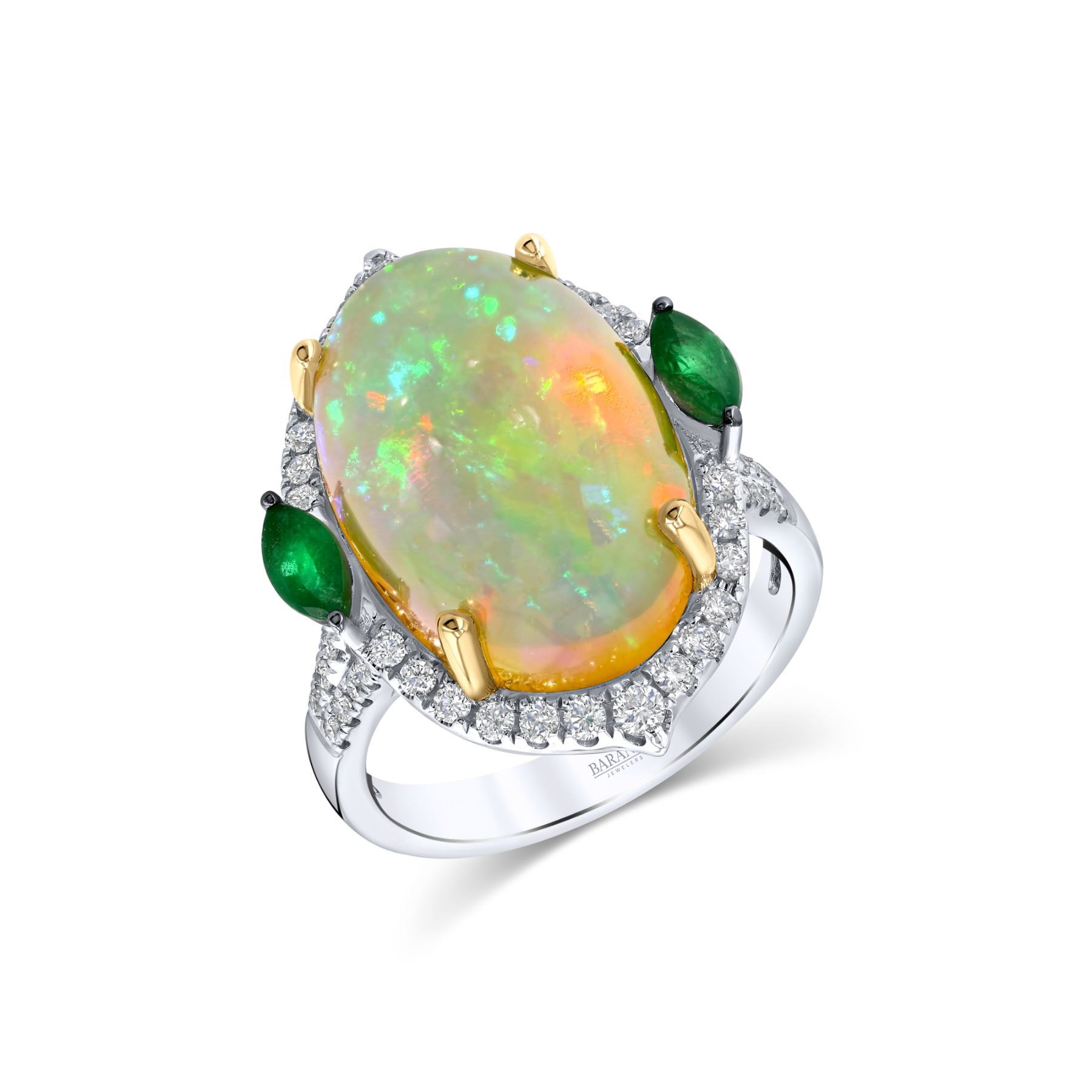 NATURAL OPAL, EMERALD, AND DIAMOND RING SET IN 18K GOLD