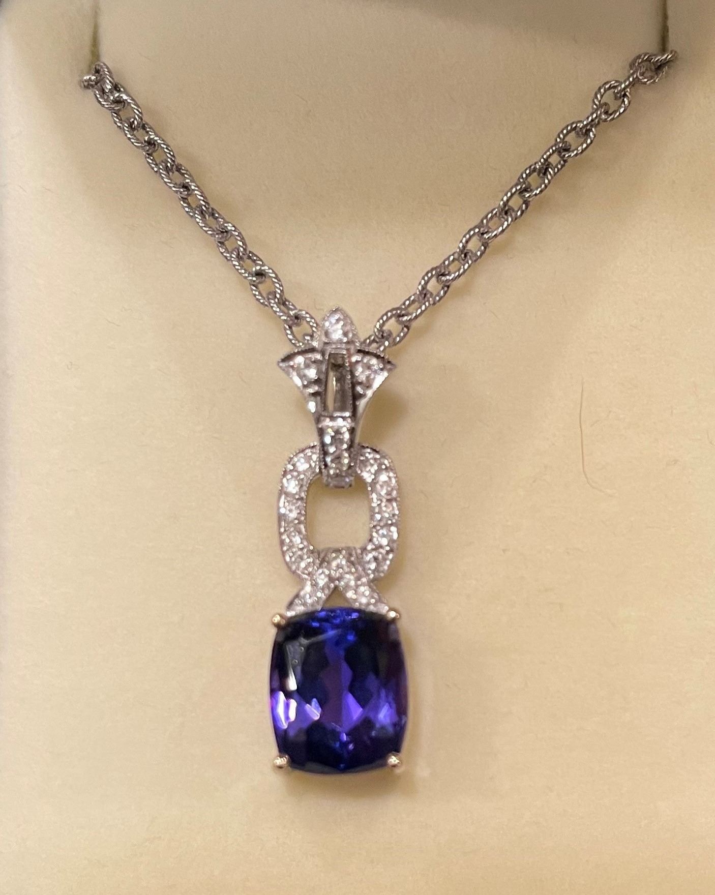 DONATION: This beautiful 18K white gold tanzanite and diamond pendant is rectangular cushion faceted. 6.5ct Tanzanite, bV, 6/4 in color. The diamonds are round full cut and weigh .02ct each 22 diamonds in all. Vs clarity and G-H color. Comes with a beautiful 18K white gold fancy engraved cable link chain.