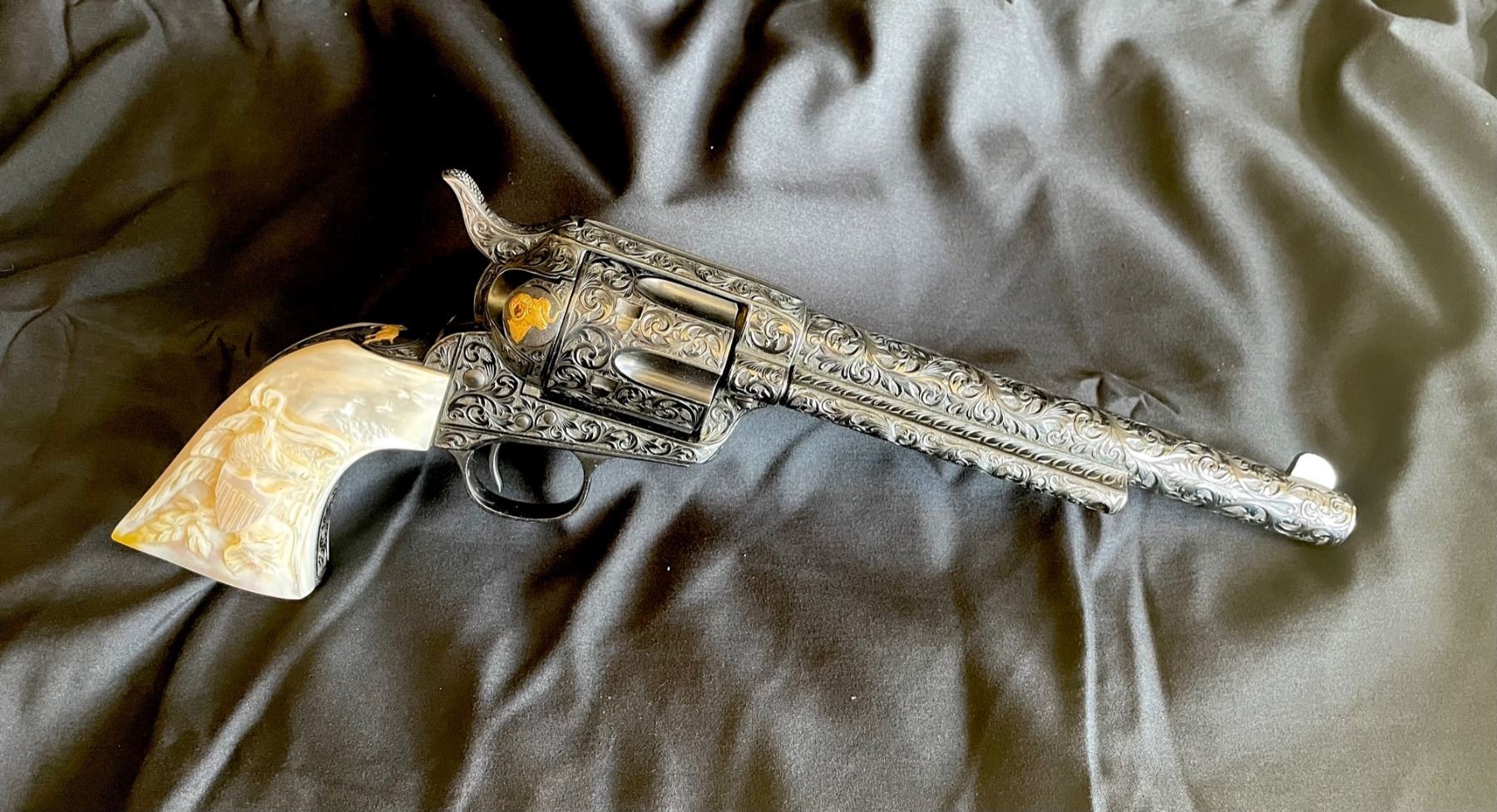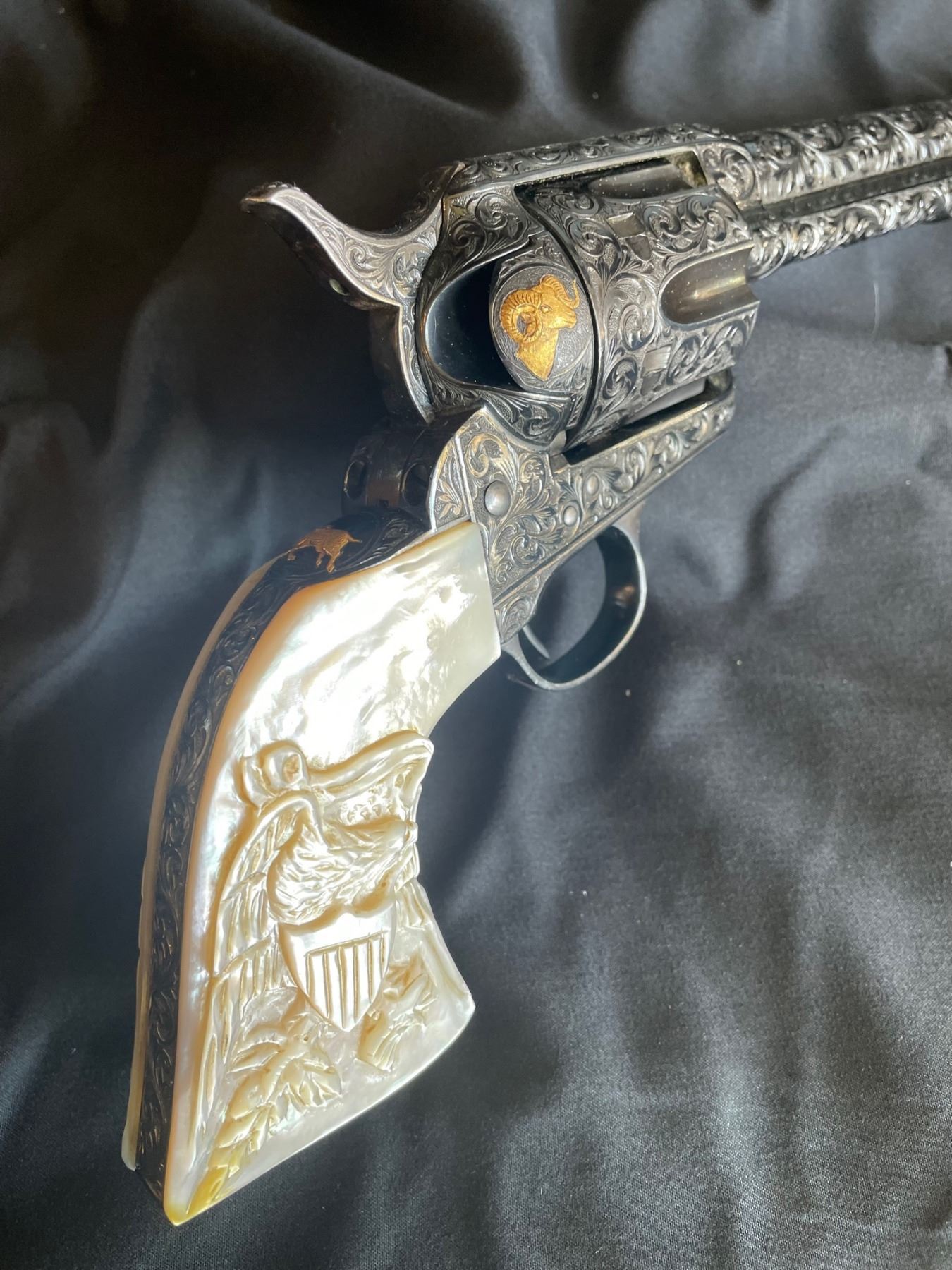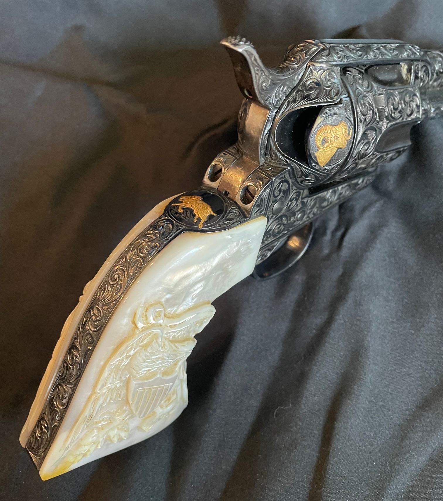 DONATION: Beautifully engraved Colt First Generation Single Action Army with engraving blue finish with gold inlay sheep head and boar. Mother of Pearl carved grips. Made in 1899.