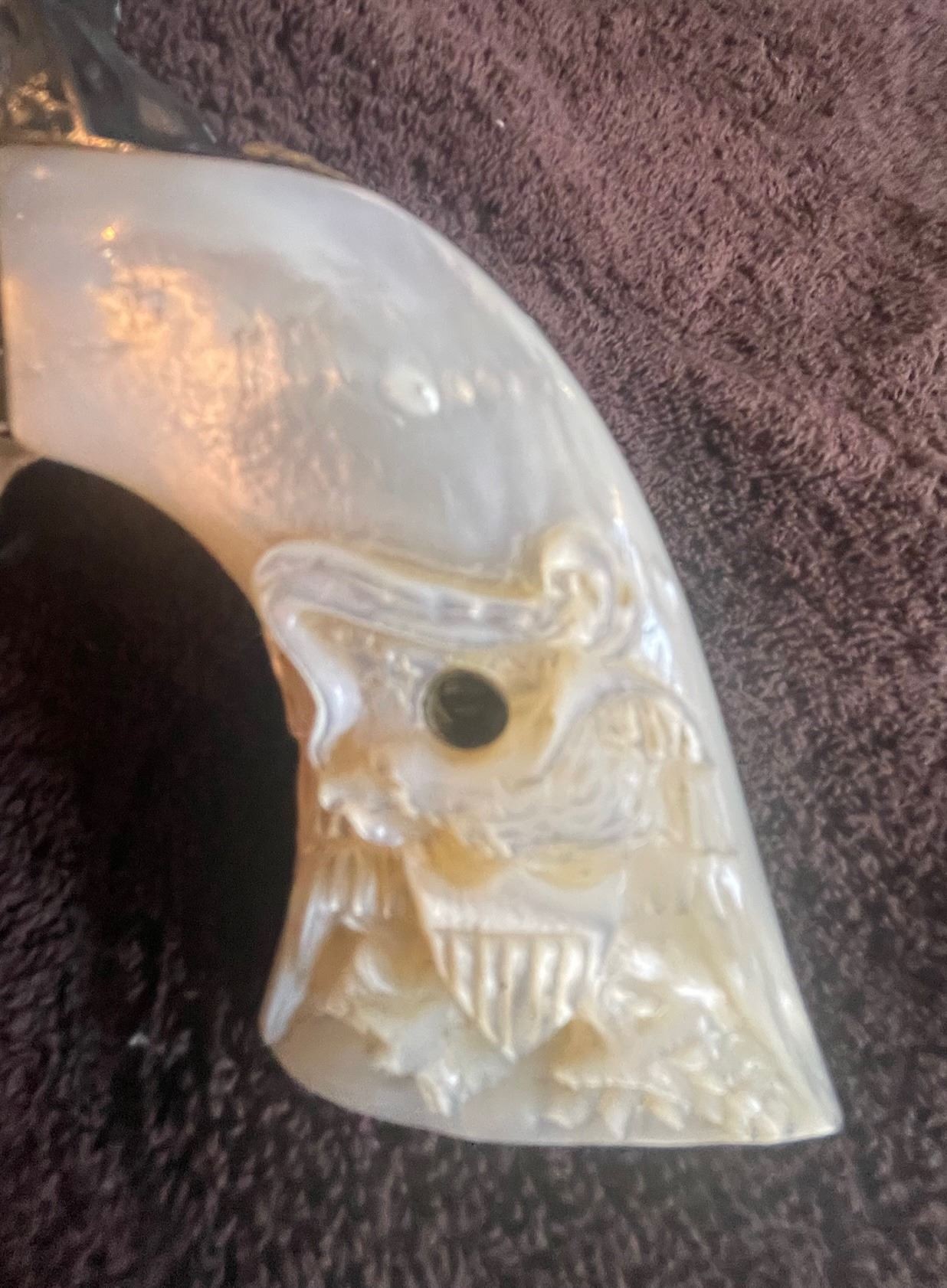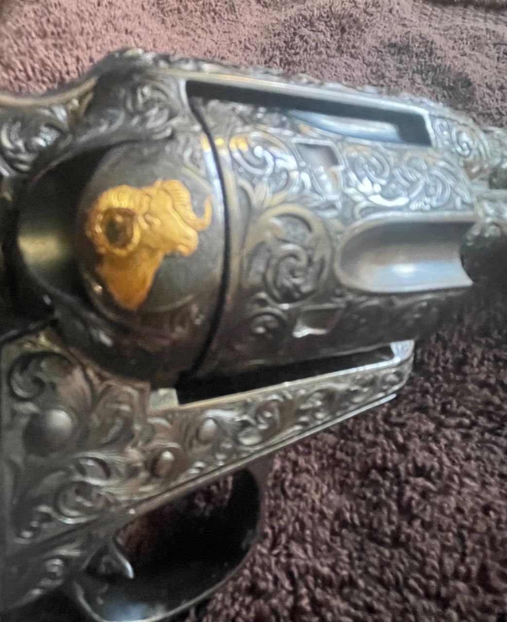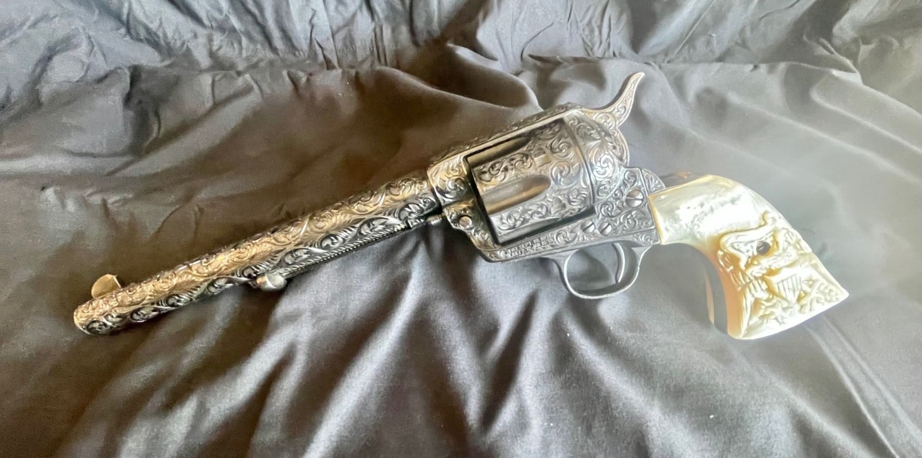 DONATION: Beautifully engraved Colt First Generation Single Action Army with engraving blue finish with gold inlay sheep head and boar. Mother of Pearl carved grips. Made in 1899.