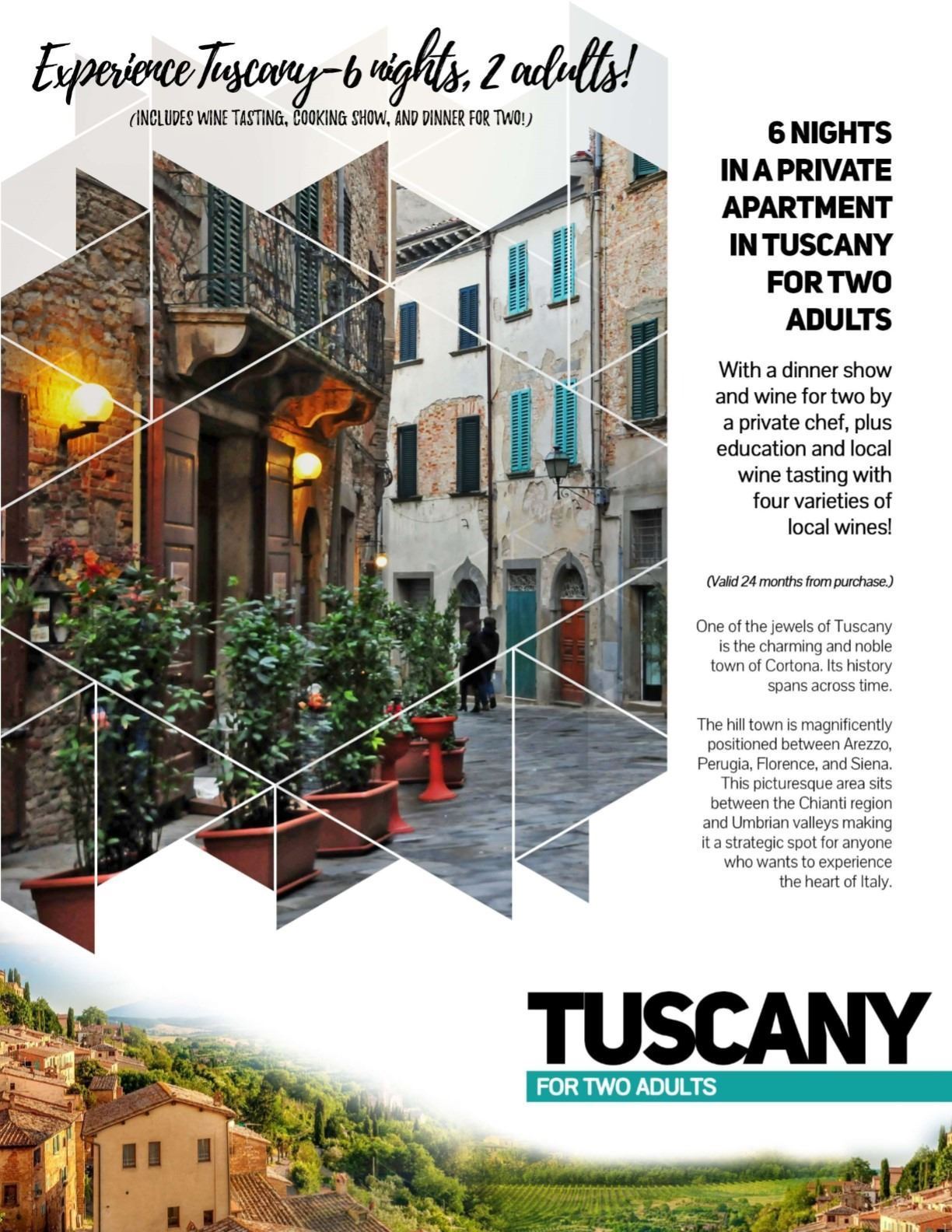 Tuscany Life w/ Friends: Enjoy Cortona, Italy with friends in a private two bed/two bath apartment plus dinner show and wine by a private chef and education and local wine tasting with 4 varieties. 6 Nights | 4 Adults