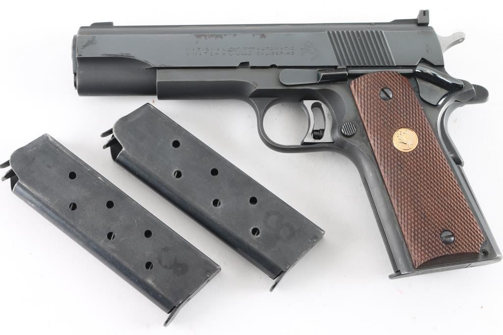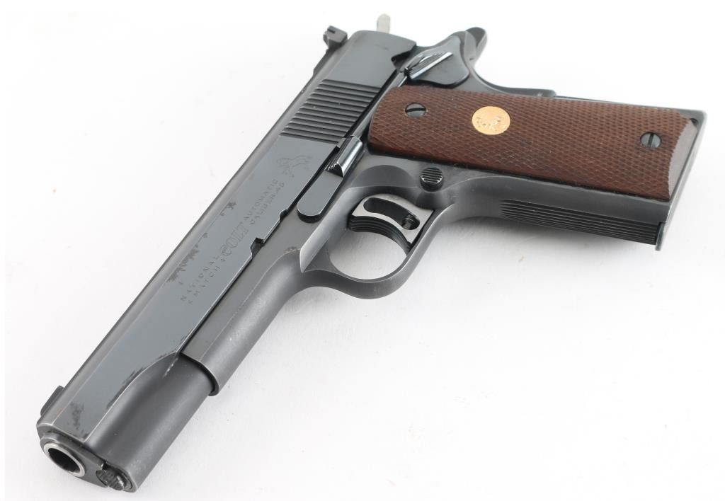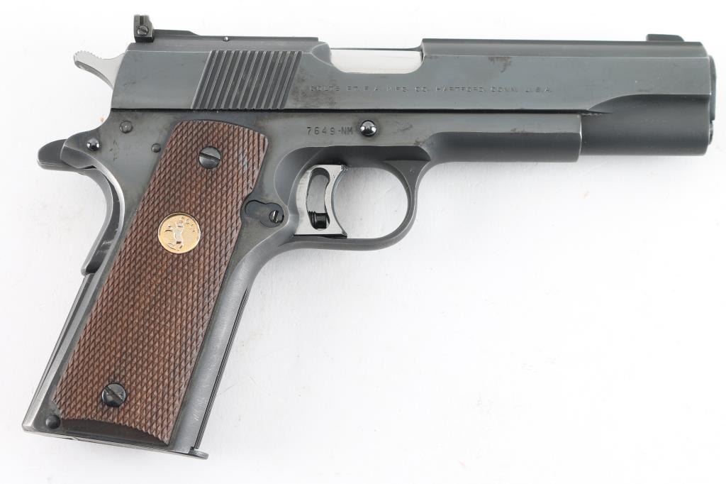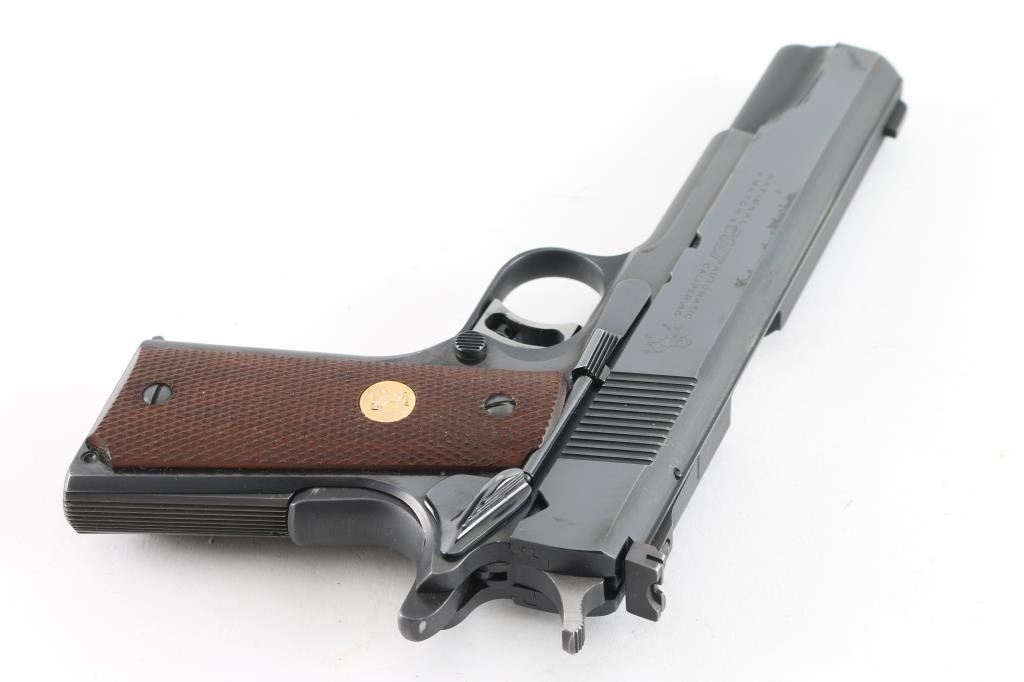 Vintage high quality 1911-A1 style semi-automatic pistol chambered in .45 Automatic, built for National Match competition circa 1961. Features a high polish/matte blued finish, 5" N.M. barrel, patridge front sight, adjustable rear window sight, adjustable wide serrated trigger, serrated hammer spur, thumb safety, beavertail grip safety, push button magazine release, 7 round factory magazine, serrated front strap, serrated mainspring housing, and two-piece checkered walnut grips with Colt medallions. Includes a factory hard case. Pistol exhibits approximately 90% of it's original blued finish showing slight muzzle wear, some light handling marks/scratches and a few small scattered areas of pin prick pitting. Action is strong, bore is excellent and wood grips are fine. Condition is NRA Very Good+++ ***C&R Firearm*** ***Modern Firearm***
