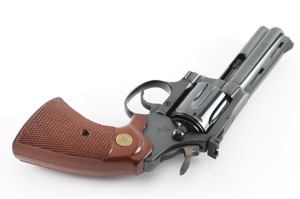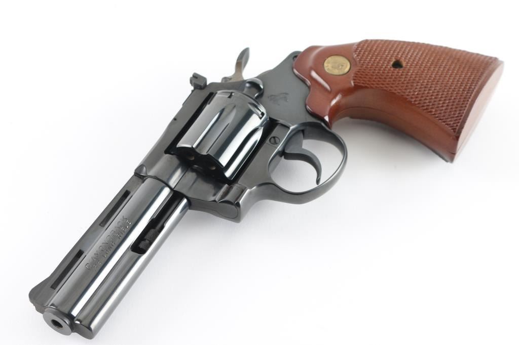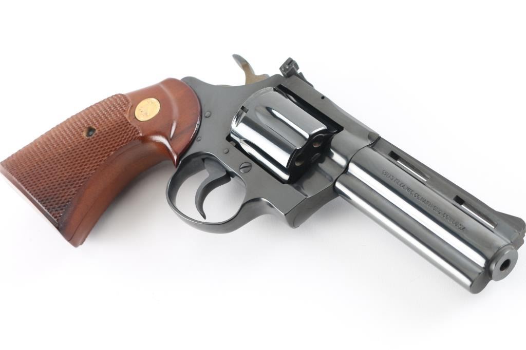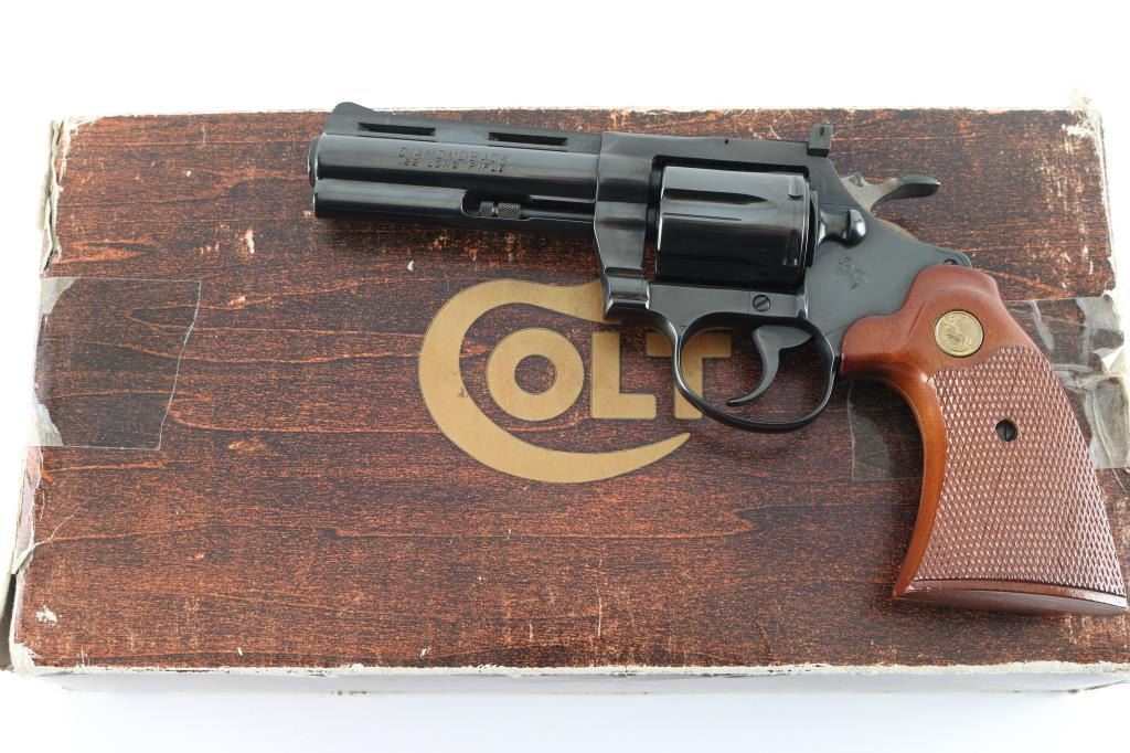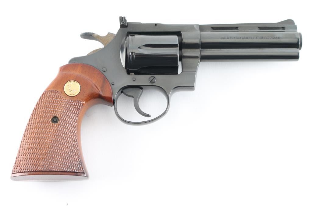 High Quality double action revolver manufactured circa 1977. Features blued finish, checkered wood grips with Colt medallions, 4" barrel with full length underlug and vent rib, adjustable sights, 6 shot fluted cylinder. Bore and charge holes are excellent. Retains 98% blue with few signs of handling or use, slight drag line, small area of patina on left side of hammer. Grips are excellent condition. Action is smooth with tight lock-up. Includes Colt styrofoam box with fair condition wood grained sleeve, manual. Condition is near NRA Excellent *** Modern Firearm ***