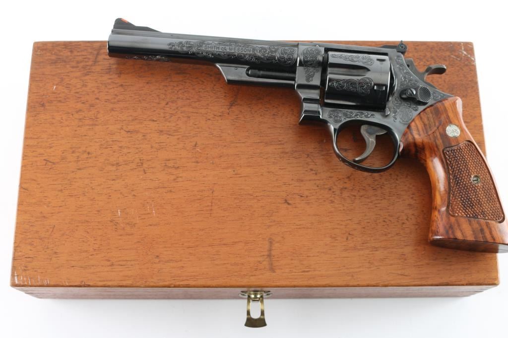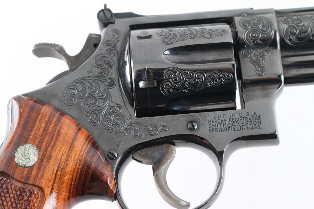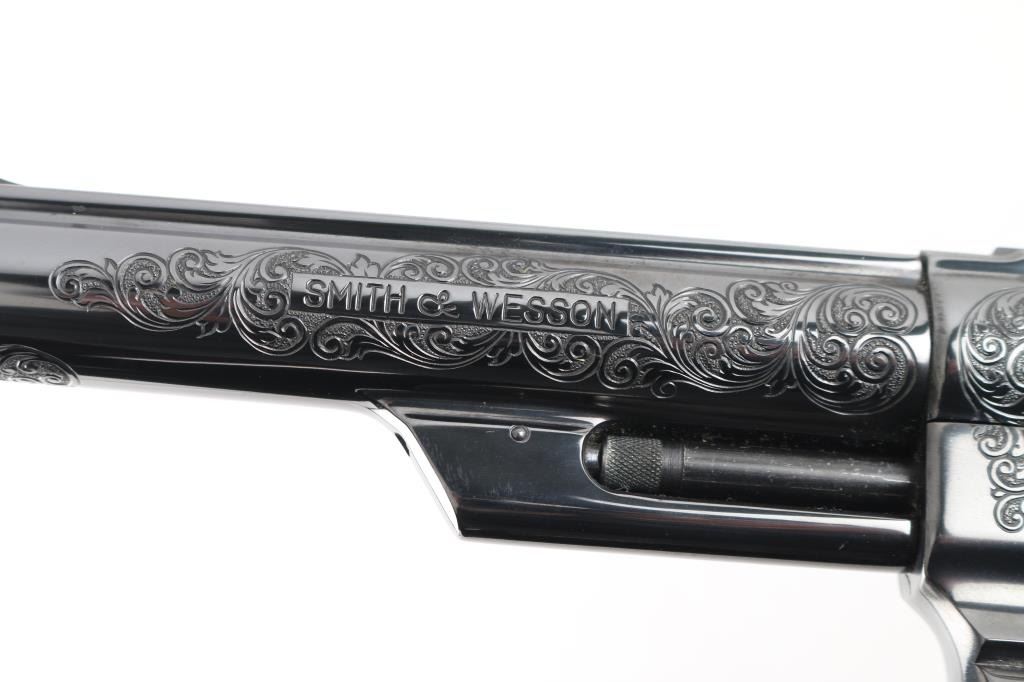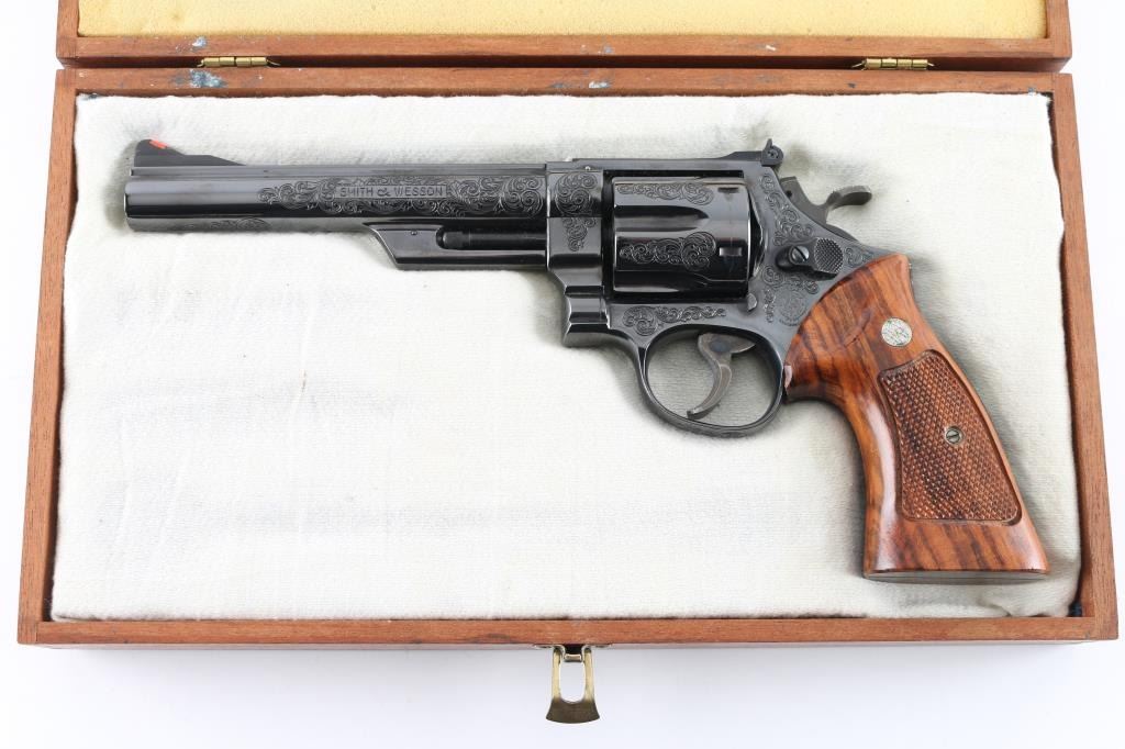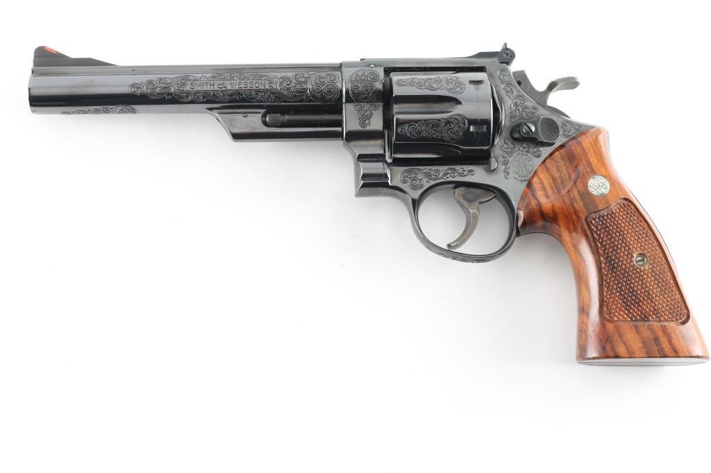 Engraved large frame double action revolver manufactured circa 1966-67. Features blued finish, 6.5" ribbed barrel, raised ramp front sight with orange insert, adjustable micrometer click rear sight with white outline, serrated target trigger, knurled target hammer, fluted six shot cylinder, square butt 3 screw N frame and two-piece checkered wood target grips with S&W medallions. Bore and charge holes are excellent. Retains 98% finish with minor handling marks, drag line on cylinder. Grips are excellent. Engraving is floral scroll motif, covering approx 50% of visible surfaces. Includes hinged lid walnut case with factory cleaning gear & screwdriver, some paperwork. Condition is NRA Excellent *** C&R Firearm ***