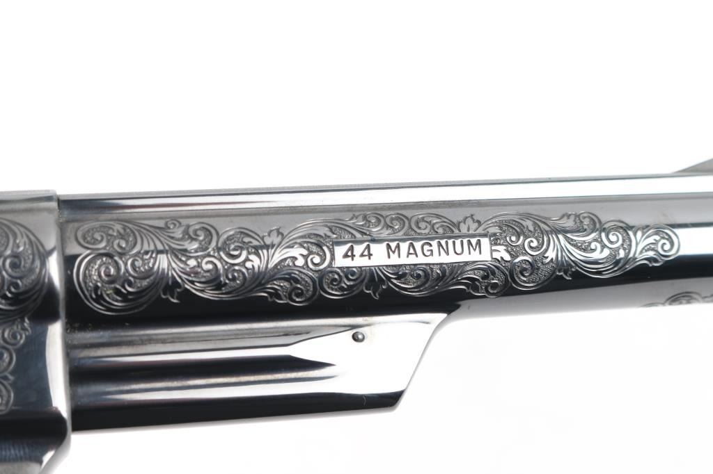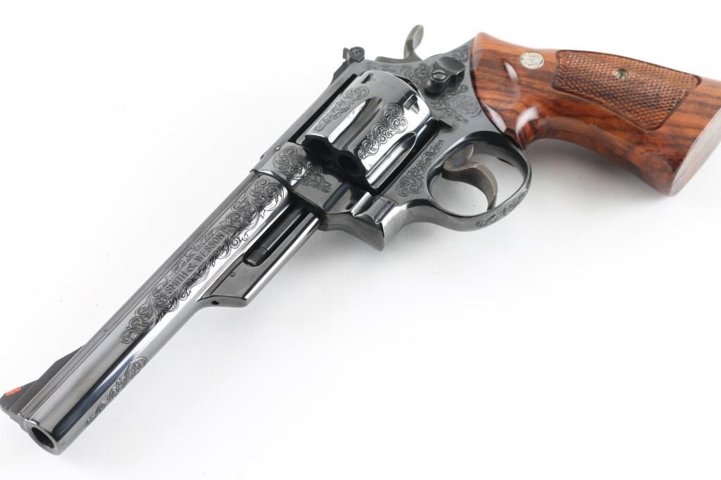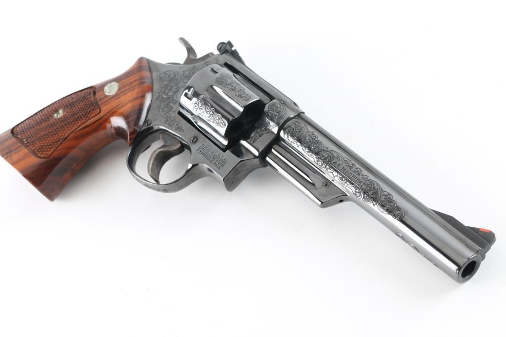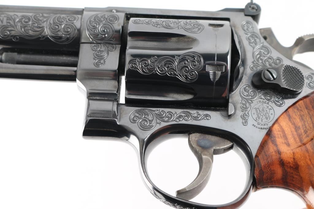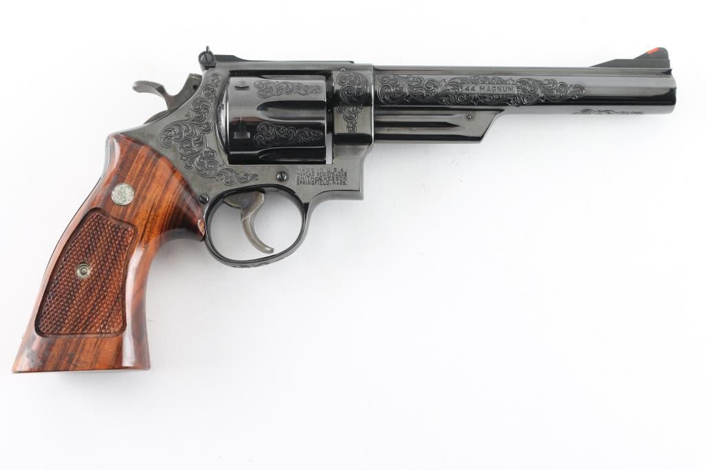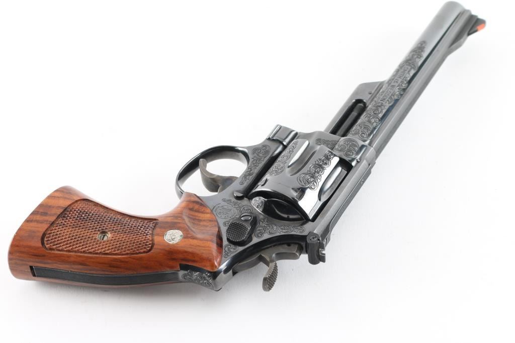 Engraved large frame double action revolver manufactured circa 1966-67. Features blued finish, 6.5" ribbed barrel, raised ramp front sight with orange insert, adjustable micrometer click rear sight with white outline, serrated target trigger, knurled target hammer, fluted six shot cylinder, square butt 3 screw N frame and two-piece checkered wood target grips with S&W medallions. Bore and charge holes are excellent. Retains 98% finish with minor handling marks, drag line on cylinder. Grips are excellent. Engraving is floral scroll motif, covering approx 50% of visible surfaces. Includes hinged lid walnut case with factory cleaning gear & screwdriver, some paperwork. Condition is NRA Excellent *** C&R Firearm ***