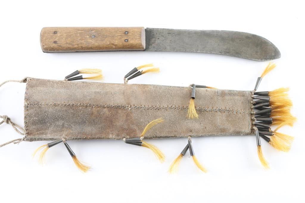 Leather construction with quill work, jingle bells, and yellow horse hair. Measures 9"x2". Includes wood handled trade knife.