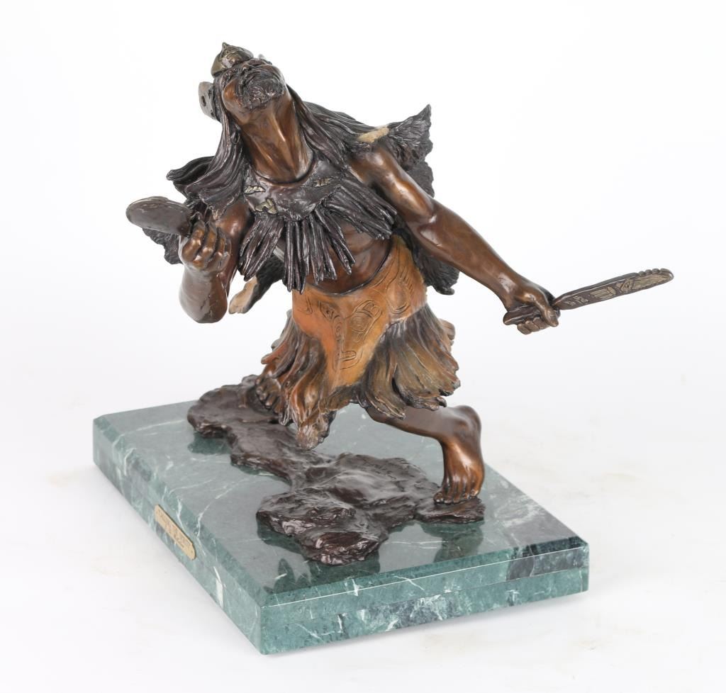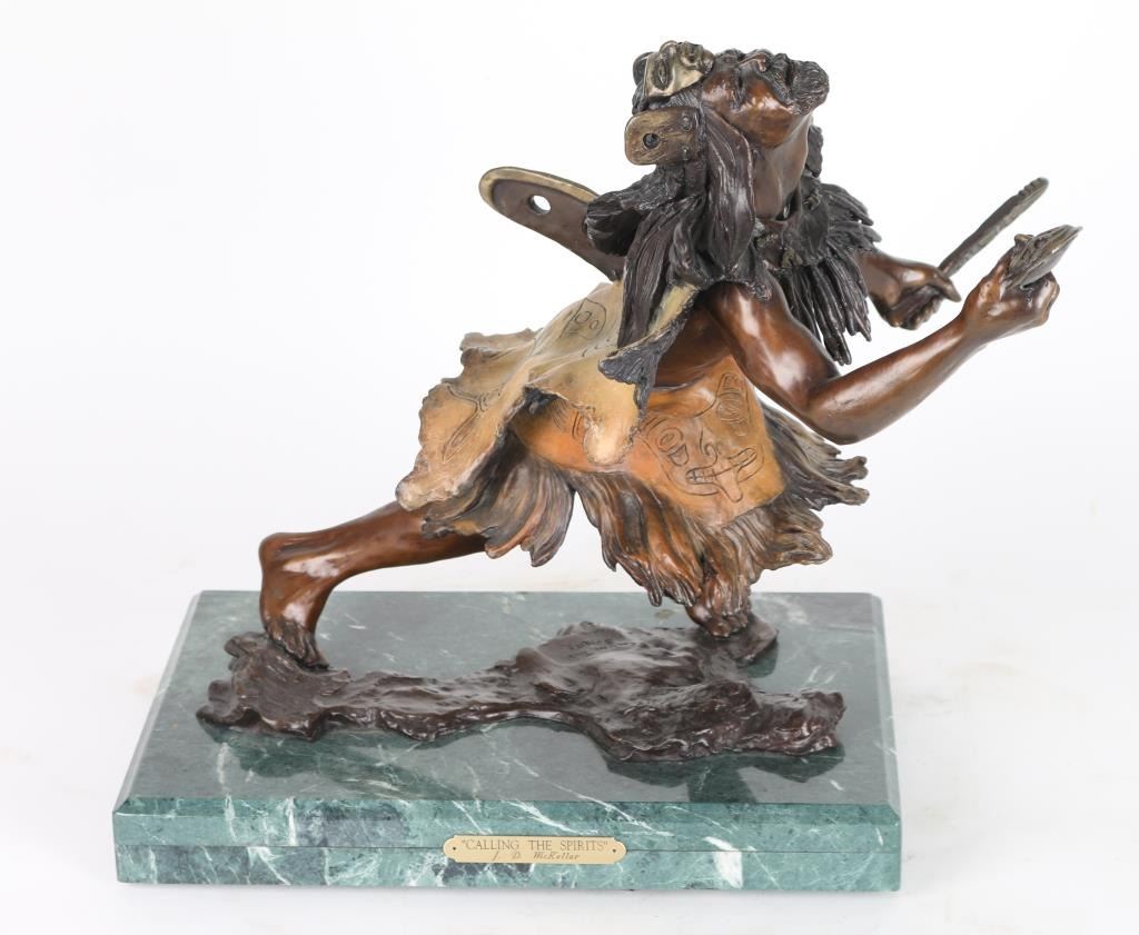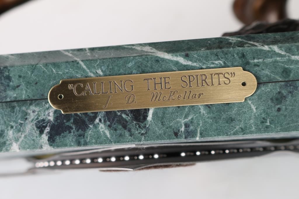 By J.D Mckellar , entitled "Calling The Sprits" numbered 3/30. Signed in bronze, measure 14x16 on marble base. Jerry D. McKellar (Born 1944) is active/lives in Washington. Jerry McKellar is known for Romantic wildlife and Indian sculptures.