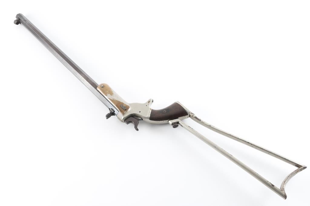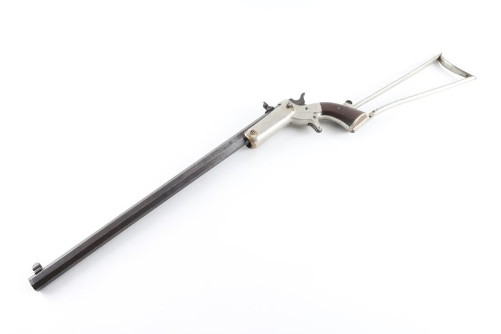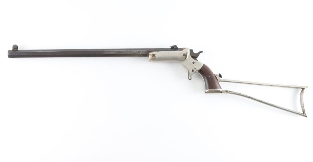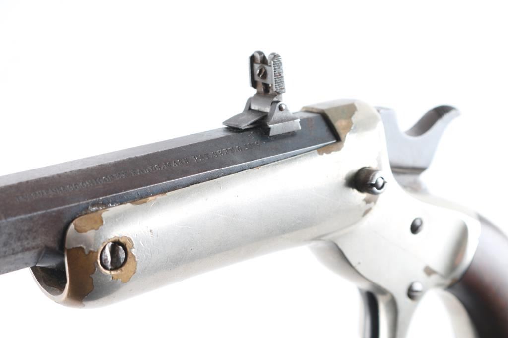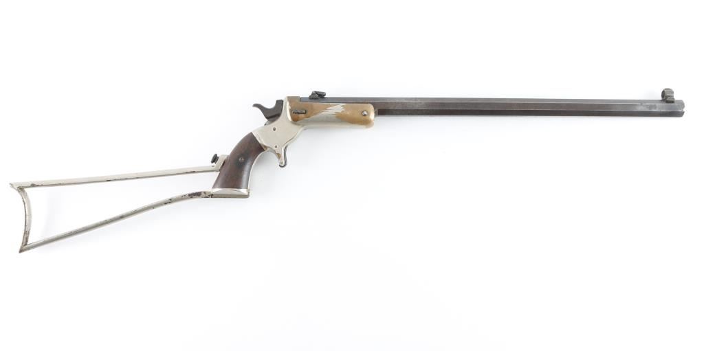 SN: 182 44RF Very Early Production. Antique American made single shot rimfire pistol manufactured circa 1872-1900. This earlier numbered example has the early single line barrel address. Features a blued 18" octagon tip-up barrel, automatic extractor, dovetailed front sight with globe style protected post with blade on top, dovetailed folding rear sight with two apertures, smooth spur trigger, knurled hammer spur, nickel plated brass frame, and two-piece smooth walnut grips. Matching serial numbers are found on the barrel, frame & stock. Bore is fair, showing light pitting throughout, continuous rifling. Blued parts show medium brown patina throughout, some thin areas or bare metal. Frame and stock retain about 60% nickel, some aged brass showing on frame (especially the right side), some brown patina on stock. Grips are very good, showing small dents. Action is smooth. Some light denting to chamber from firing pin strikes. Condition is NRA Very Good *** Antique Firearm ***