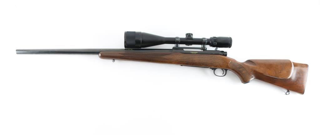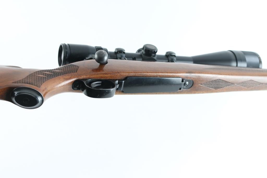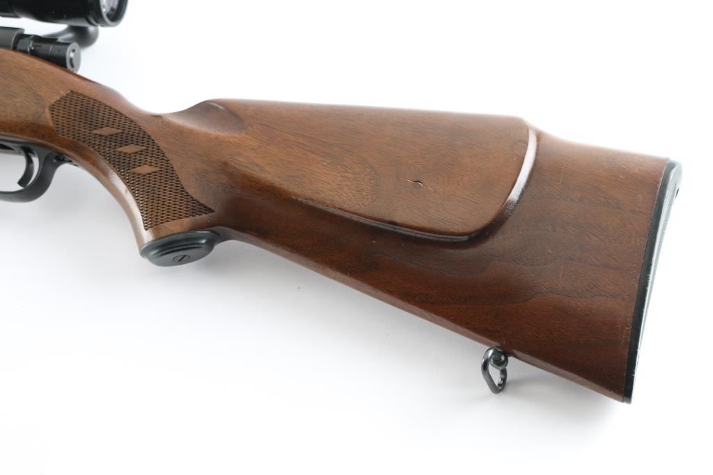 Push feed bolt action sporting rifle chambered in .243 Winchester, manufactured in New Haven, CT circa 1964, post 64, as serial numbers for post 64's started at 700,000. Features a blued finish, 24" tapered barrel, drilled/tapped for sights. There is a three-position safety, jeweled bolt, serrated wide trigger, alloy trigger guard, internal box magazine with hinged floorplate and checkered walnut semi-pistol grip Monte Carlo stock with black grip cap, a right handed cheek piece and black plastic butt plate. The wood stock is checkered at the wrist and forearm. Rear sling swivel, and forward sling swivel stud. The blued finish is about 99%, stock is excellent, action is smooth/tight. the bore is excellent/bright. Mounted with a Bushnell Banner 6x-18x50 scope, with Redfield base, and rings. Clear Optics. NRA Condition-Excellent. C&R Firearm
