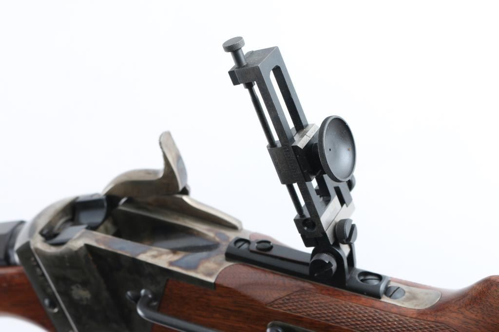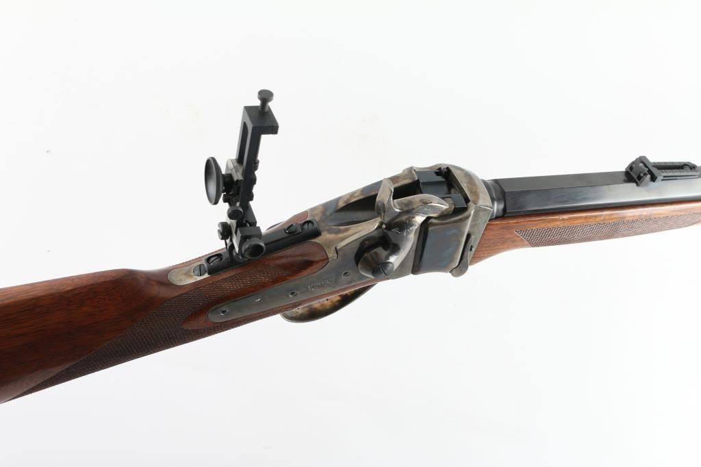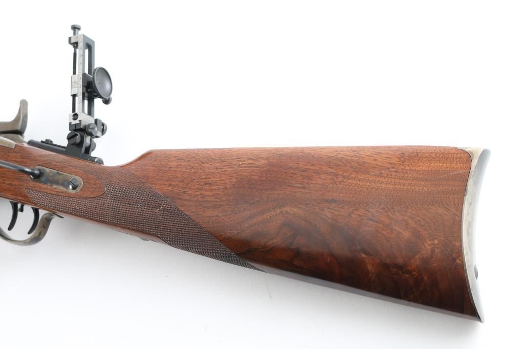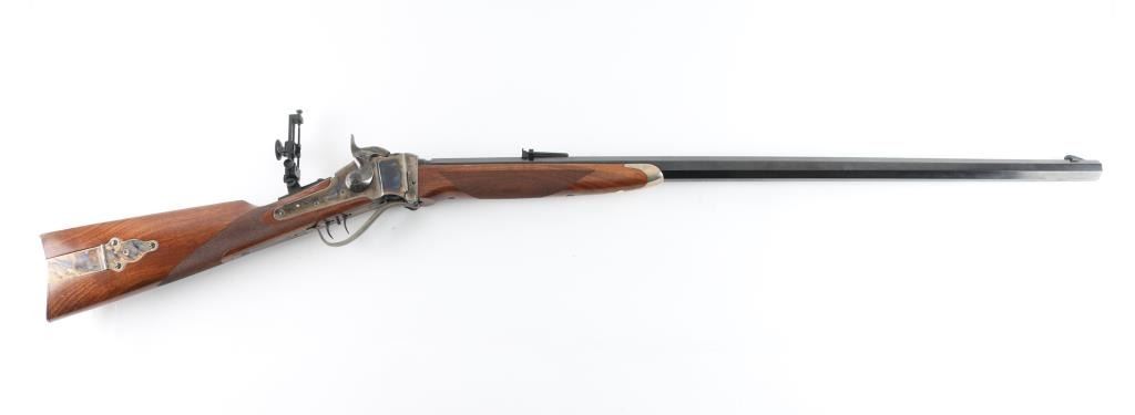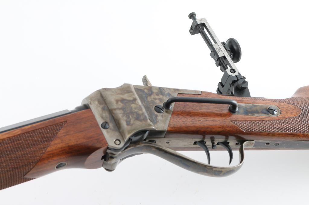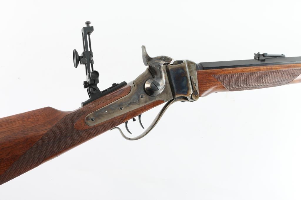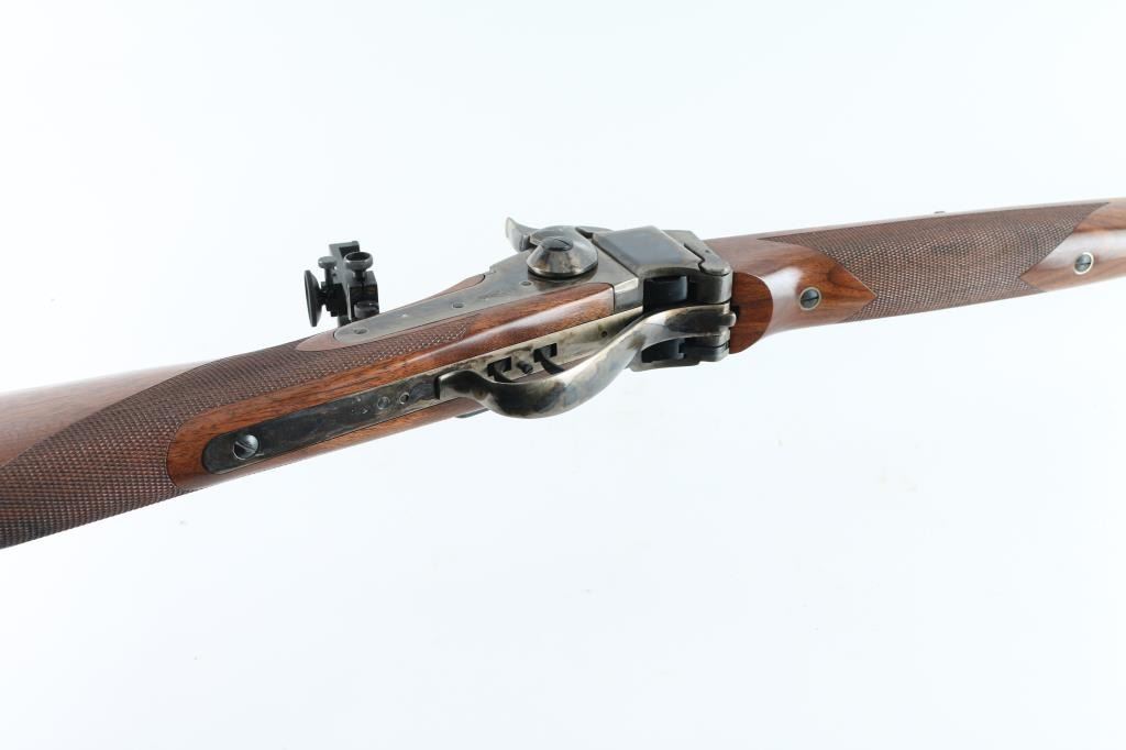 1874 Sharps "Q" Down Under Sporting 34" octagon barrel. Designed after the original Sharps rifle, this special-edition Davide Pedersoli 1874 Sharps Q Down Under Sporting Rifle originates from the transformation of a cavalry model and sports a patch box. This long-range shooter is massive, weighing in at 13 lbs. for rock-steady shooting at up to 1,000 yds. It has a 1-1/16", 34"-long octagonal barrel with a 1:18" twist. The beautiful walnut English stock is hand-checkered and oil-polished. German silver cap accents this truly fine firearm. Equipped with adjustable rear sight and front blade sight. A Pedersoli branded Creedmoor Vernier Tang Sight has been added. The double set triggers are allow for a smooth trigger pull. The barrel is blued and looks very good. Wood looks very good but for a wavy scratch on the left side of the shoulder stock about 4.5"-5" long. Color case hardened receiver and accents look good but the clear finish is cracking in spots. Bore looks great, bright. LOP is 14.25" from front trigger. This is a very nice firearm. Condition is NRA VERY Good+ *Modern Firearm*
