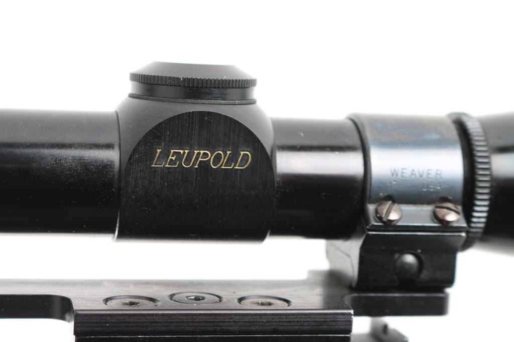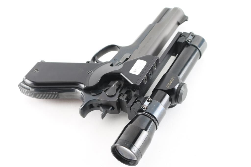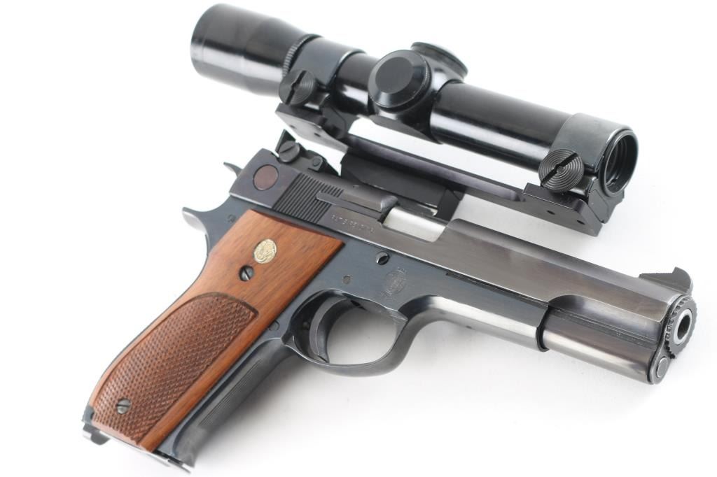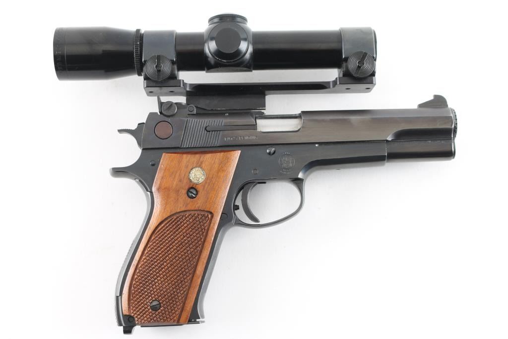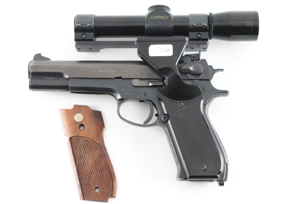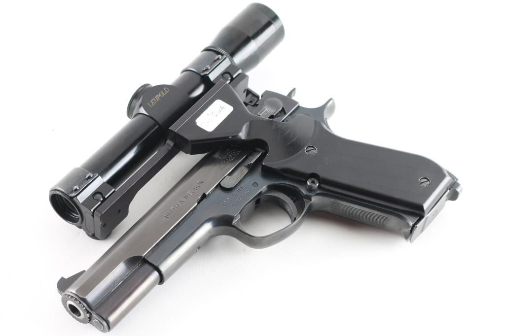 'The .38 Master Single-Action' Vintage single action semi-automatic full-size pistol chambered in .38 Special Mid-Range, manufactured in Springfield, MA circa 1982. Features a blued finish, 5" barrel, full-length steel guide rod, 1/8" patridge front sight, fully-adjustable rear sight, .365" serrated trigger with adjustable stop, .260" hammer with serrated spur, thumb safety on the left side of the slide, magazine disconnect safety, push button magazine release, factory 5 round magazine, steel frame with serrated front strap, knurled mainspring housing, and two-piece checkered walnut grips with silver S&W medallions. Left grip panel is included, has been removed from the pistol and replaced with a "Cal Grip" combination grip panel & scope base, mounting a very good condition Leupold LER pistol scope (appears about 2x, the rings cover model and power info, has duplex reticle & clear view). Bore is very good. Retains 95% finish with handling marks, minor edge losses. Grips are very good overall, some small dents. Condition is NRA Excellent *** Modern Firearm ***