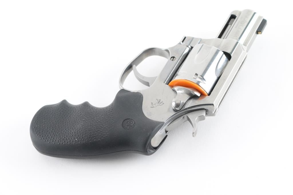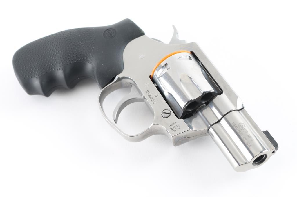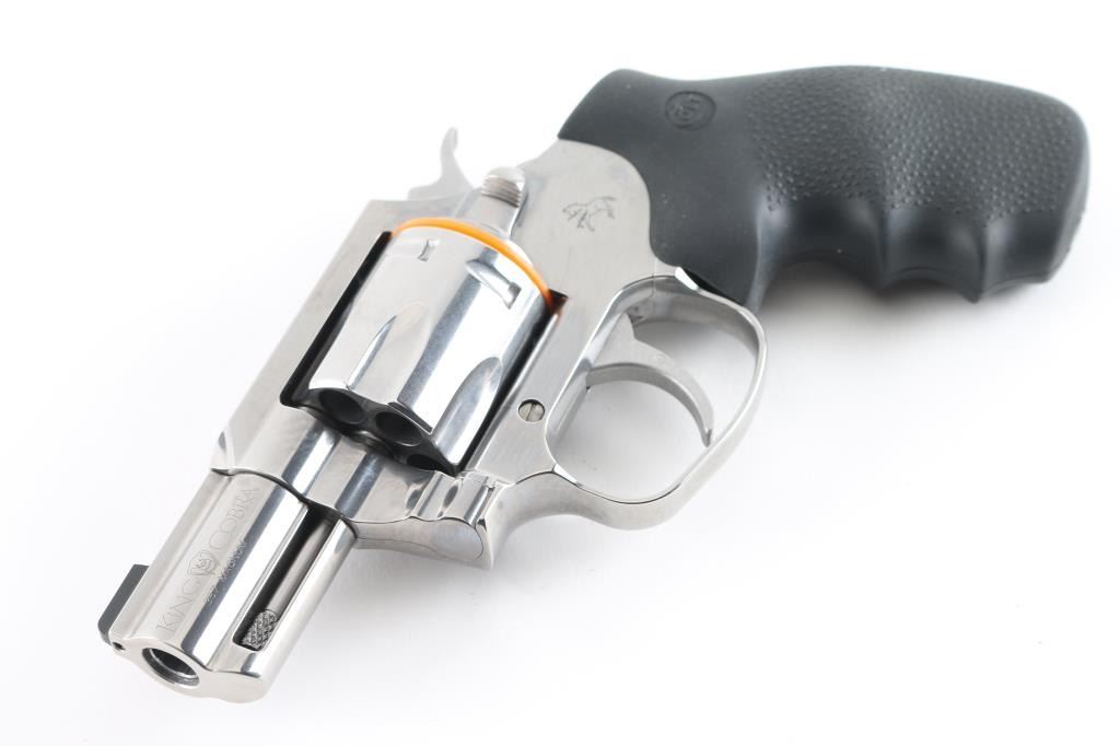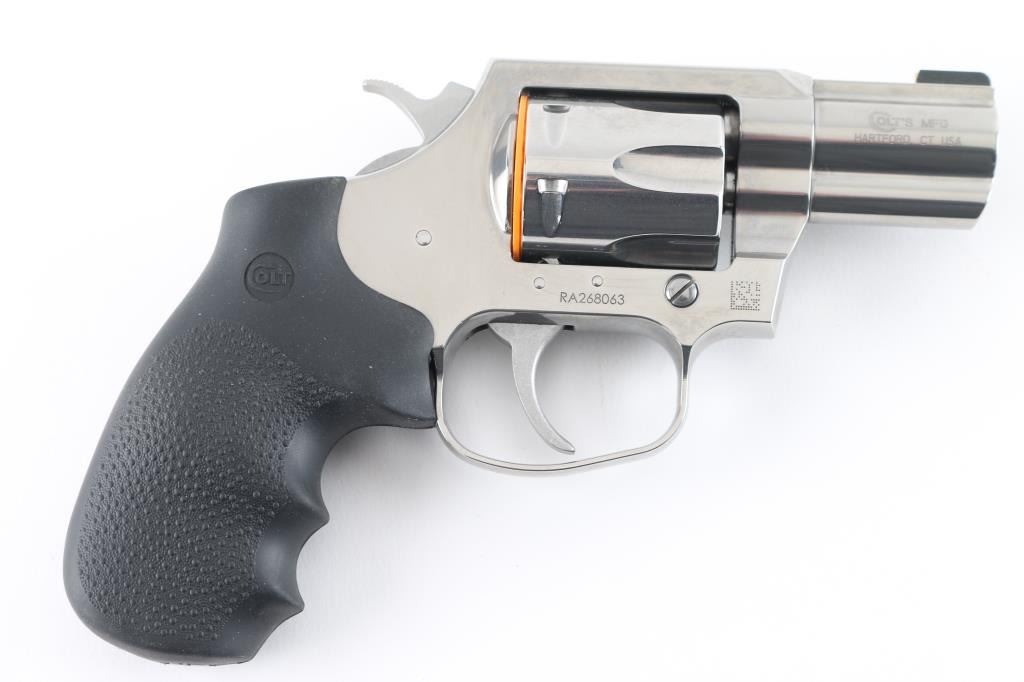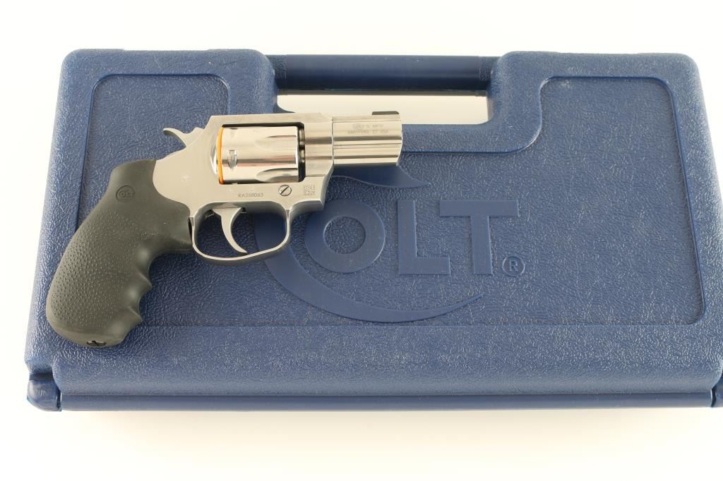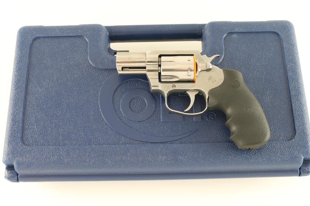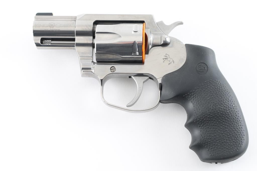 ‘2019’ Premium medium frame double action snub-nose revolver chambered in .357 Magnum, manufactured in Hartford, Connecticut. The updated 2019 King Cobra has been fully redesigned using a linear leaf spring for a non-stacking, smooth-as-glass trigger pull. Features stainless steel construction with a polished finish, 2" ribbed barrel with recessed crown & full underlug, blade front sight with brass bead, square notch rear sight, fluted six-shot cylinder, smooth trigger, elongated trigger guard, serrated hammer spur, V frame, and Colt branded pebbled black rubber Hogue Monogrip. Revolver exhibits little to no visible wear. Action is super smooth with a tight lock-up, the bore is pristine, and the rubber grip is excellent. Includes a factory hard case with matching end label, documents, hand tag and lock. Condition is like NRA Perfect in Box. ***Modern Firearm***