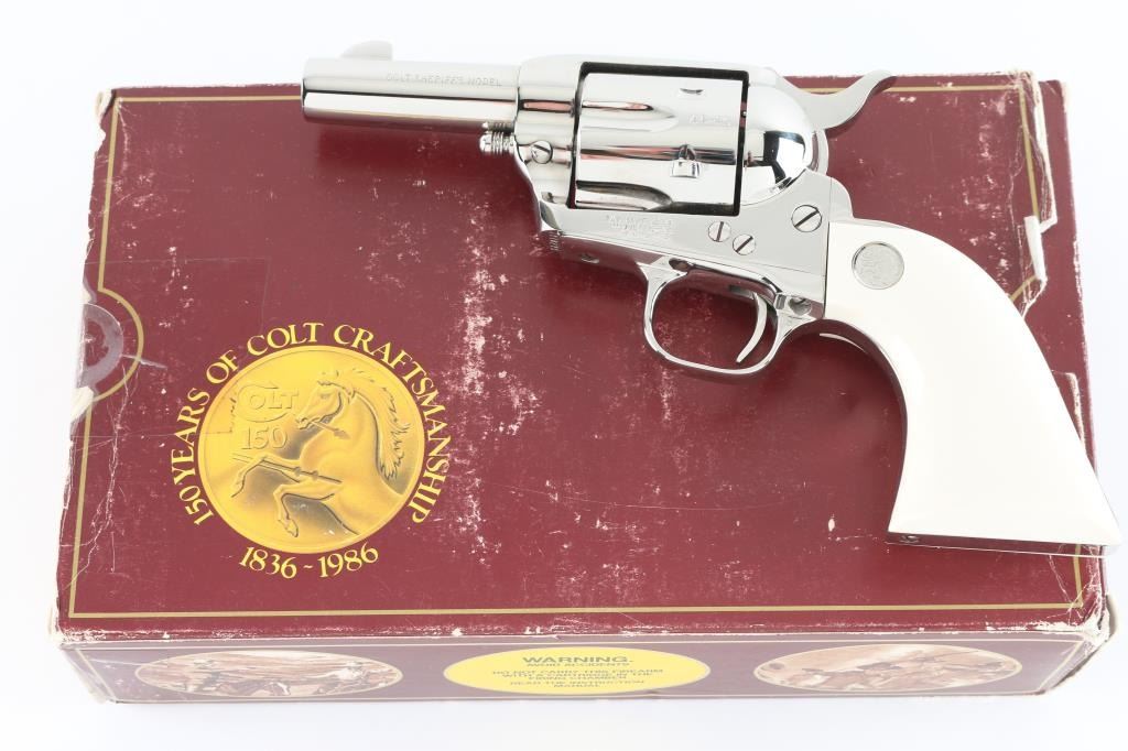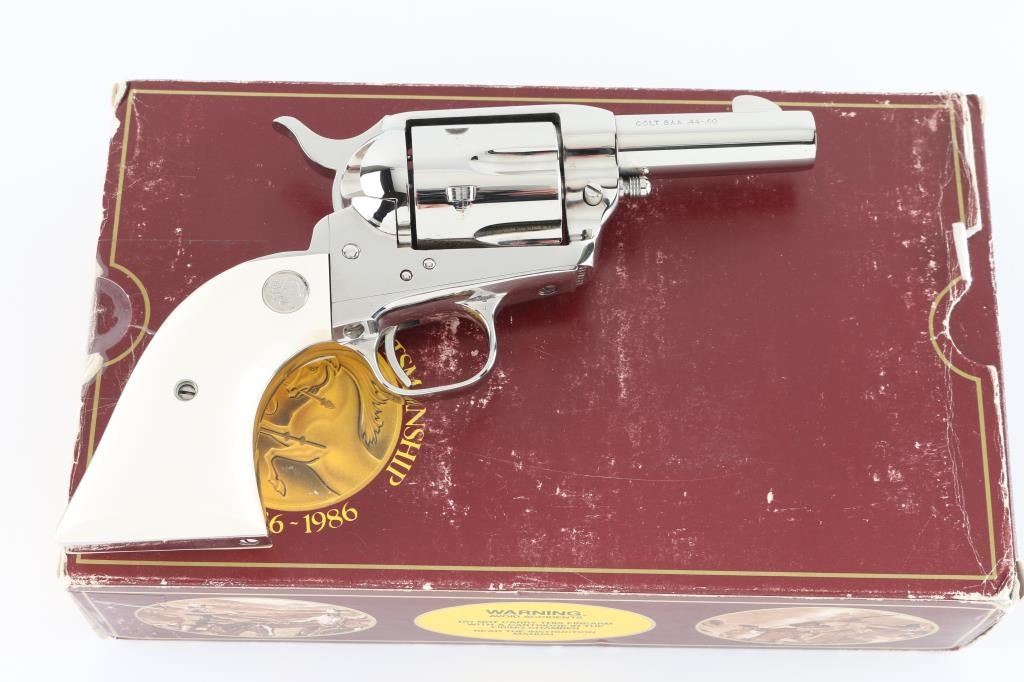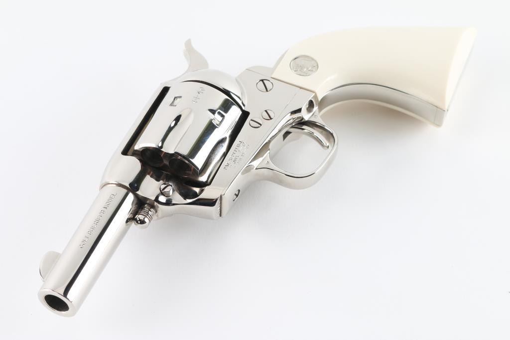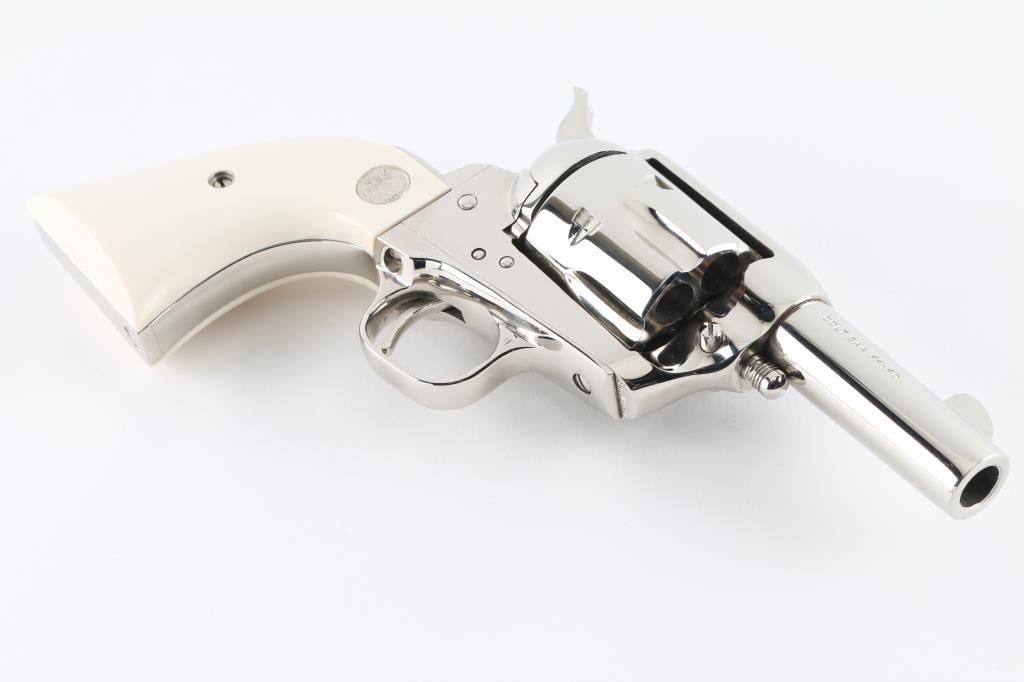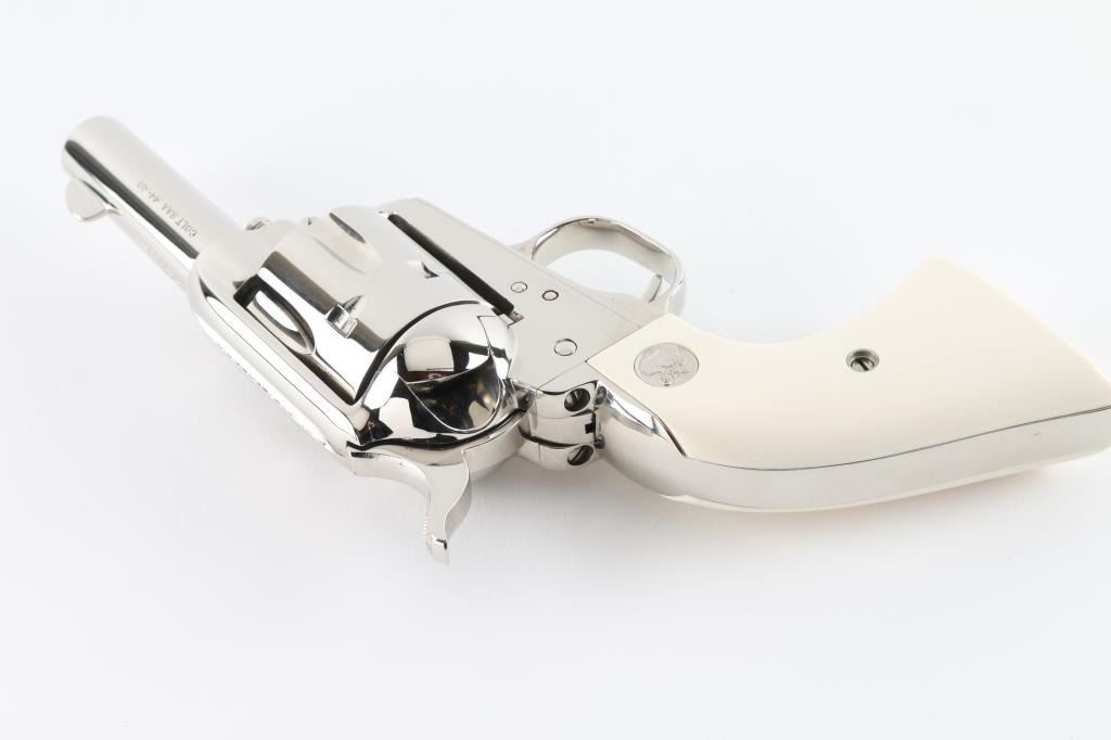 'Third Generation, P1933' Western style single action revolver chambered in .44-40 Winchester, manufactured in Hartford, Conn circa 1987. The Sheriff’s Model is characterized by the lack of an ejector rod & a shorter barrel, this style of revolver was done to create a simpler, easier-to-carry revolver useful in the Frontier era for short engagements that might not demand quick reloading. Features a bright nickel plated finish, 3" barrel with two line address, blade front sight, square notch rear sight, smooth thin trigger, knurled hammer spur, fluted six-shot cylinder, and two-piece ivory grips with silver Colt medallions. Matching serial numbers are observed full or in part on the frame, front face of the cylinder, on the left side of the backstrap, left side of the trigger guard and on the back of each grip panel (written in marker). Revolver retains nearly all of its original bright nickel plated finish showing no signs of use or wear. Action is crisp with four clicks, the bore is pristine and the genuine ivory grips are excellent with beautiful color & grain. Includes a factory maroon cardboard box with non-matching end label, styrofoam inserts, and literature. Condition is like NRA Perfect in box. ***Modern Firearm***