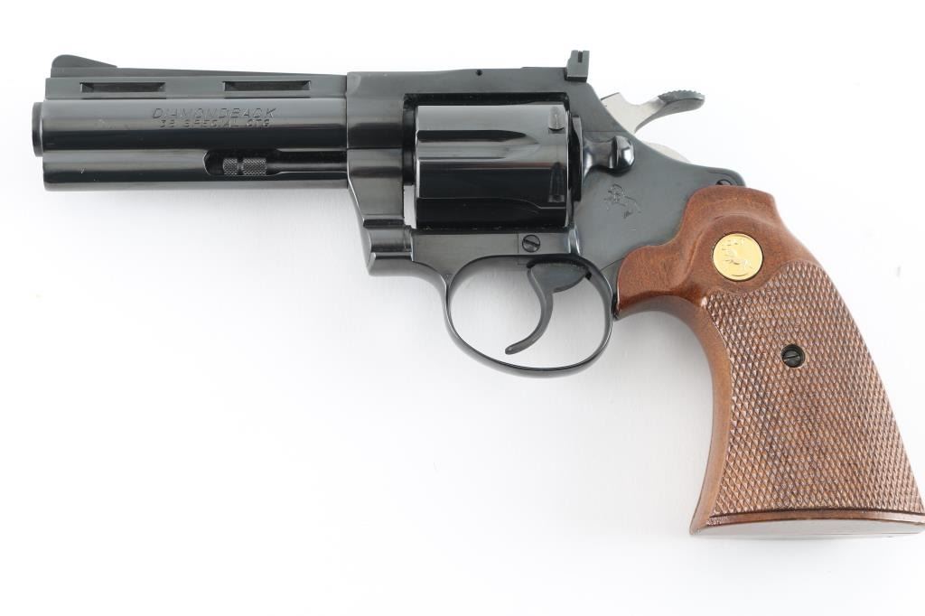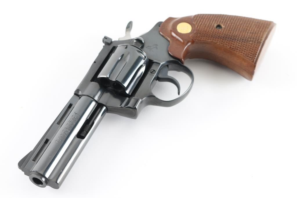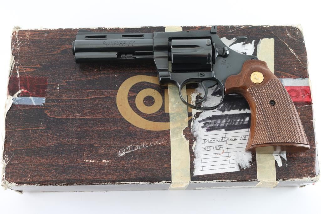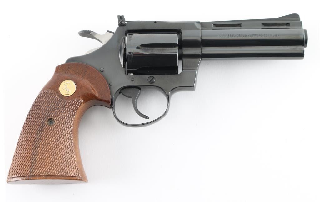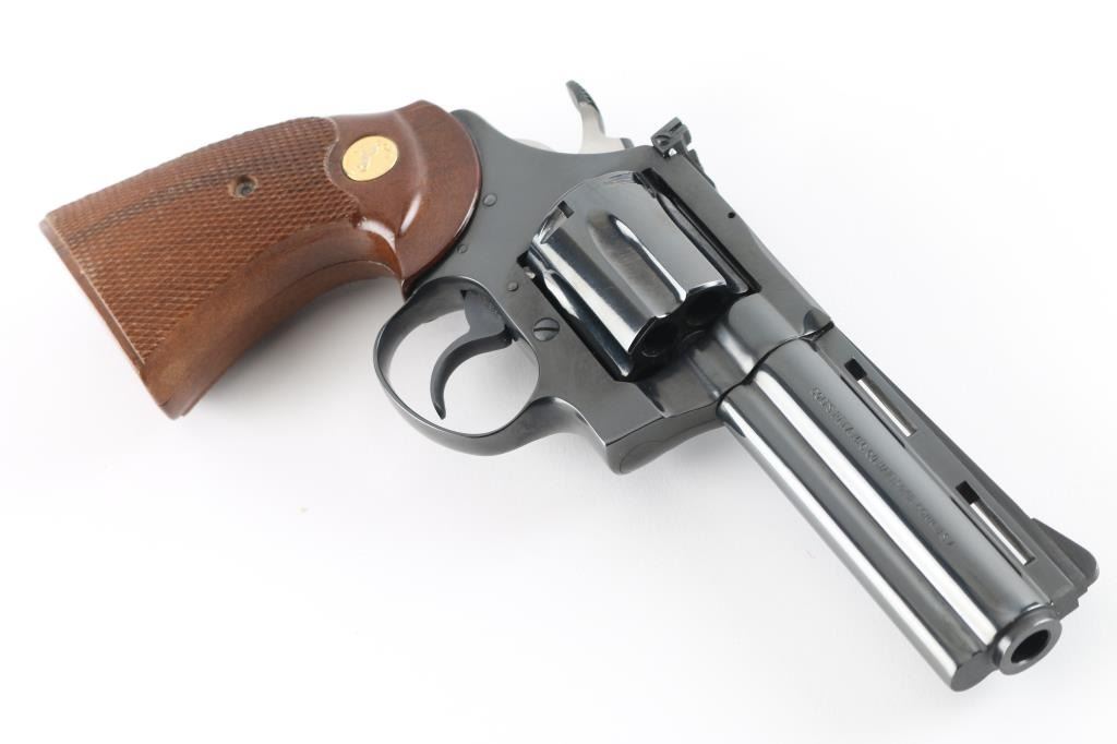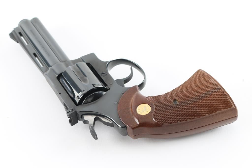 Desirable medium frame double action revolver chambered in .38 Special, manufactured in Hartford, Conn circa 1974. Features a blued finish, 4" vent ribbed barrel with full underlug, raised serrated ramp front sight, fully-adjustable rear sight, smooth trigger, serrated wide hammer spur, fluted six-shot cylinder, flat-top D frame and two-piece checkered walnut grip with gold Colt medallions. Revolver retains approximately 99% of its original blued finish with some scattered scratches. Action is smooth with a tight lock-up, the bore is pristine and the wood grips are fine with minimal blemishes. Includes a factory wood grain cardboard box(missing both flaps) with two-piece styrofoam insert. Condition is NRA Excellent. ***Modern Firearm***