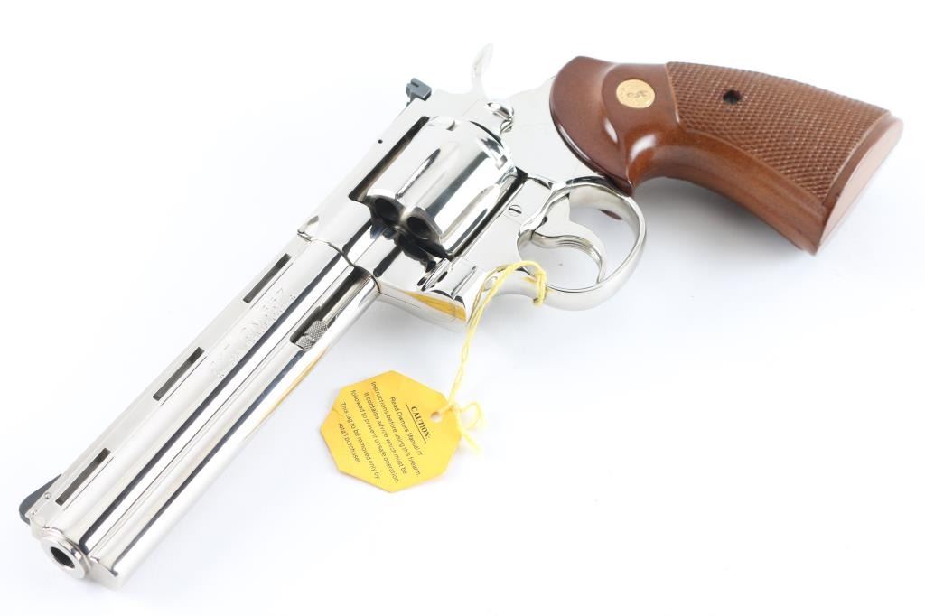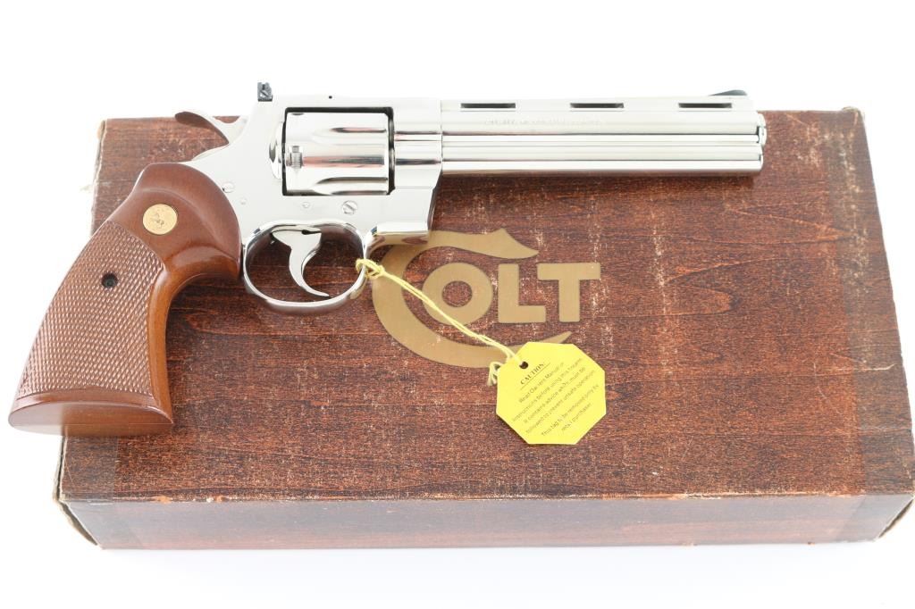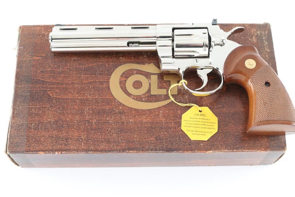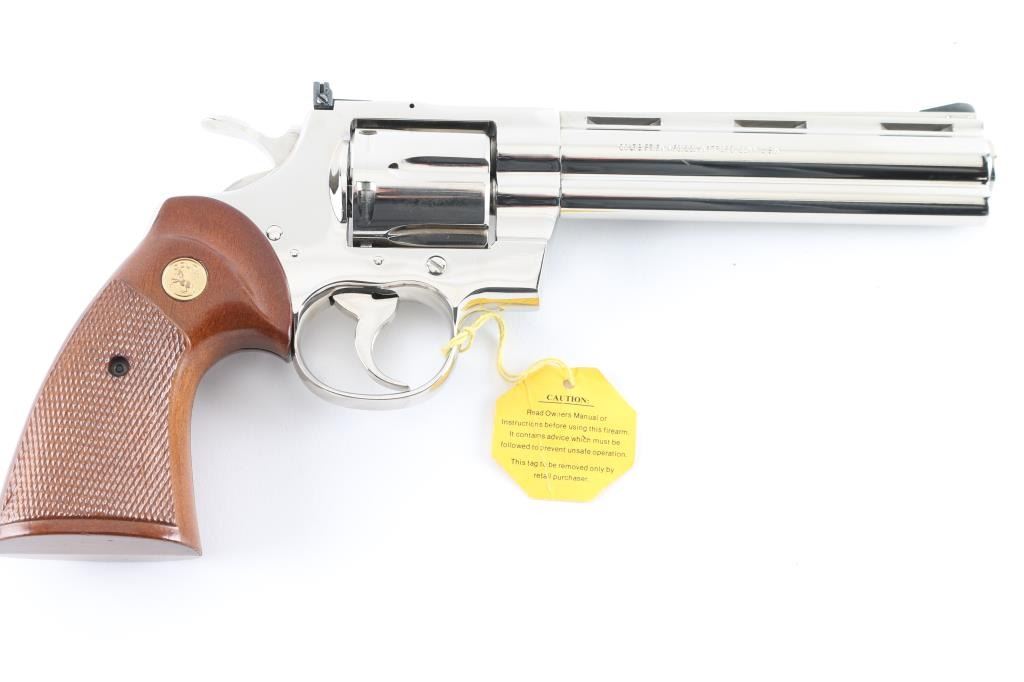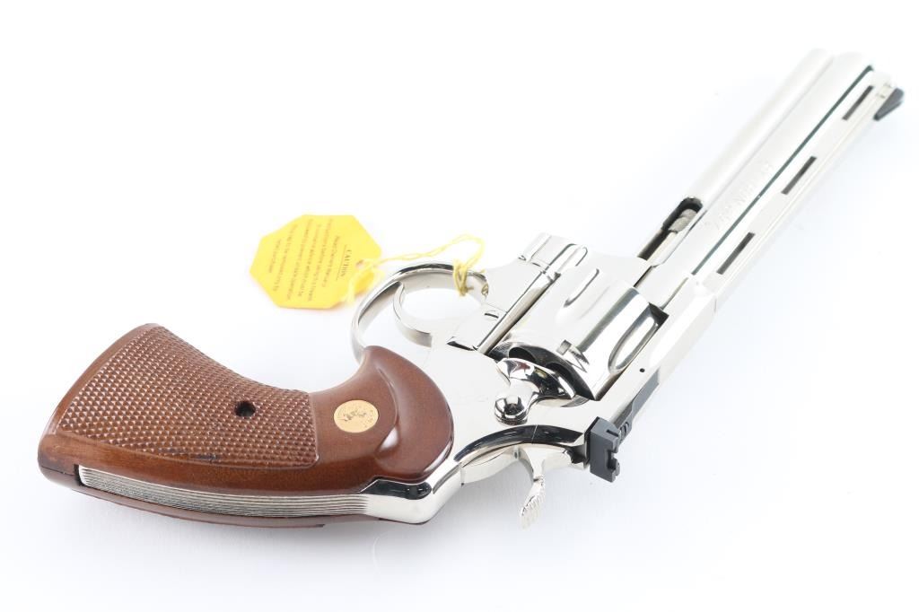 Double/single action revolver manufactured circa 1977. Features nickel finish, checkered wood target type grips with gold color Colt medallions, 6" barrel with full length underlug, adjustable sights, grooved narrow trigger, checkered wide spur hammer. Bore is excellent. Finish is excellent, with few minor blemishes. Grips are excellent. Action is light and very smooth, locks up tight. Includes factory sight tool & styrofoam box with fair condition wood grain cardboard sleeve. Condition is NRA Excellent *** Modern Firearm ***