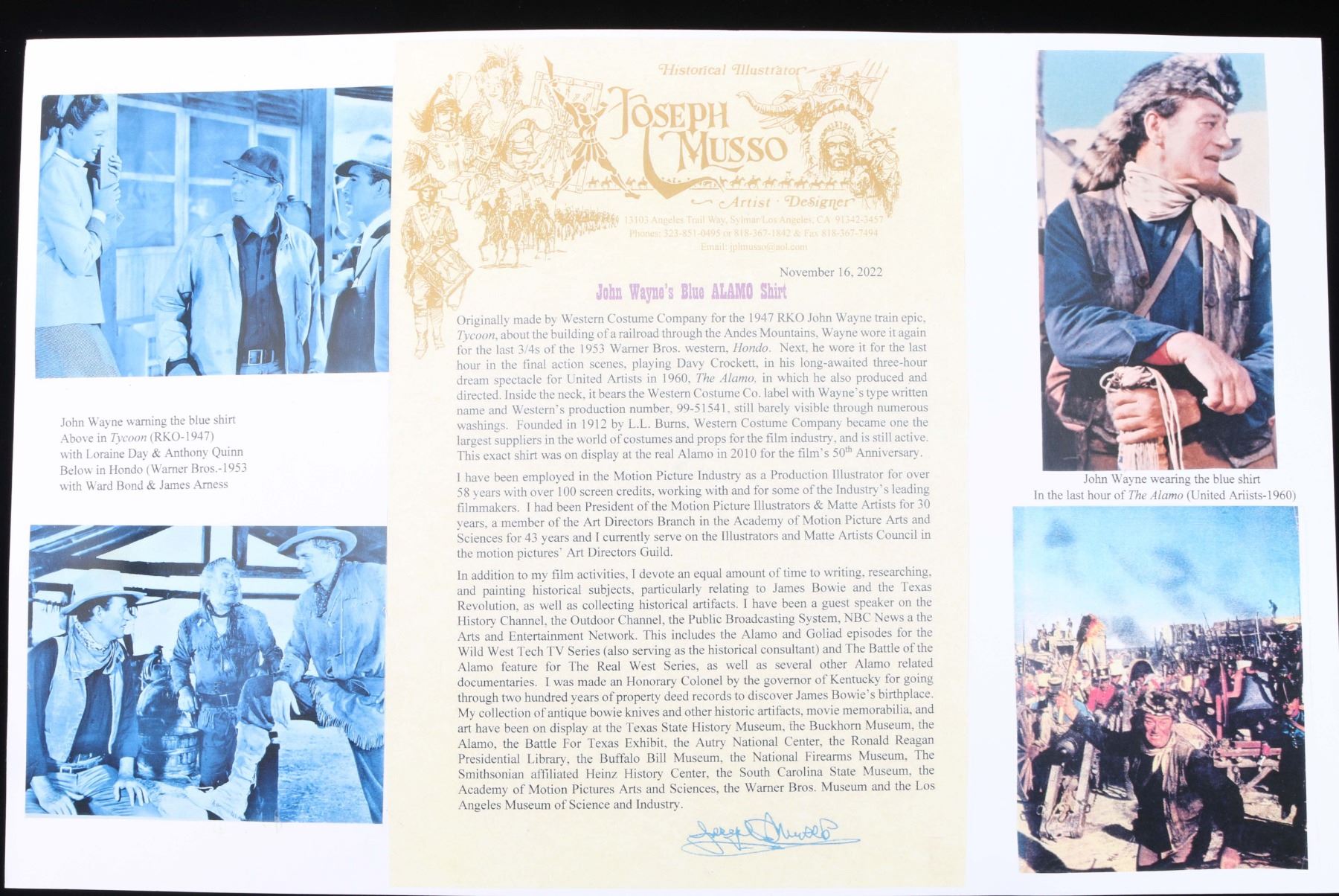 This shirt was worn in the classic film "The Alamo" and other classic Hollywood westerns. Documentation from "Joseph Musso" a lifetime achievement award winner from academy of motion picture. The shirt has a tag from the "The Western Costume Co". Also documenting the provenance is the period publicly and film shots with still photos proving authenticity.