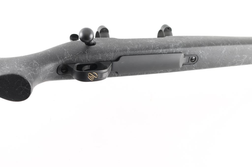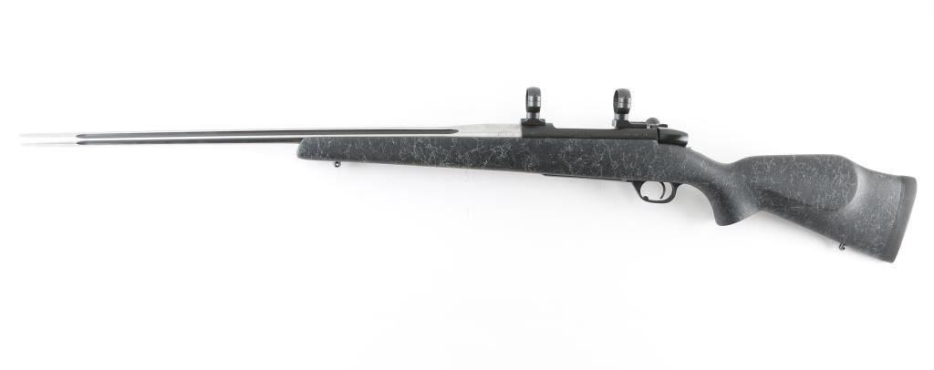 High quality American made bolt action sporting rifle chambered in .300 Weatherby Magnum, manufactured circa 2014. Features a graphite black Cerakote finish, 26” fluted #3 contour spun stainless steel barrel with crowned muzzle & no provisions for sights, installed two-piece scope rail, rings,9-lug fluted bolt with swept back handle, adjustable Triggertech serrated trigger, internal box magazine with hinge floorplate , two-position safety & cocked indicator on the rear of the bolt, and Monte Carlo style green fiberglass stock with black spiderweb texture, swivel studs, Decelerator recoil pad. Metal finish is near excellent with some minor scratches to the floorplate with no observed losses to the Cerakote finish. Action is very smooth, the bore is excellent and the aluminum bedded fiberglass stock is fine. Condition is NRA Excellent. Modern Firearm.
