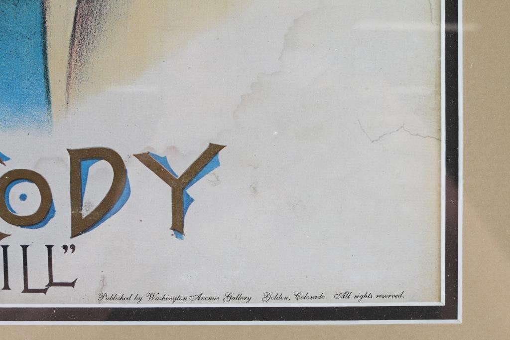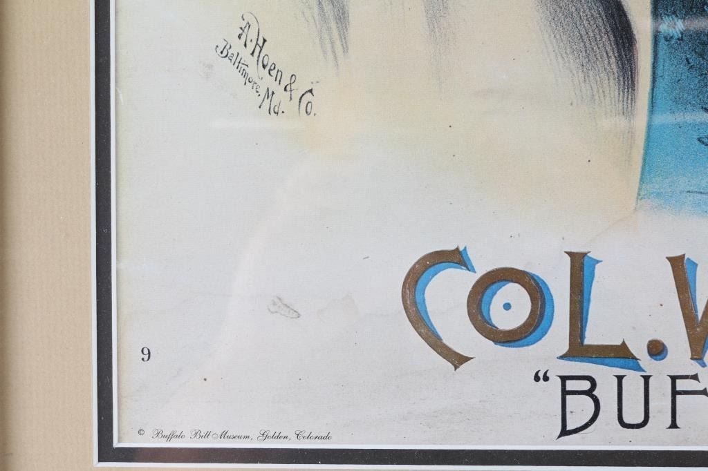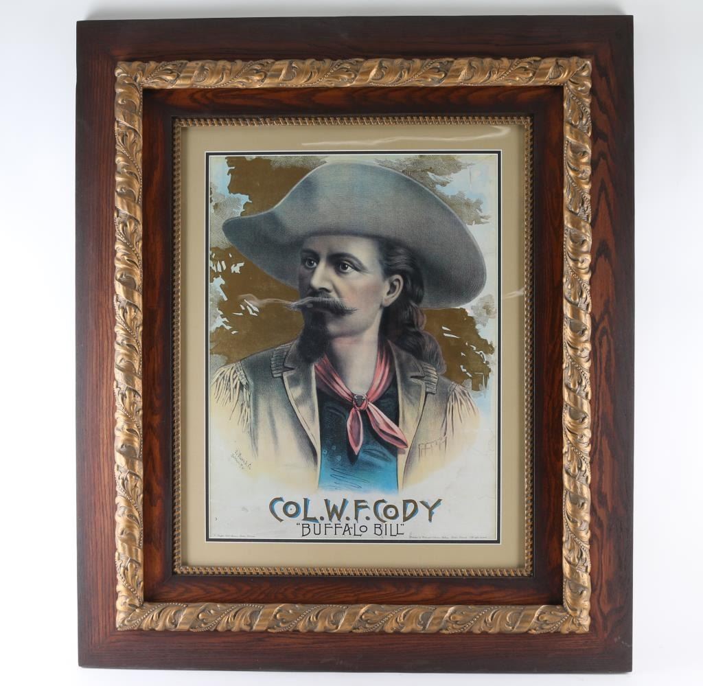 Framed in craved wooden frame with mounted brass adjustable spotlight, picture size measuring 27x21 by company on poster "A Hoent Co" at bottom, In beautiful to near perfect condition a great piece for a western themed saloon.