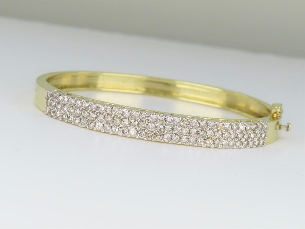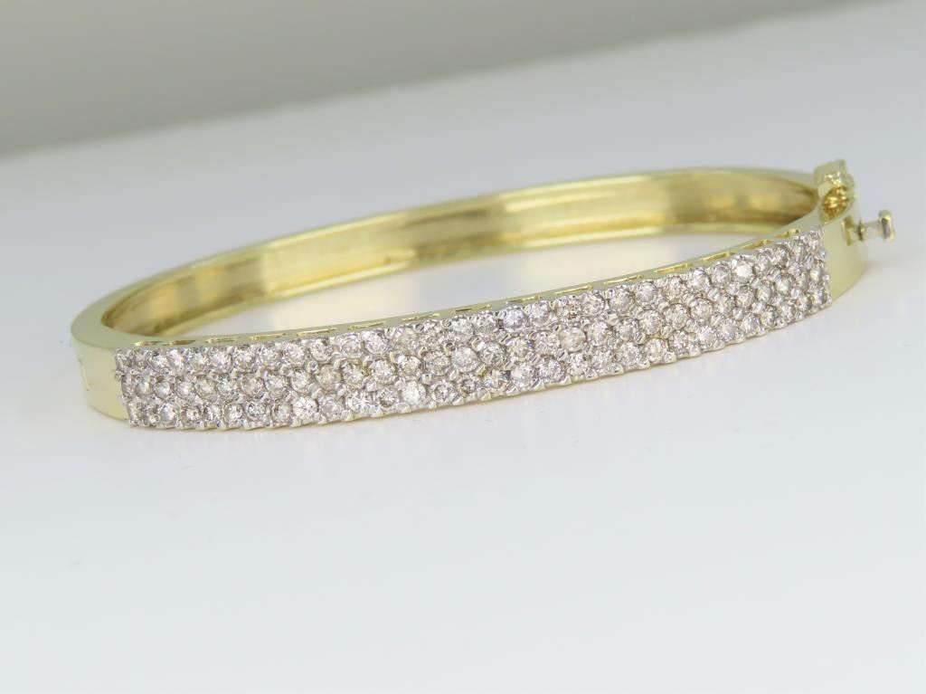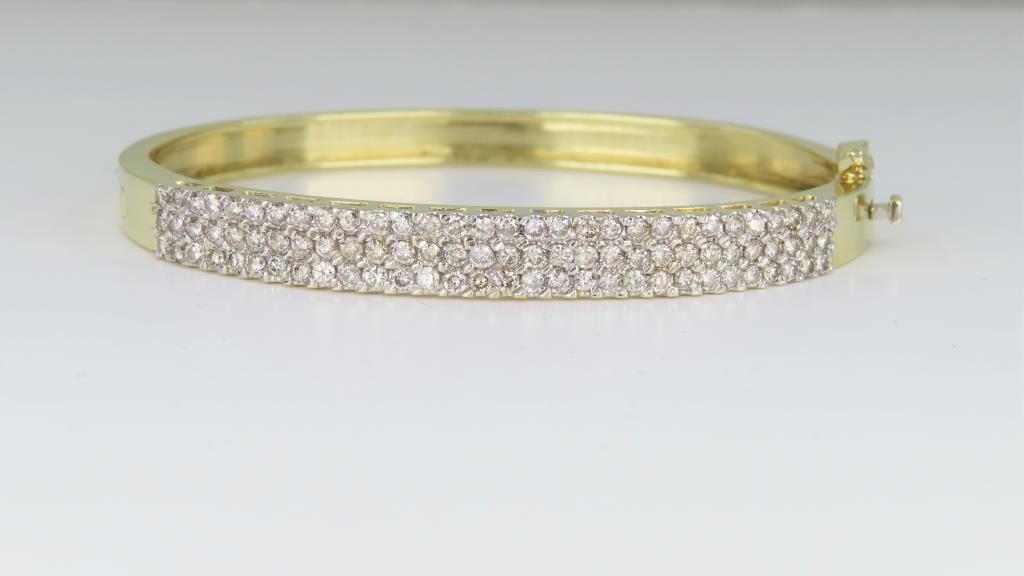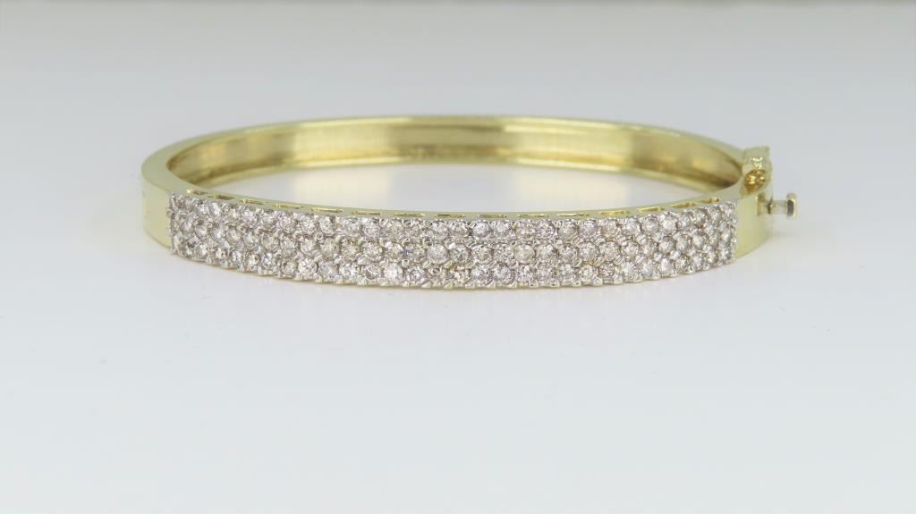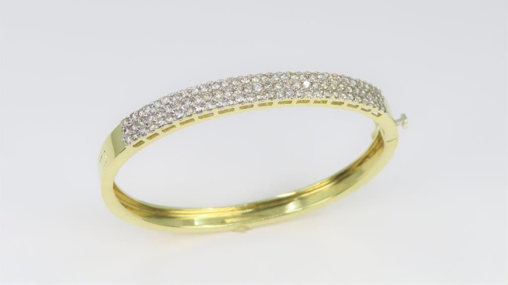 fine set with 90 round fine cut Diamonds with a total weight of approx. 3.00-3.50 carats with H-I colors and VS/SI clarity set in a 14 karat yellow gold custom made bangle setting. Retail $8,000-$12,000