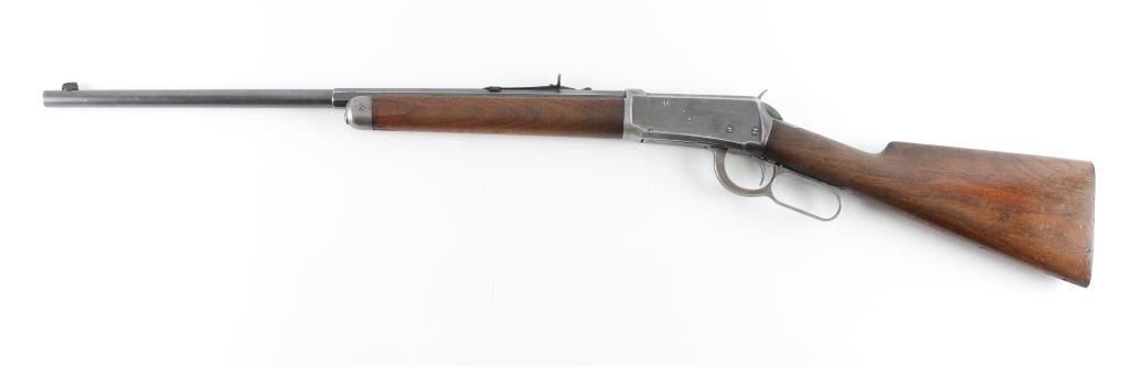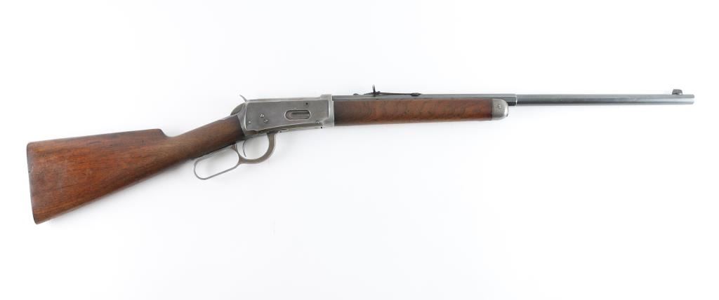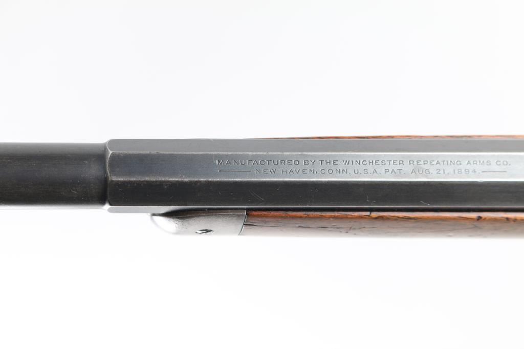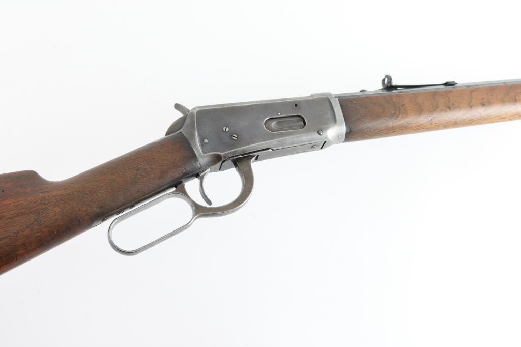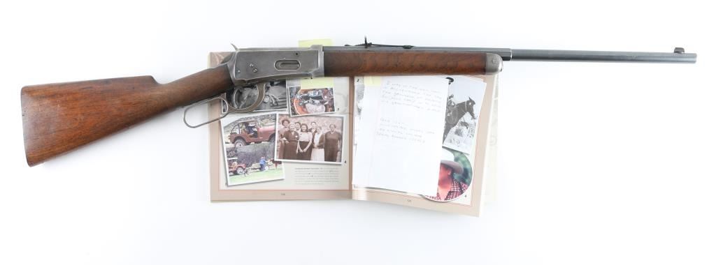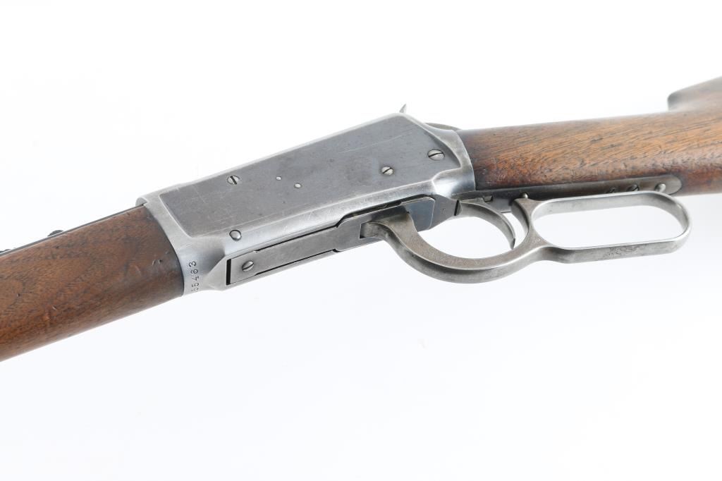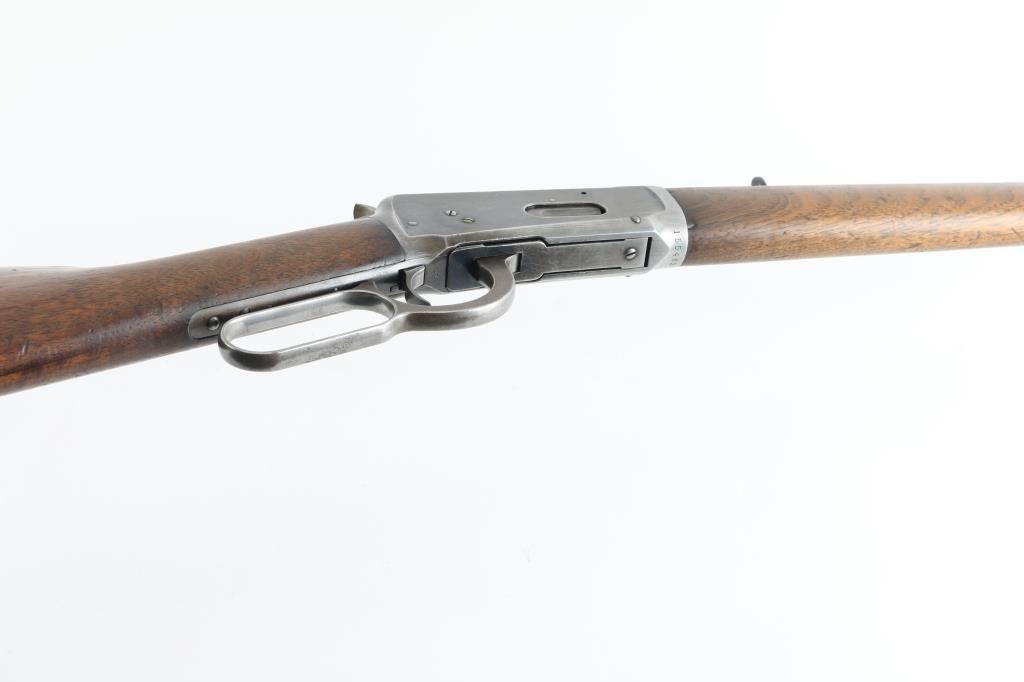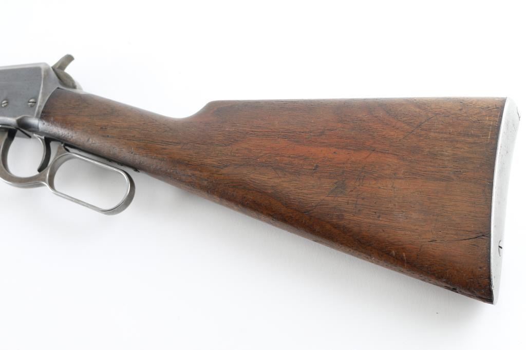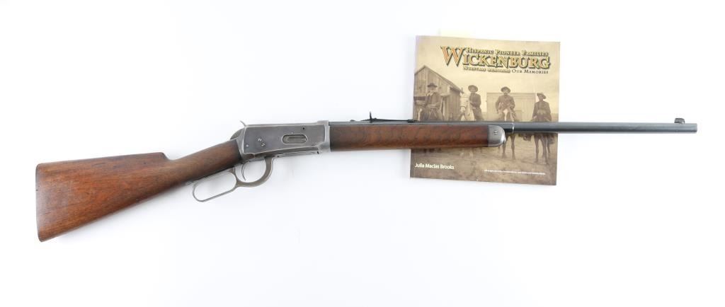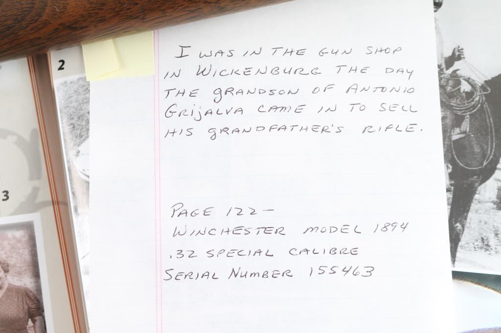 Vintage lever action rifle manufactured circa 1899. Features 23" half round half octagon barrel (barrel appears shortened), half length magazine tube ("button magazine"), dovetailed blade front sight, buckhorn rear sight, smooth walnut forend & straight wristed buttstock, "shotgun butt" with smooth metal buttplate. Bore is good condition, frosted throughout and some light pitting, a bit dark in grooves, still fairly bright with steady strong rifling. Retains 20% finish with dark colors in protected areas, remainder fading to gray or bare metal, some thin brown color. Wood is good or better condition, with small scratches & dents, good fit to metal, some staining at wrist next to receiver, forend is slightly loose, empty sling swivel holes. Original ownership of this rifle attributed to Antonio Grijalva, a noted rancher in the Wickenburg area. Included is a copy of the book "Wickenburg Hispanic Pioneer Families" by Julia Macias Brooks, which contains information on the Grijalva family, including a vintage photo (page 122) of Antonio Grijalva, holding what appears to be this rifle (taken before the barrel was shortened). This rifle would be a good candidate for obtaining a Cody Museum "factory" letter. Condition is NRA Good+ (possibly modified) *** C&R Firearm ***