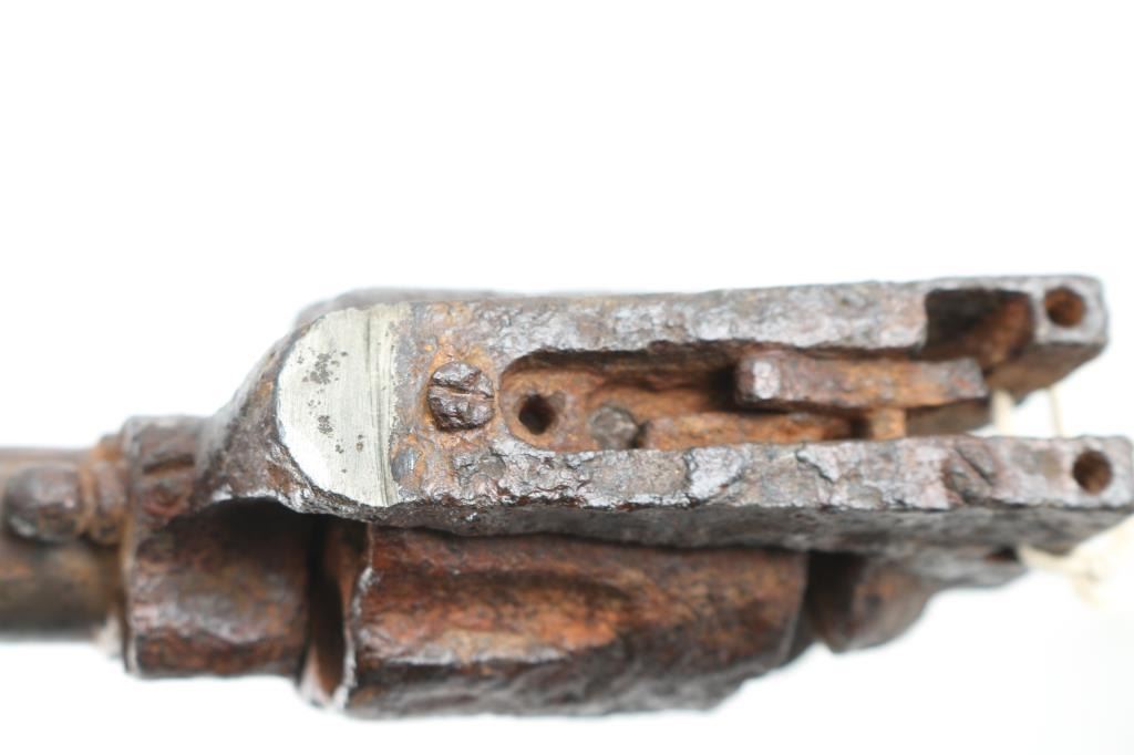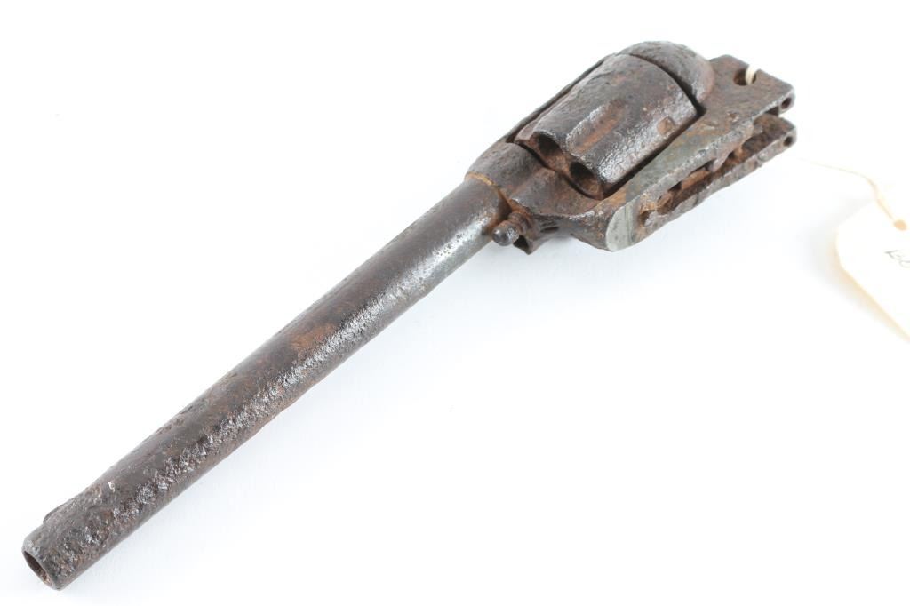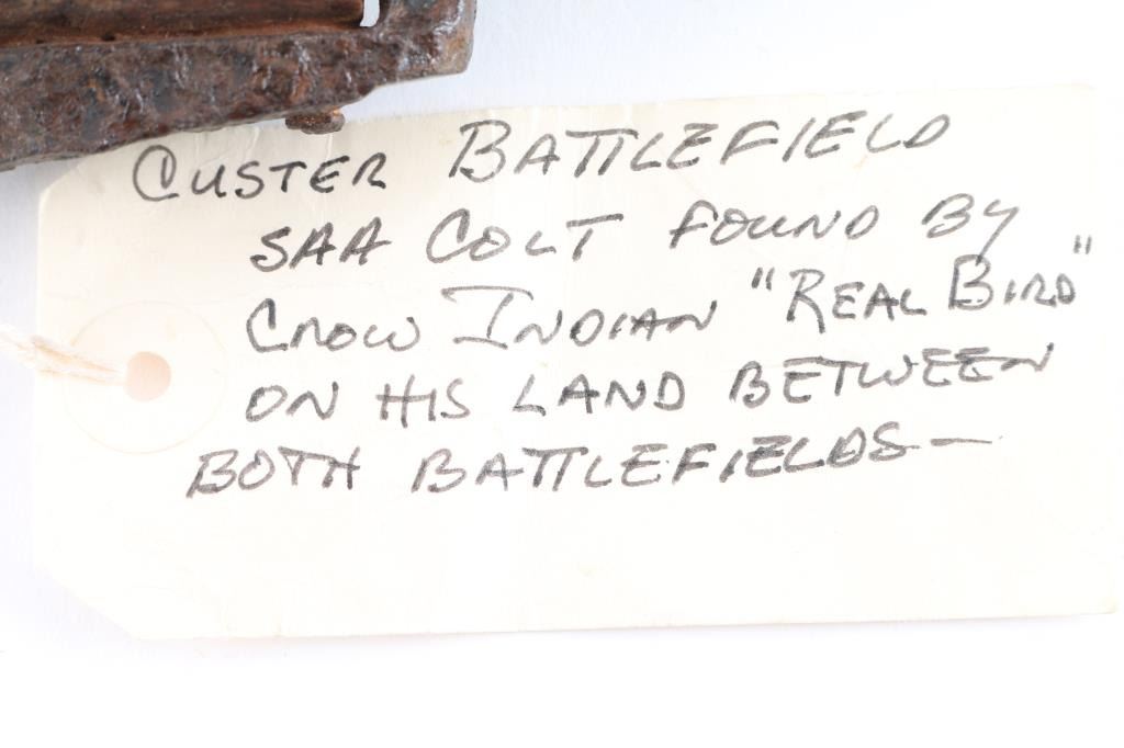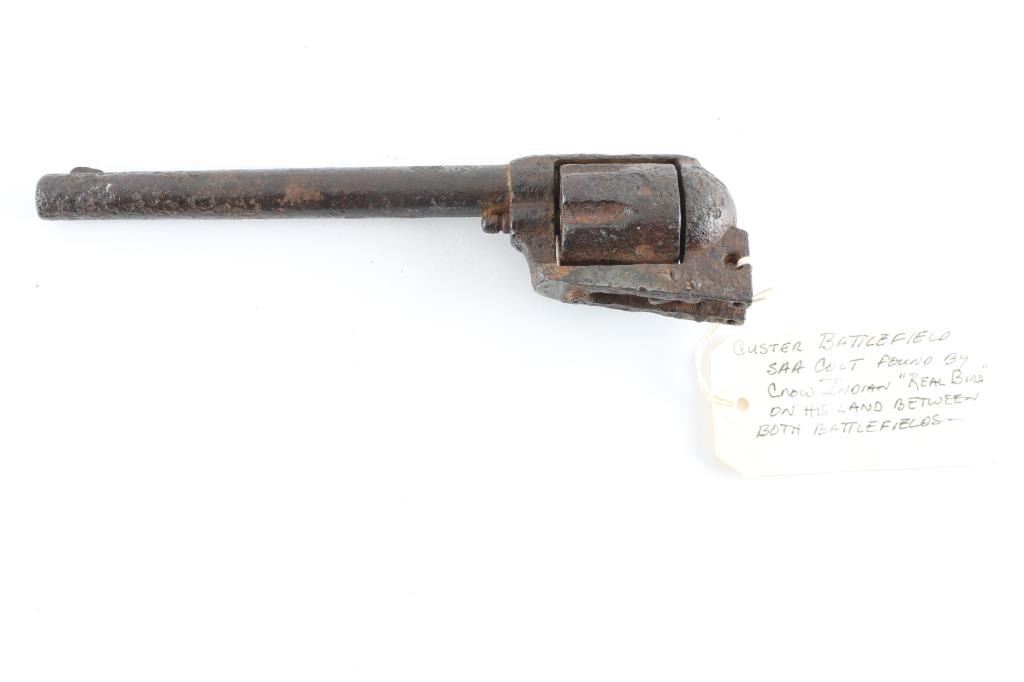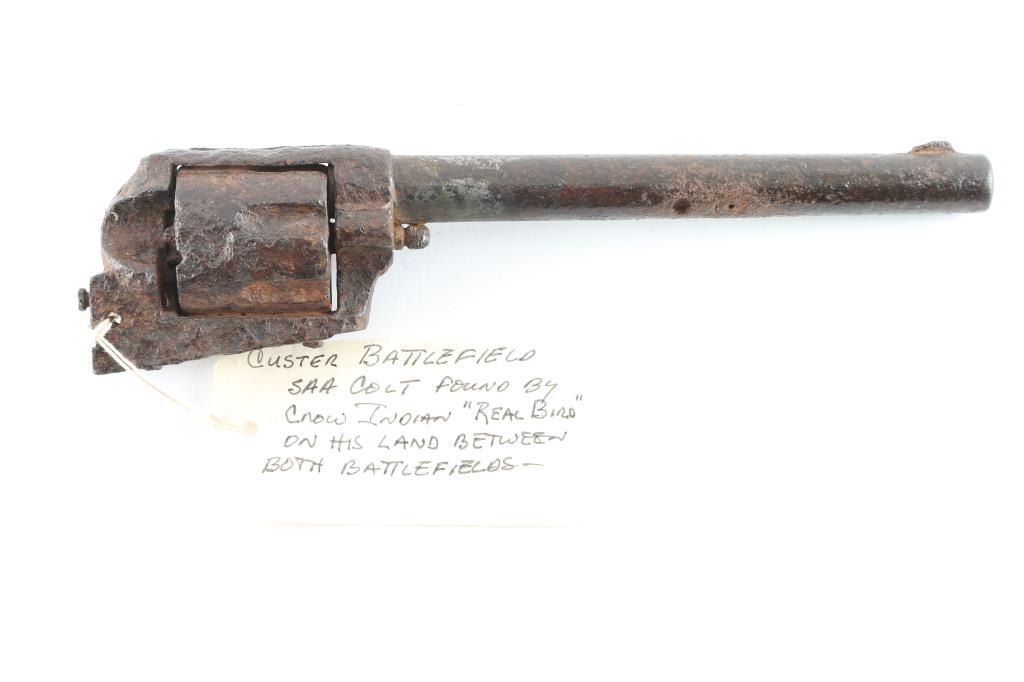 From the James Aplan collection tag reads found by "Real Bird" on his land between battlefields. Rusty relic Colt Single Action, with 7.5" barrel. Missing major parts and serial number. Removed from frame long ago with no visible markings. Barrel shows "Boss and Stud" holes indicating cavalry configuration. Heavy pitting and parts missing. Well known artifact from James Aplan Collection, 60 year student of the Custer battle who knew and dealt with descendants of the Battle of Little Big Horn, at his trading post museum in South Dakota. Antique Firearm NRA Relic