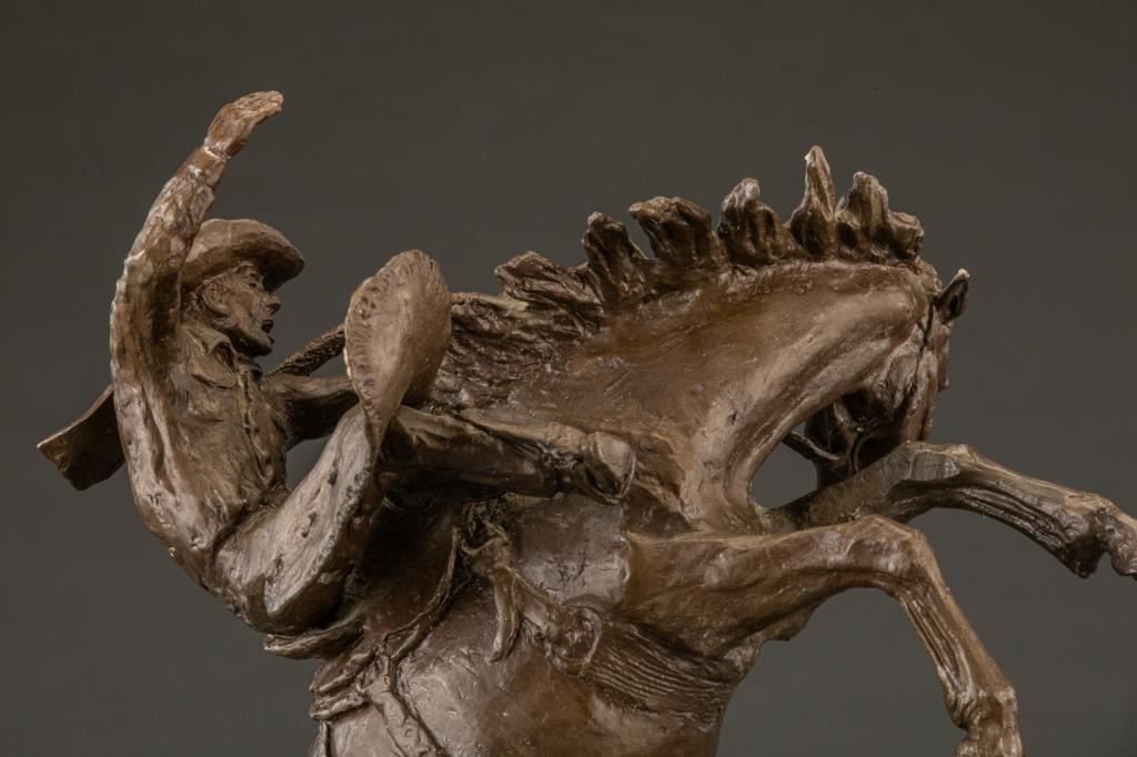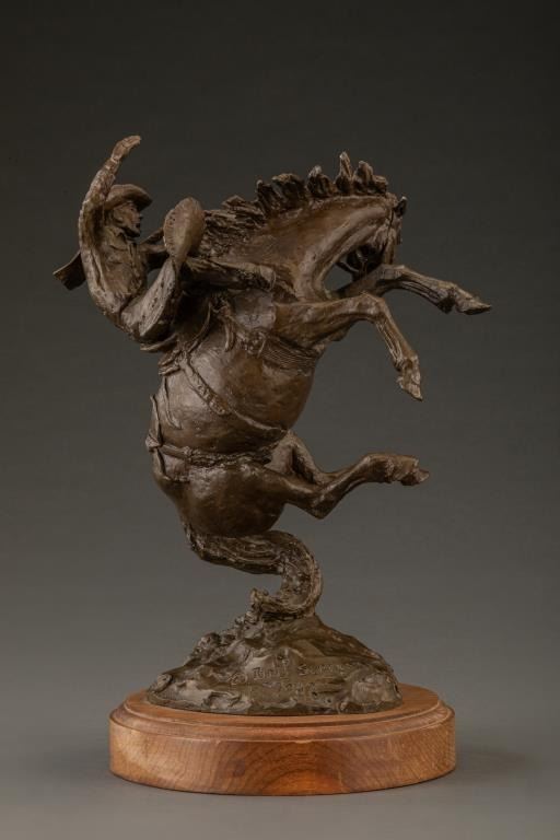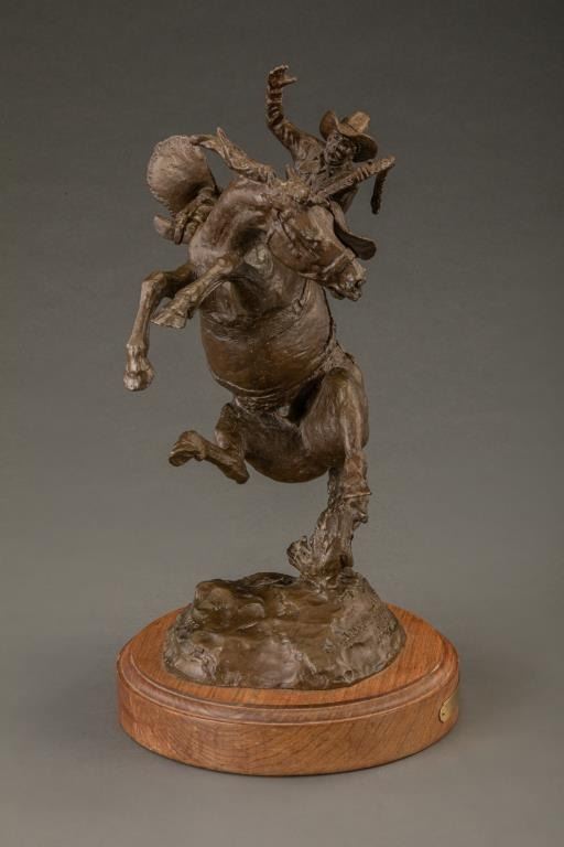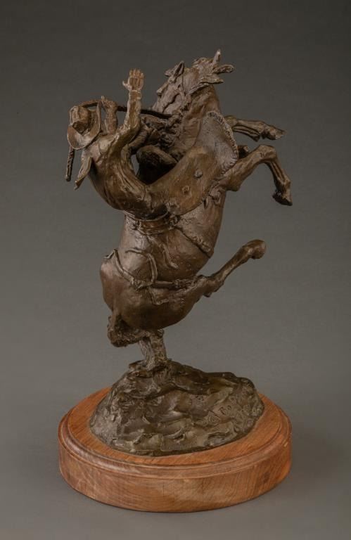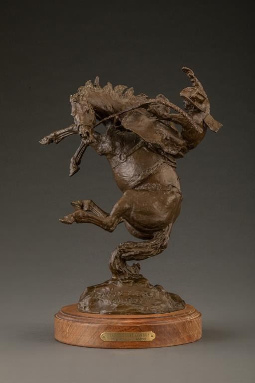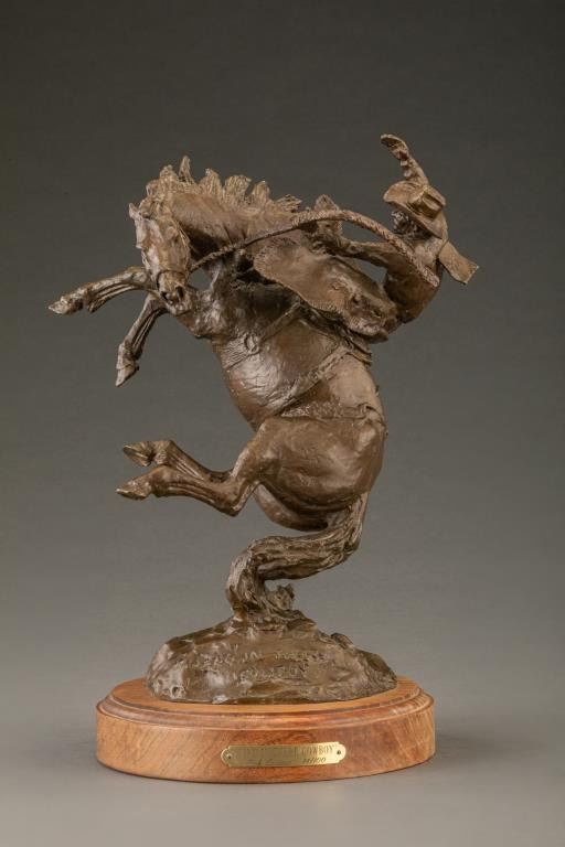 By Bob Scriver, entitled "Hang in there Cowboy" , numbered 14/100. Signed in bronze and measures 15"x8"x8" on wood base. Bob (Robert Macfie) Scriver (1914 - 1999) was active/lived in Montana. Bob Scriver is known for Animal and western sculpture.