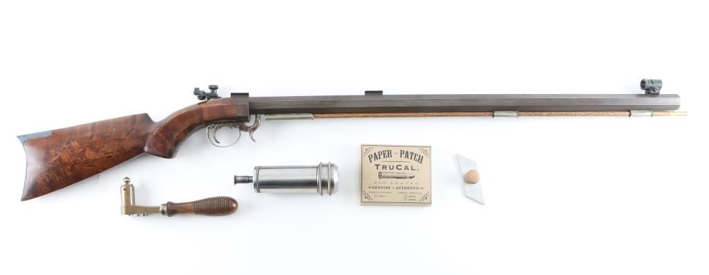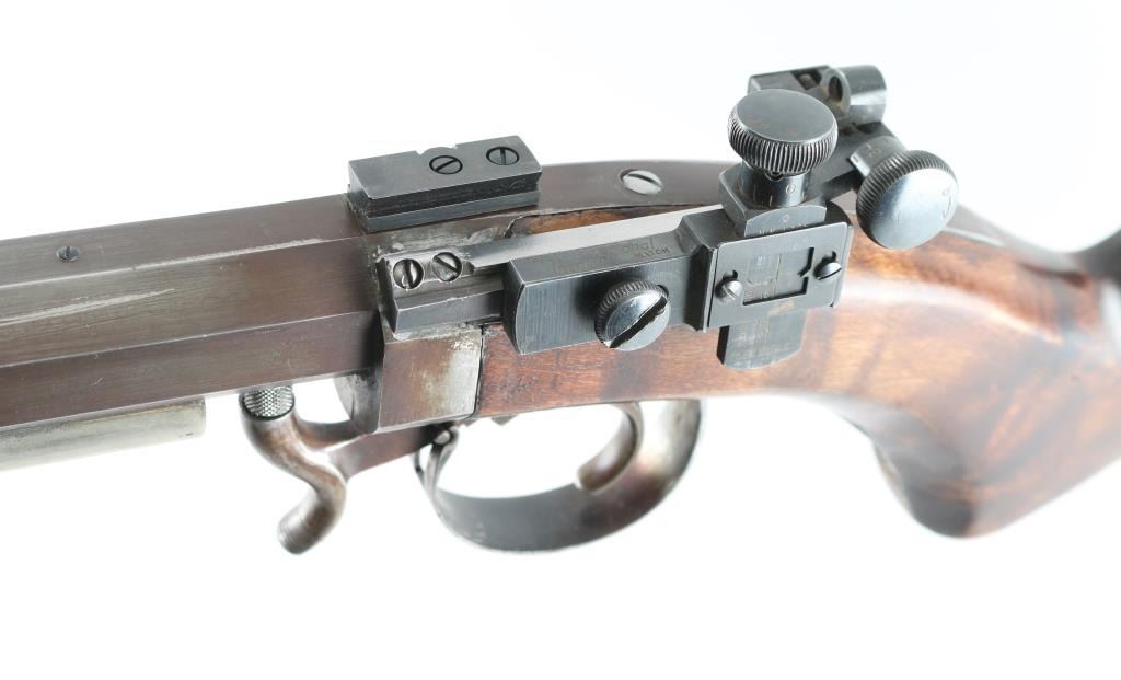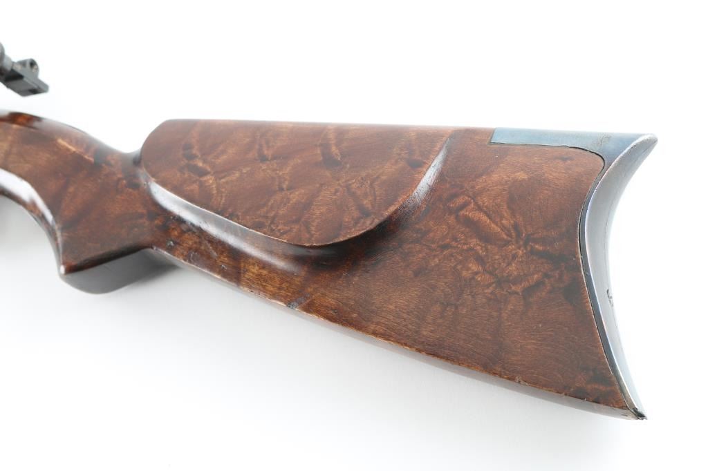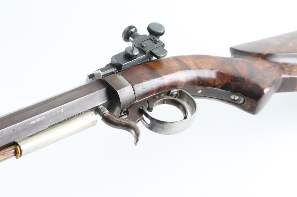 Custom single shot percussion rifle for black powder (or appropriate substitute) only. Features 32" heavy octagon barrel, dovetail blocks along top of barrel for mounting optics, hooded globe front sight, Redfield rear peep sight, ramrod under barrel, fancy figured dark wood butt stock with curved grip & right handed cheekpiece, steel crescent buttplate. Bore is good to very good. Barrel is browned, 90% coverage with scratches & edge losses. Wood is very good condition. Includes bullet mold, bullet swaging tool, small package of paper for patching bullets. Condition is NRA Very Good *** Antique Firearm ***