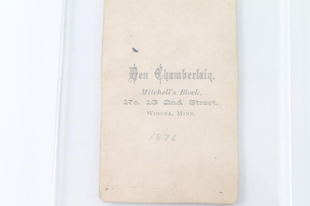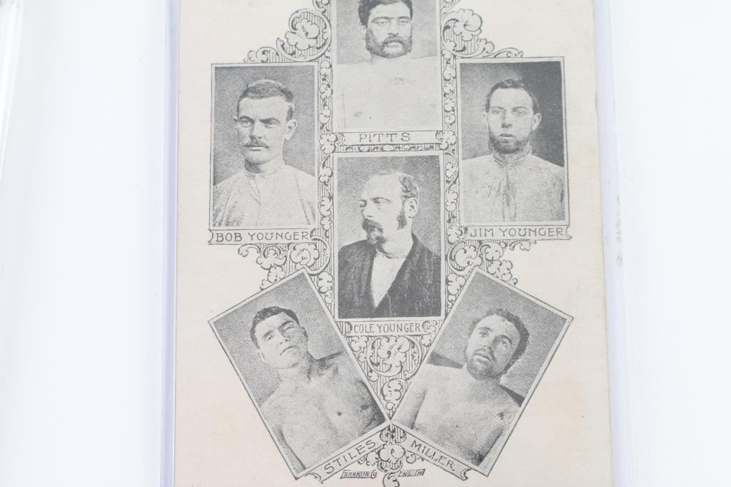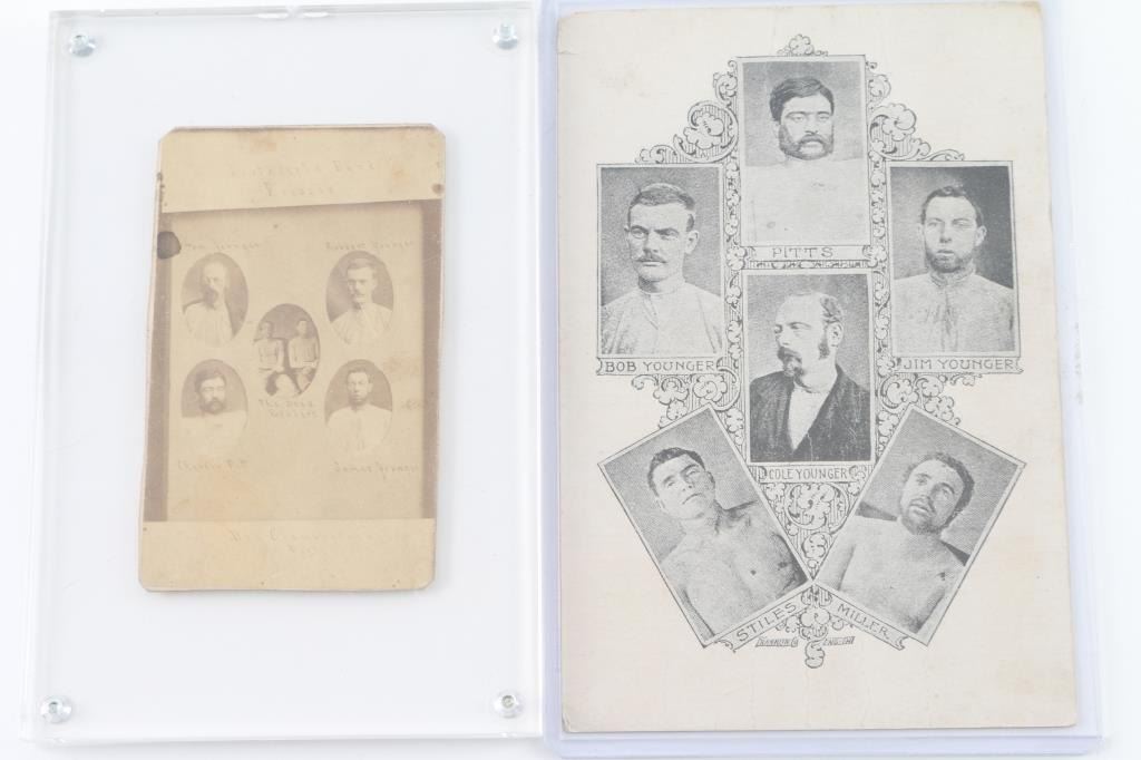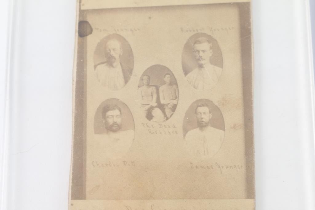 Five period images from negatives of younger gang. Charlie Pitts, Bob Younger, Jim Younger, Cole Younger, Stiles and Miller. Franklin + Co, Measures approx 6x4. In good condition with minor aging sealed in Lucite. Along with carte viste embossed on back. Den Chamberlain. Mitchell block. No.13 2nd street, Winona Minnesota. Penciled date 1876. ( Penned in block at top) The Northfield bank robbers. Two dead, and James Younger two weeks later after another shootout. Faded and stained card with light images but describe. From the James an Peggy Aplan collection.