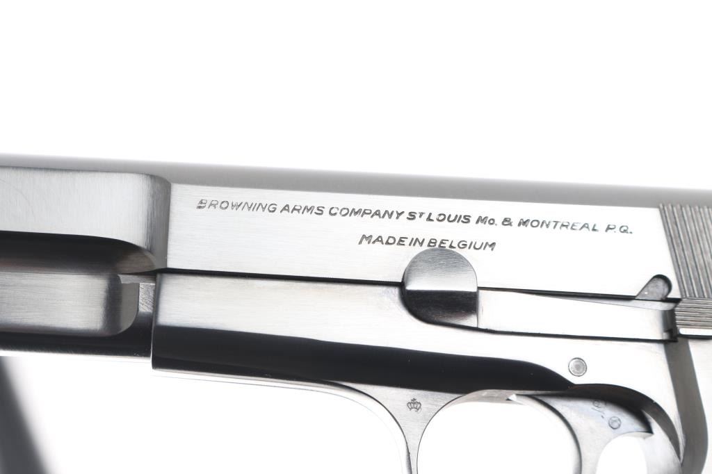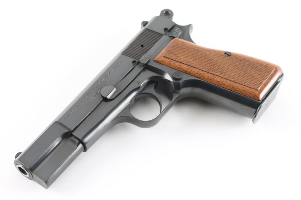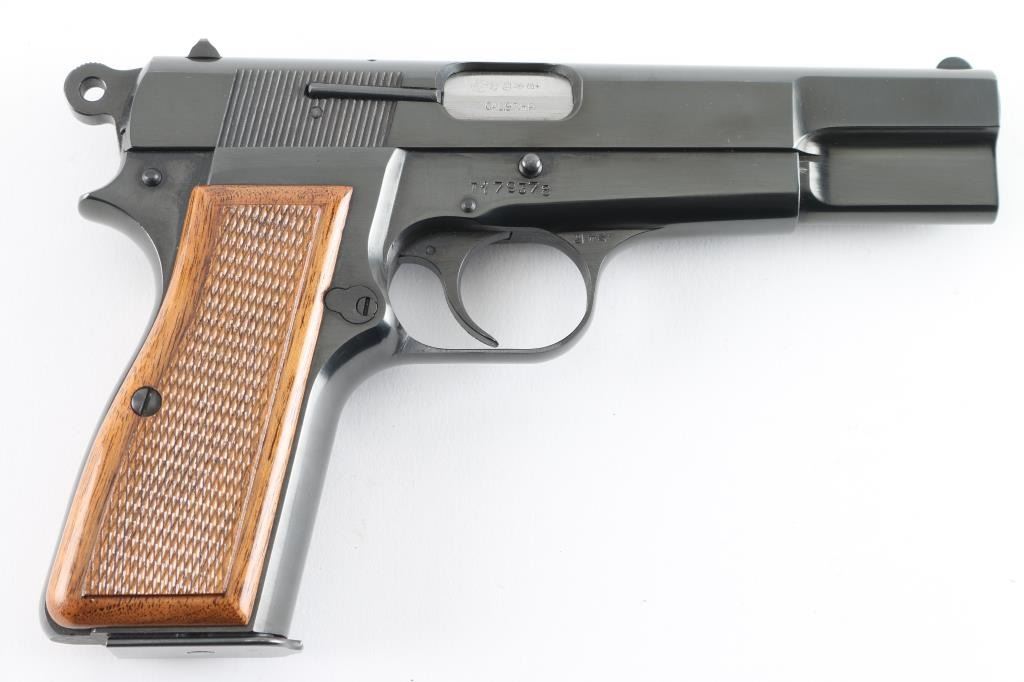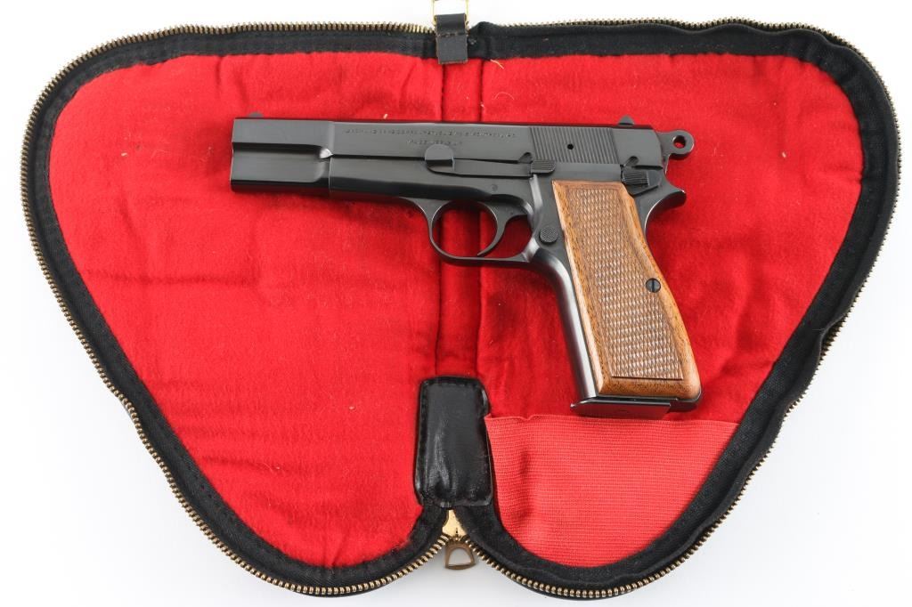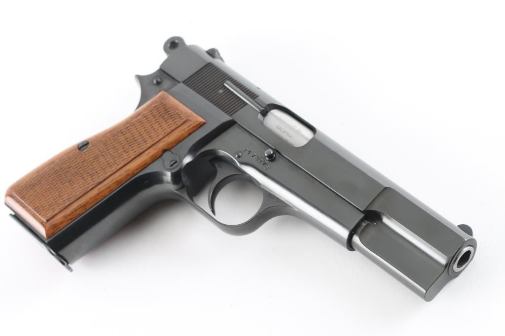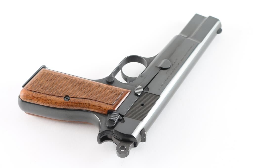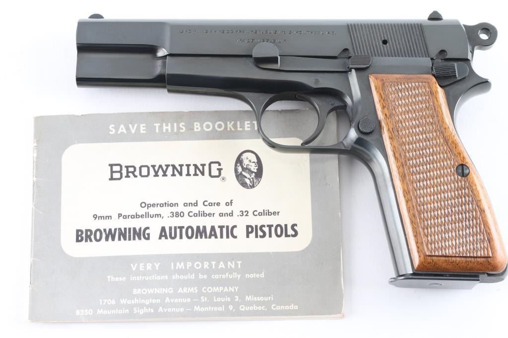 Desirable "T" series Belgian semiautomatic pistol chambered for 9x19mm Luger, manufactured circa 1967. Features 4.5" barrel, ring hammer, fixed sights, blued finish, checkered wood grips, single action trigger, frame mounted manual safety, magazine disconnect safety. Bore is very good condition. Overall condition is like new with few minor blemishes, retaining approx 98% finish. Includes (1) magazine, Browning pistol boot & manual. Condition is NRA Excellent - like new *** C&R Firearm ***