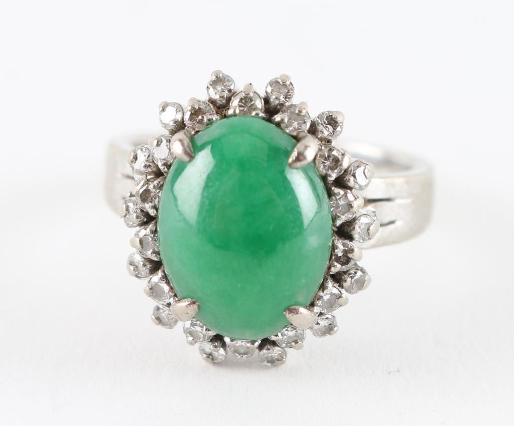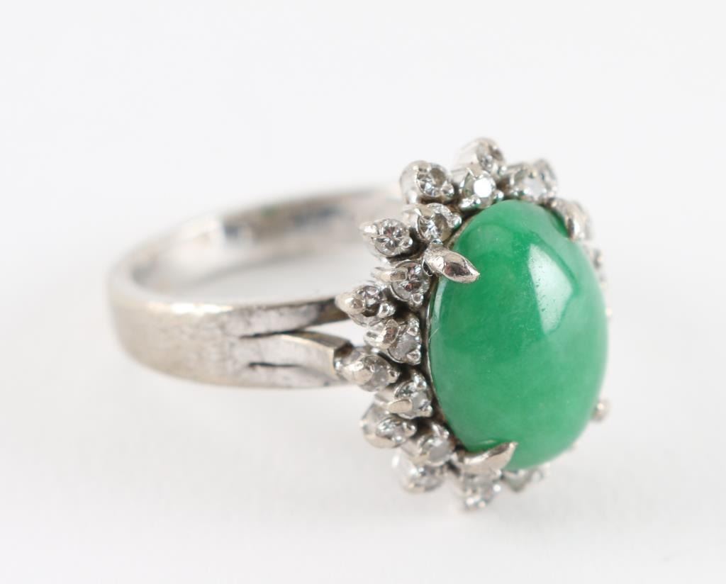 Cabochon cut jade stone surrounded by 28 single point diamonds set in 14K white gold, size 7. Outside shank of ring shows some scuffing due to age.